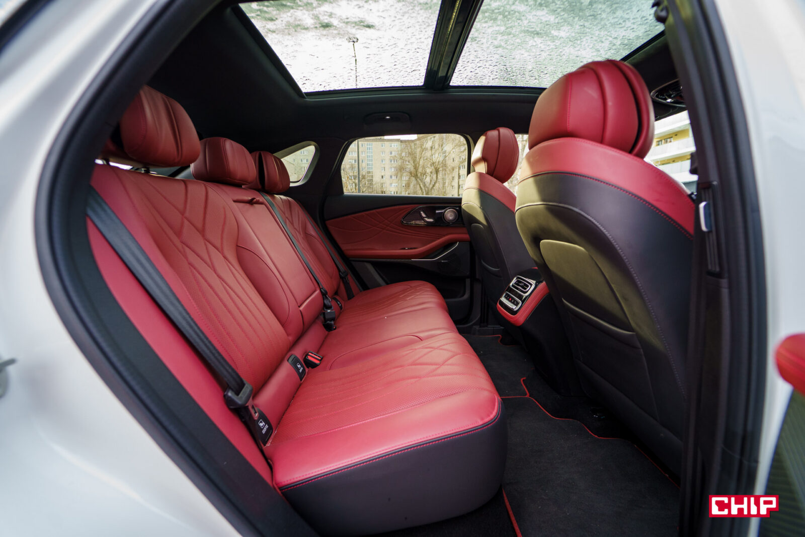 Tylna kanapa jest bardzo wygodna. Mamy dużo miejsca na nogi, całkiem sporo nad głową, a dodatkowo nad nami może się roztaczać widok z panoramicznego dachu, który jest tu dostępny w standardzie. Co więcej, z perspektywy pasażera na tylnej kanapie podróżowało mi się o wiele wygodniej niż z przodu, ale o tym za moment.