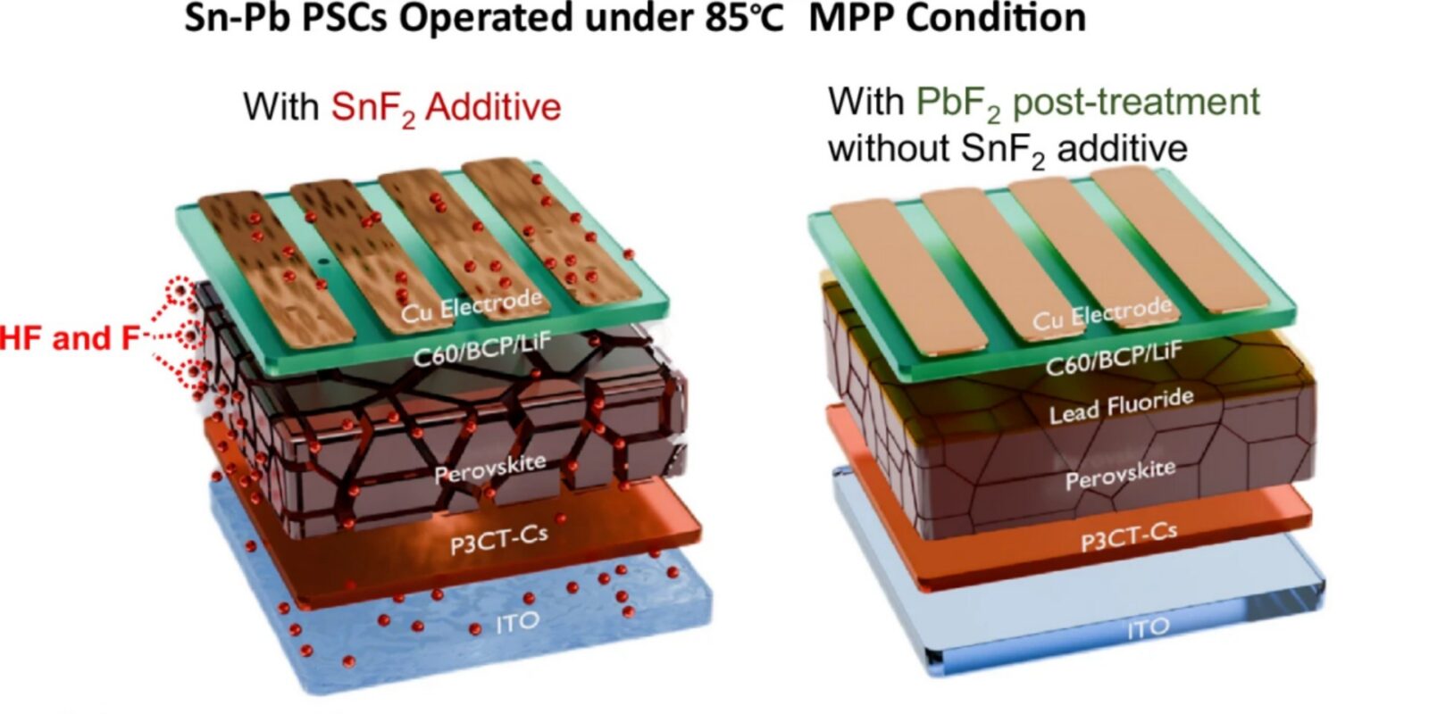 Reakcje były na tyle agresywne, że dochodziło do uszkodzenia elektrod miedzianych oraz warstwy ITO nawet w temperaturze pokojowej i bez działania światła. Naukowcy opracowali więc alternatywną metodę, która całkowicie rezygnuje z SnF2. Zastosowali proszek ołowiu w roli antyoksydanta regulującego krystalizację, a na koniec procesu dodali fluorek ołowiu (PbF2) do pasywacji defektów na powierzchni materiału.