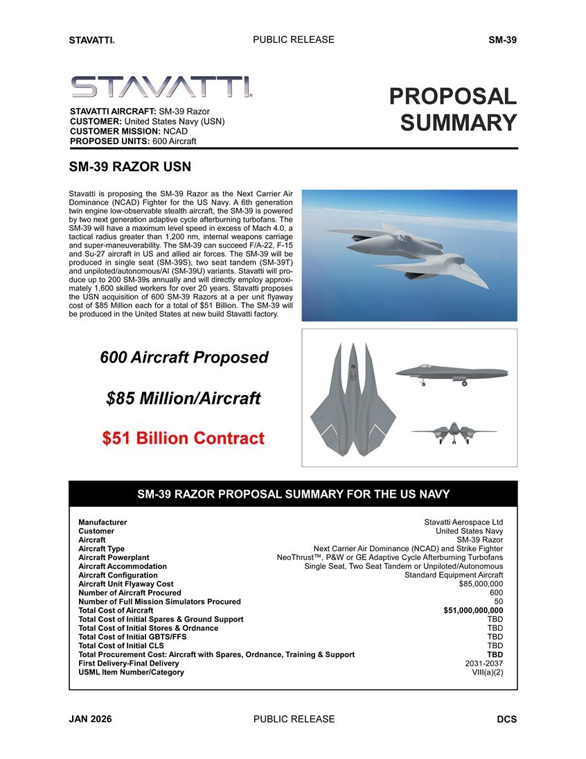 Marynarka Wojenna Stanów Zjednoczonych już dawno zawęziła pole walki o kontrakt na następcę swoich myśliwców pokładowych do dwóch doświadczonych gigantów. Firma Stavatti musi więc udowodnić nie tylko, że jej samolot może latać tak szybko i daleko, ale także że przetrwa surowe warunki operowania z pokładu lotniskowca, czyli katapultowanie, lądowanie na hamulcu i ciasne hangary. Cena około 85 milionów dolarów za egzemplarz, przy jednoczesnym zapewnieniu tak zaawansowanych technologii i materiałów koniecznych do wytrzymania prędkości Mach 4, wydaje się mocno naciągana, zwłaszcza gdy porówna się ją z kosztem obecnych, znacznie mniej skomplikowanych maszyn.