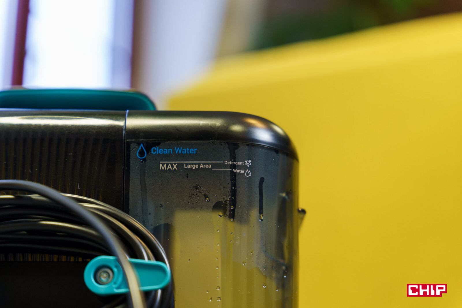 Sprzątanie zaczynamy od nalania wody do pojemnika na wodę czystą, o pojemności 2,3 litra. Ma on narysowane dwie podziałki – do sprzątania większego i mniejszego z zaznaczeniem, do której linii należy wlać wodę, a do której dolać detergentu.