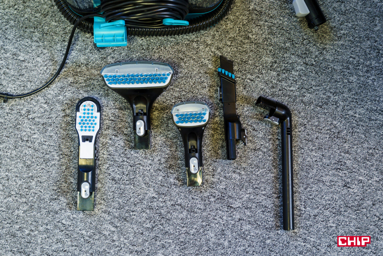Następnie wybieramy szczotkę. Do dyspozycji mamy szczotkę największą o szerokości 15 cm, mniejszą o szerokości 8 cm, szczotkę do butów oraz szczotkę szczelinową. Każda z nich ma otwór do dozowania wody i jej strumień ma mniej więcej szerokość samej szczotki.