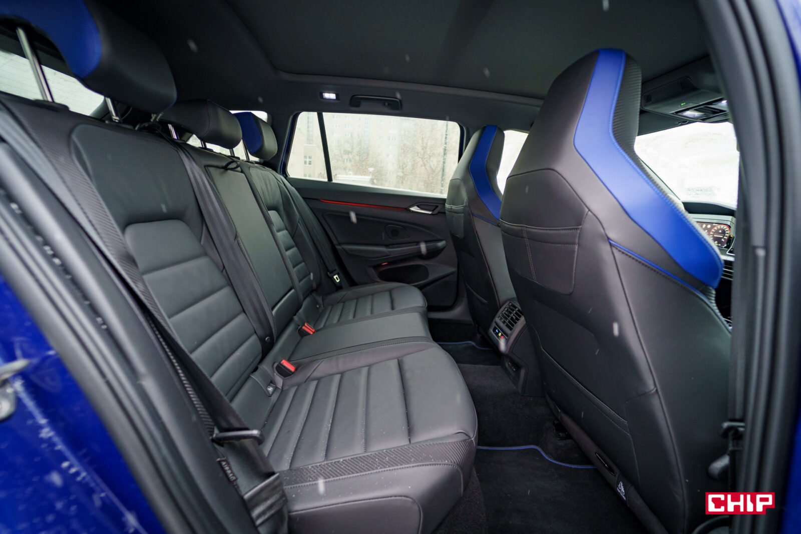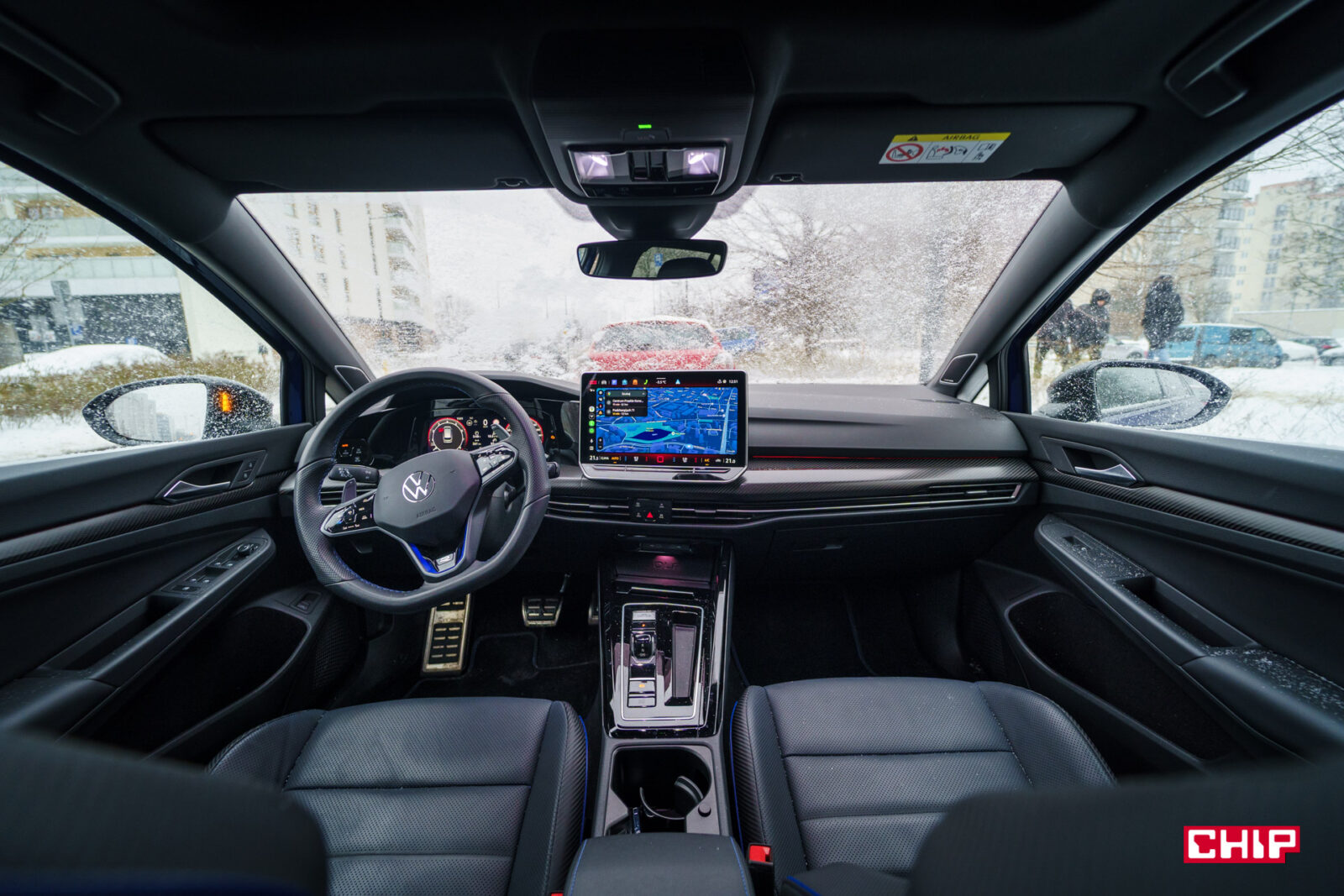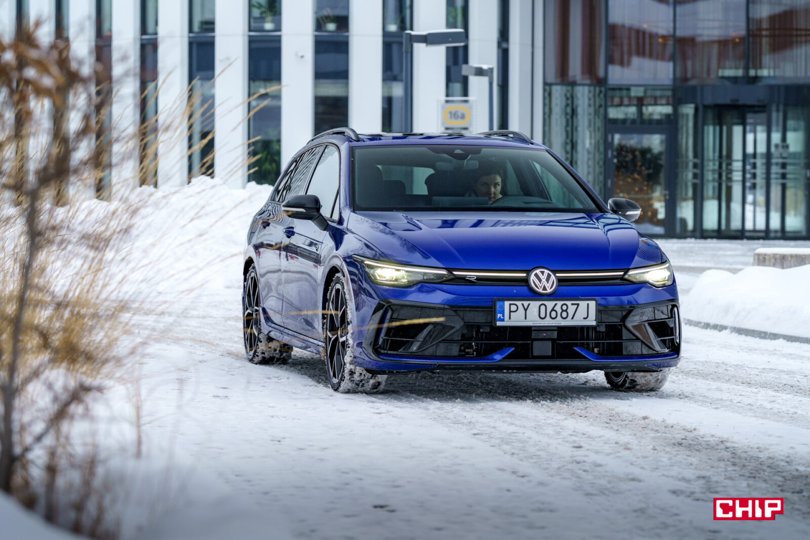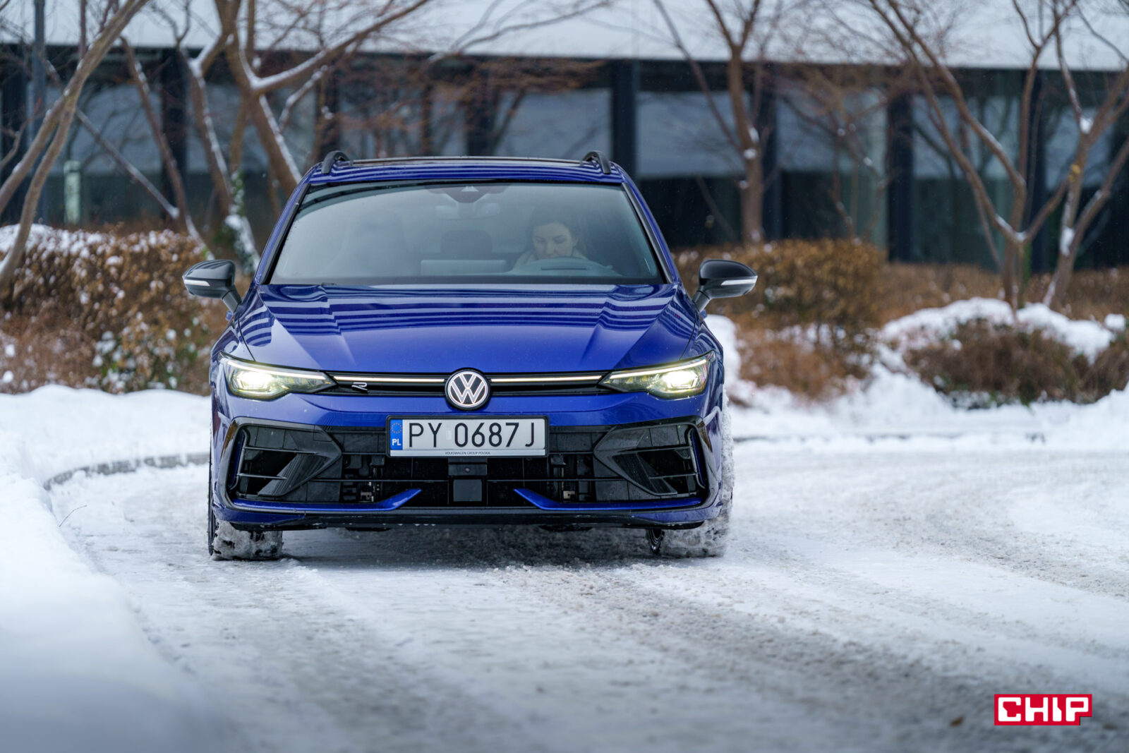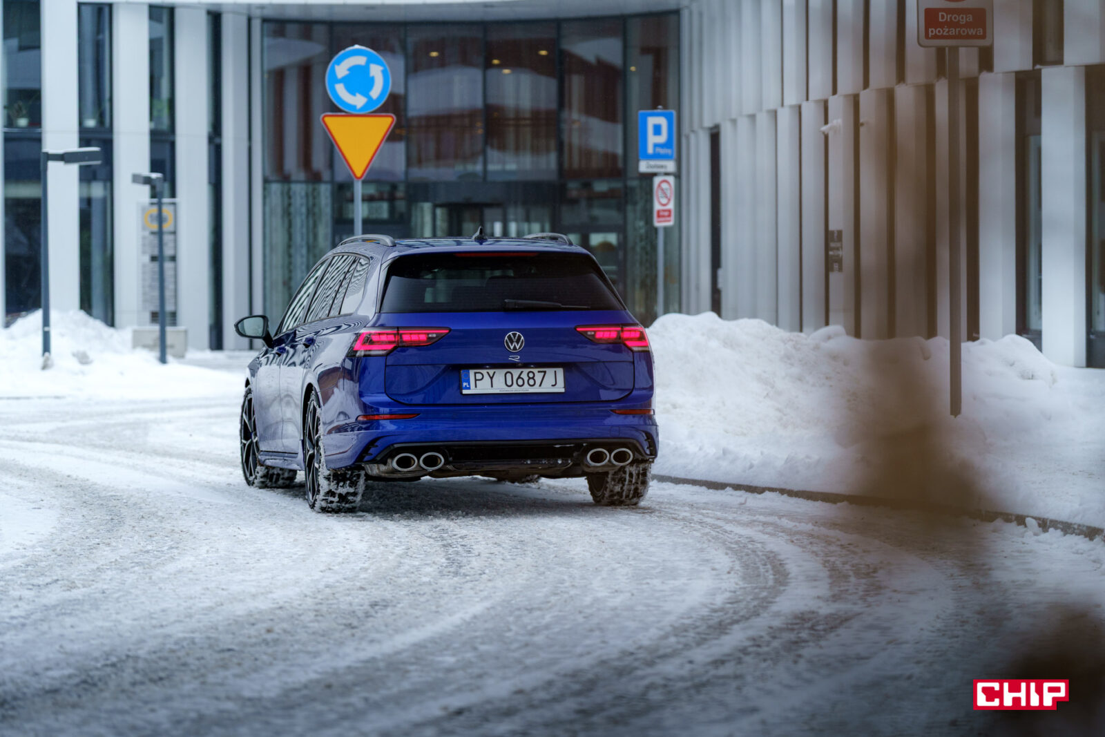Tak naprawdę powinnam się cieszyć, że test przypadł na tak parszywą pogodę, bo pozwolił nam sprawdzić, jak nasze sportowe kombi zachowuje się w warunkach, które są znacznie bardziej wymagające, niż nagrzany, letni asfalt. Auto było nie tylko cholernie stabilne, pozwalało też na jazdę z fantazją, oczywiście w granicach rozsądku – pamiętajmy, że na gołym lodzie nawet tak zaawansowane systemy jak 4MOTION mają swoje granice, w szczególności przy narowistości tej konstrukcji. Niemniej jednak, jeżeli nie pomylicie fantazji z lekkomyślnością, jazda Golfem R będzie czystą przyjemnością. W standardzie otrzymacie dwusprzęgłową, 7-stoopniową skrzynię znaną z innych modeli, ale tutaj została ona dostrojona do momentu obrotowego variantu R, aby pozwalać na bardziej dynamiczną jazdę. Adaptacyjne zawieszenie z możliwością wyboru profilu jazdy chwaliłam do znudzenia podczas innych testów, więc nie będę się powtarzać, ale warto zaznaczyć, że tak, można je dokupić i naprawdę warto to zrobić.