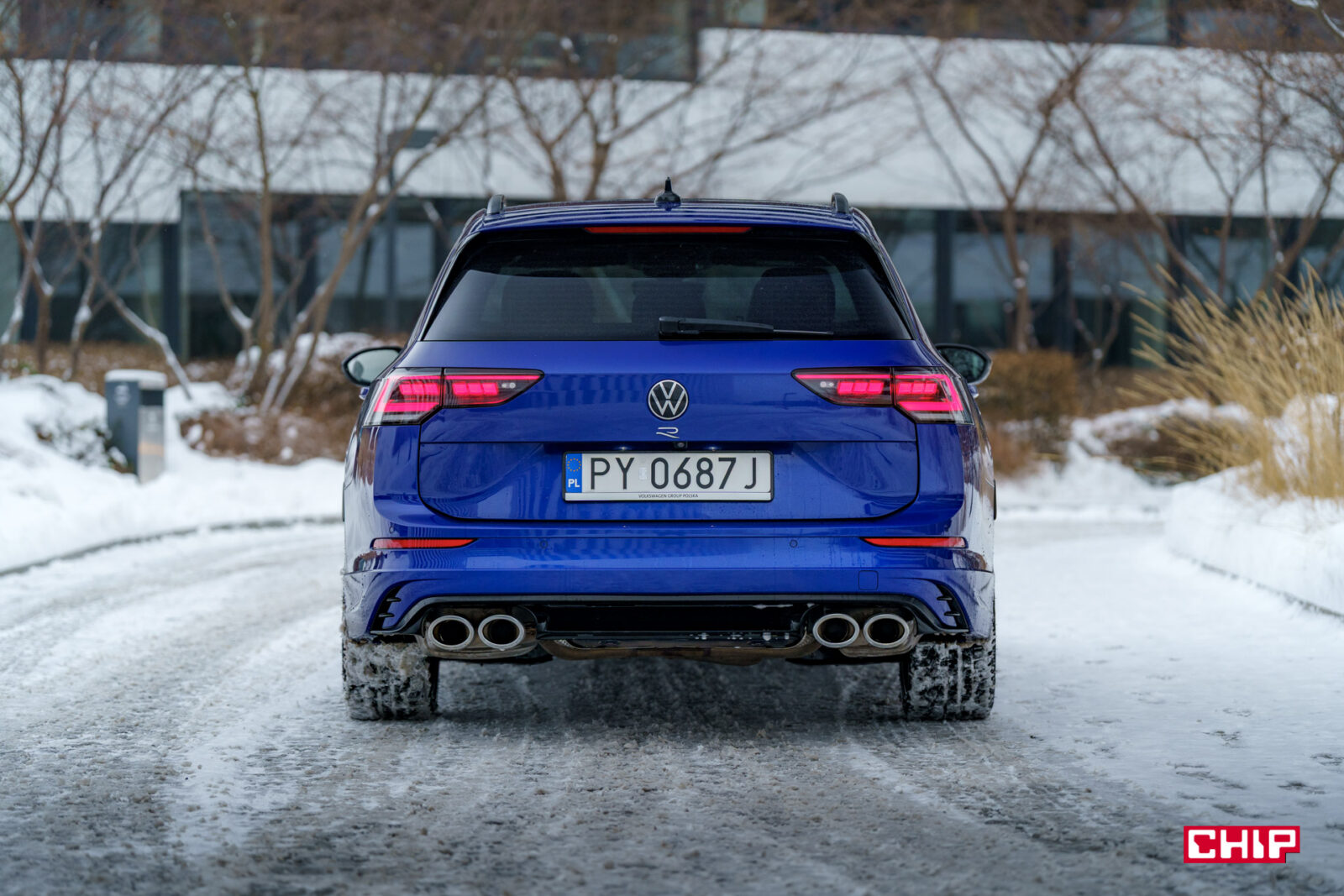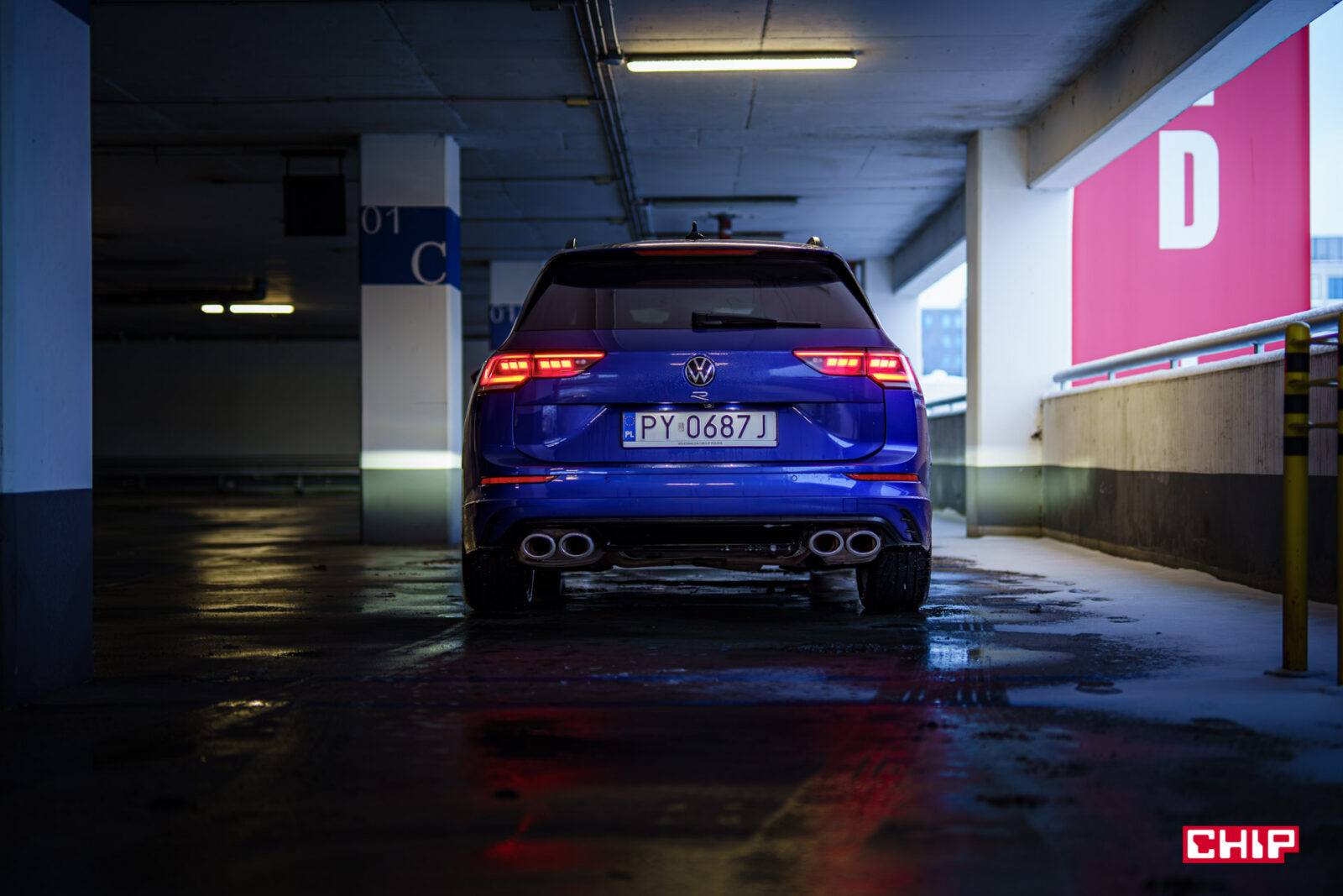 Z tyłu da się zauważyć niewielki spoiler osłaniający szybę, ale dopiero po pewnym czasie, bo tutaj wzrok skutecznie przyciągają duże, dwie podwójne końcówki wydechów, które kradną całą uwagę. Trzeba też pochwalić efektowne, ładnie wkomponowane światła. Zdecydowanie Volkswagen Golf Variant R to ładne auto, nie tylko ładne jak na kombi.