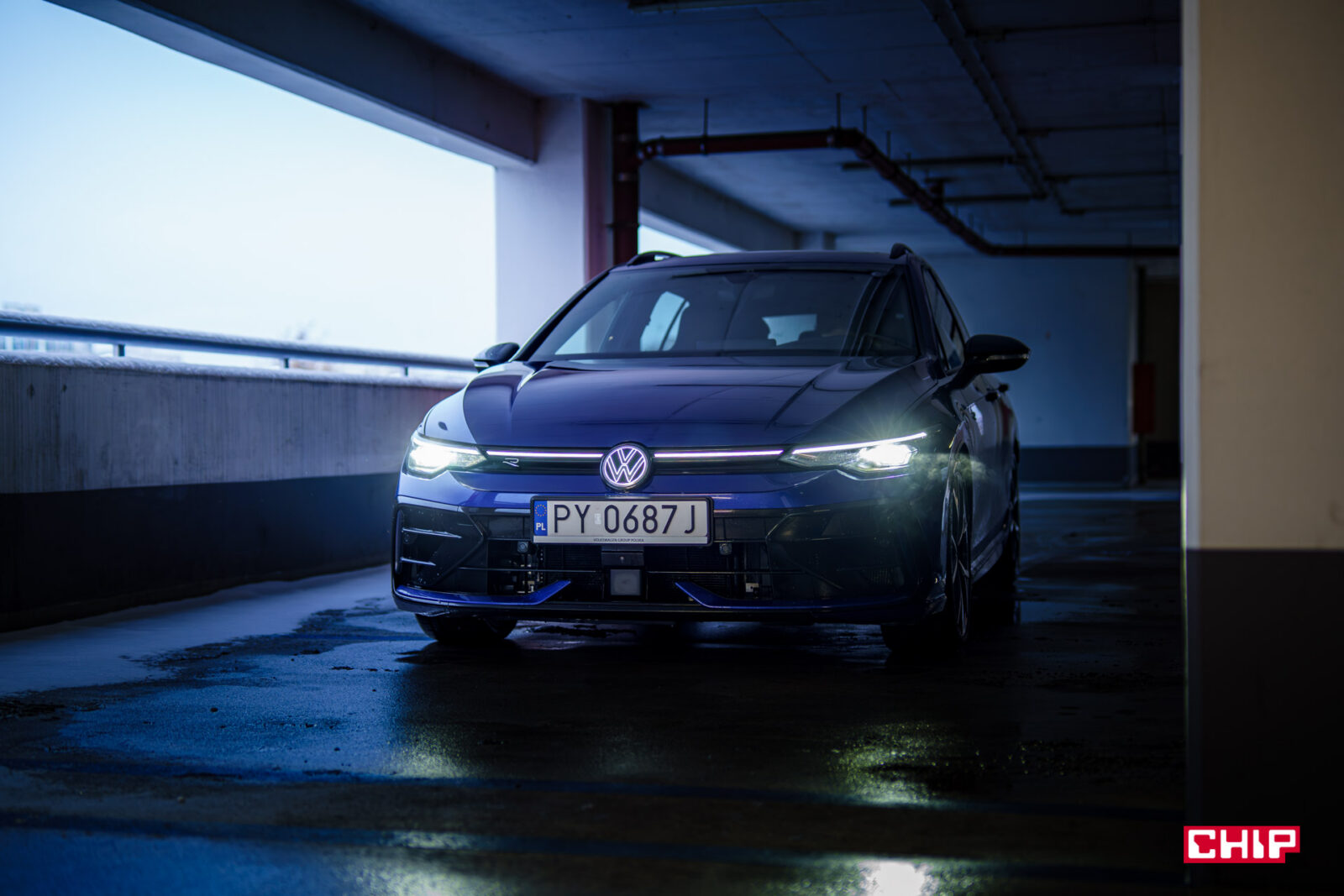 Volkswagen Golf Variant R z daleka pokazuje, że nie jest potulny barankiem. Z przodu mamy agresywne wloty powietrza, a wzrok przyciąga też mocno opadająca, wręcz nieco spiczasta maska oraz to nieszczęsne podświetlane logo. Nie jestem fanem podświetlania samych krawędzi logotypu i to, szczególnie po ciemku, wygląda jak chałupniczo przyklejone paski LED.