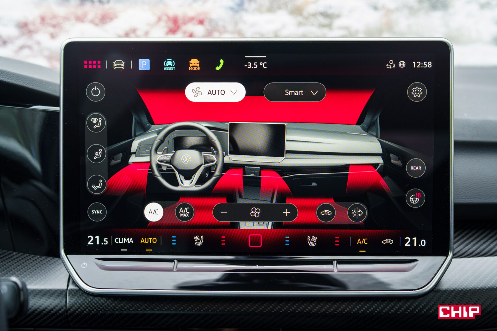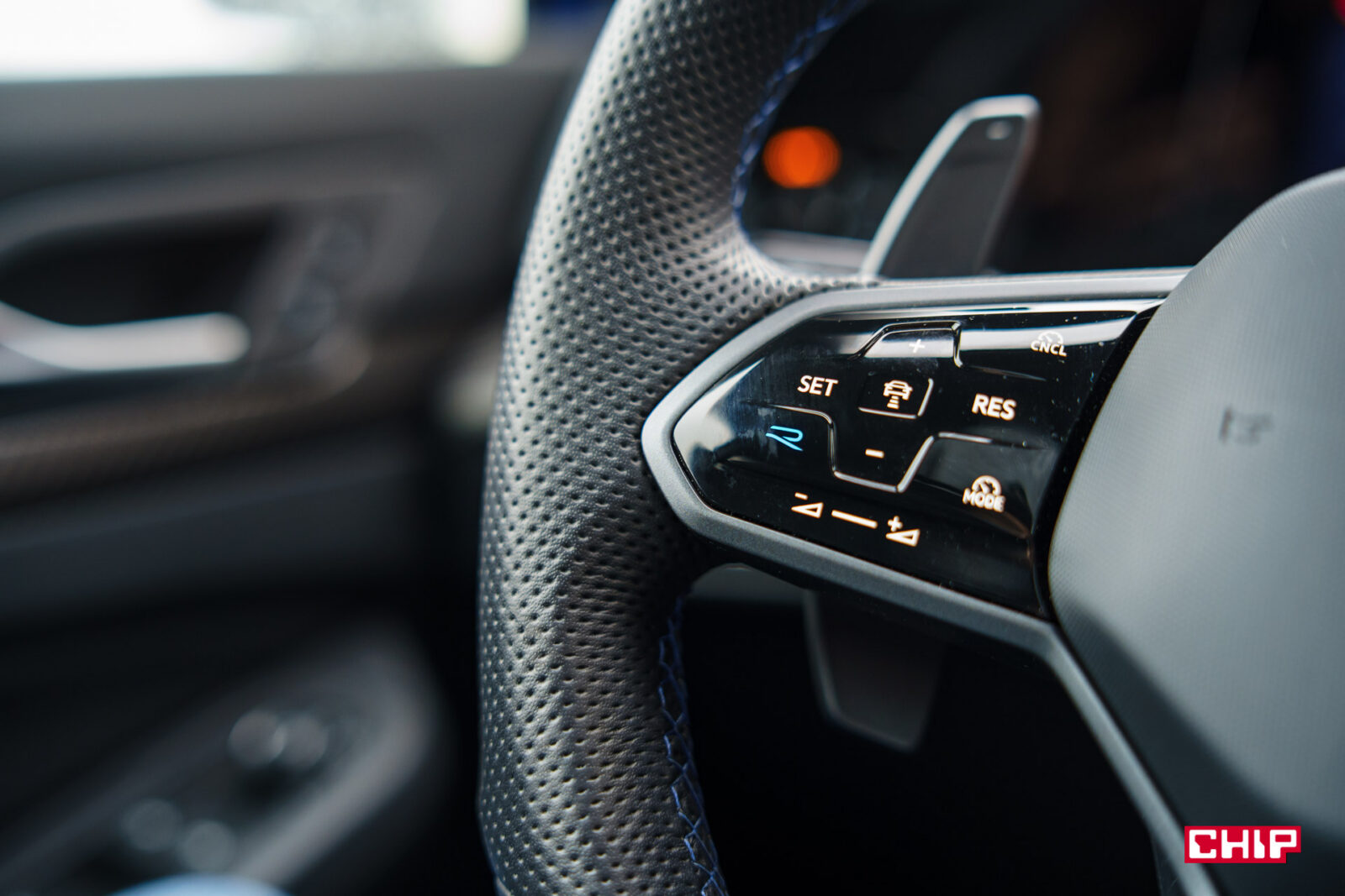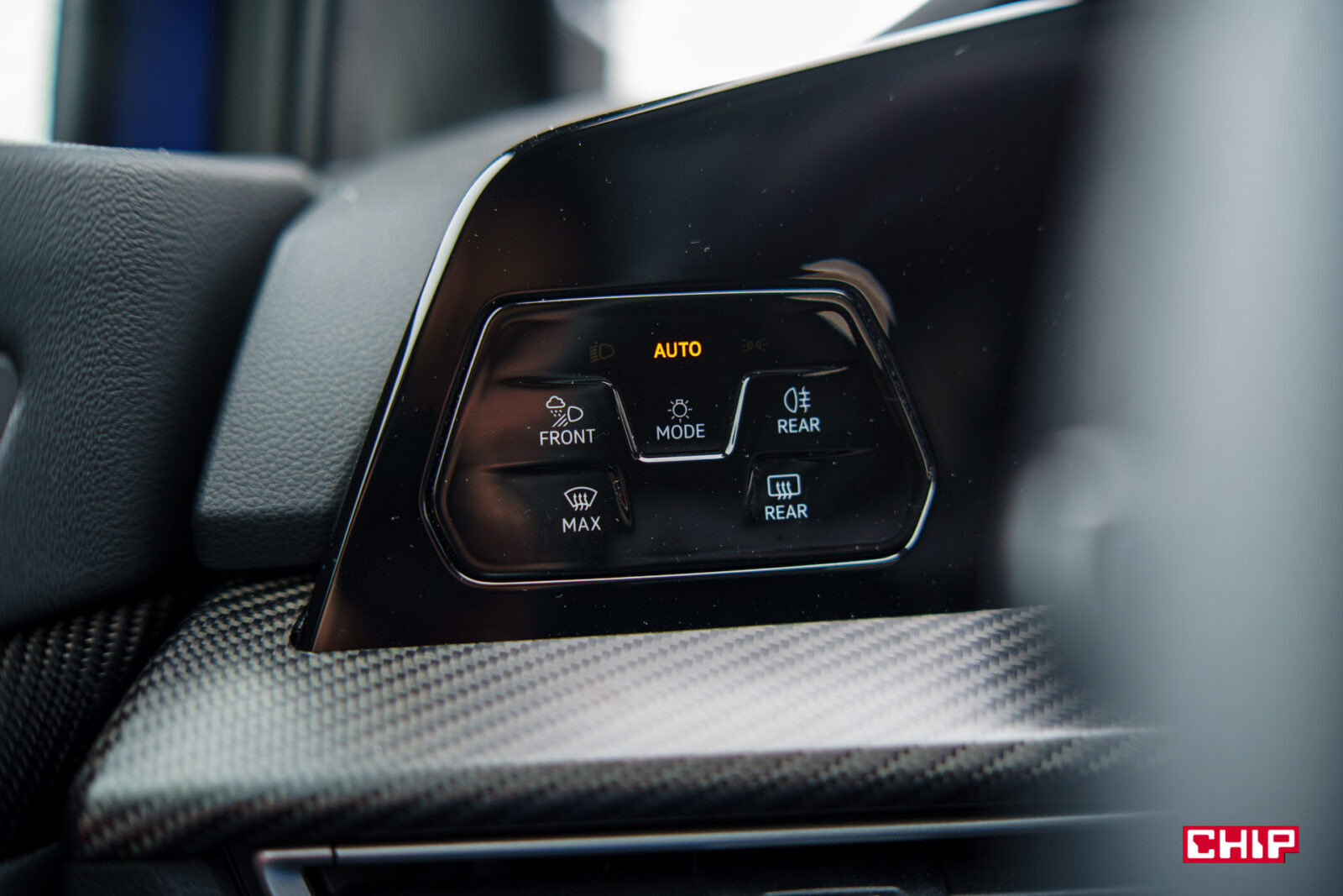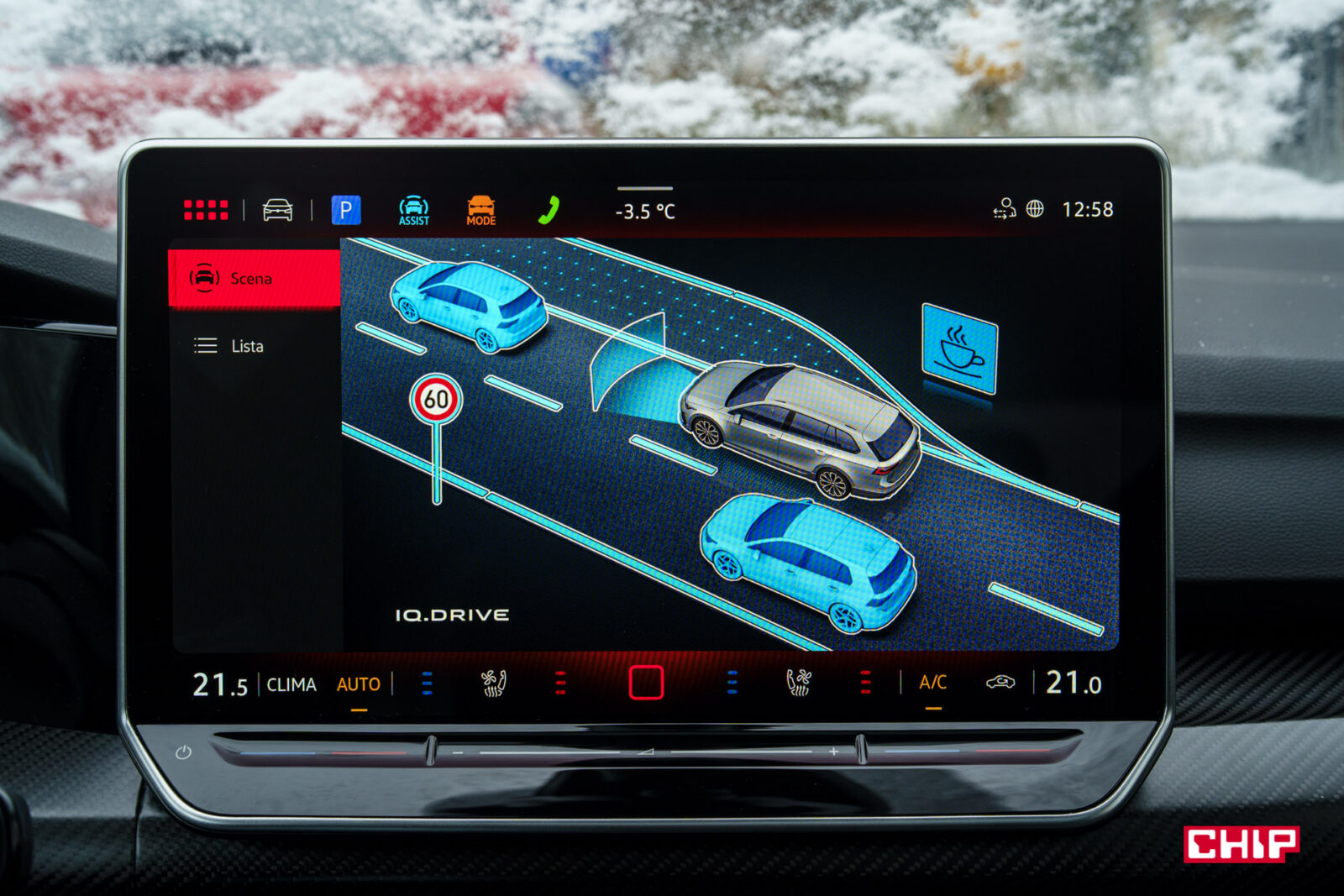 Jak już wspominałem, wnętrza Golfa Variant R to jeszcze wersja dotykowa. Z haptycznymi przyciskami na kierownicy oraz sterowaniem klimatyzacją za pomocą pól pod ekranem, które są tutaj podświetlane.