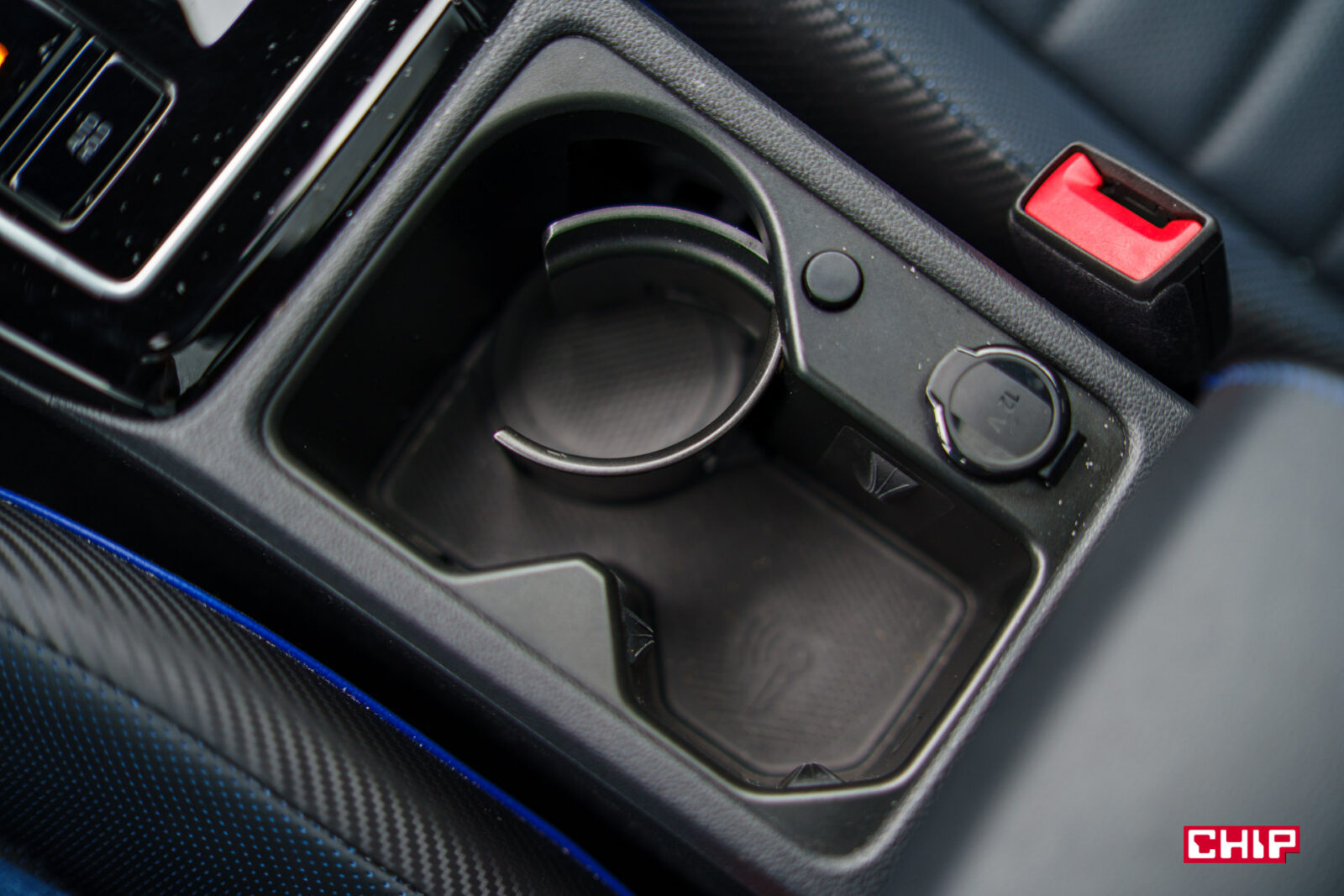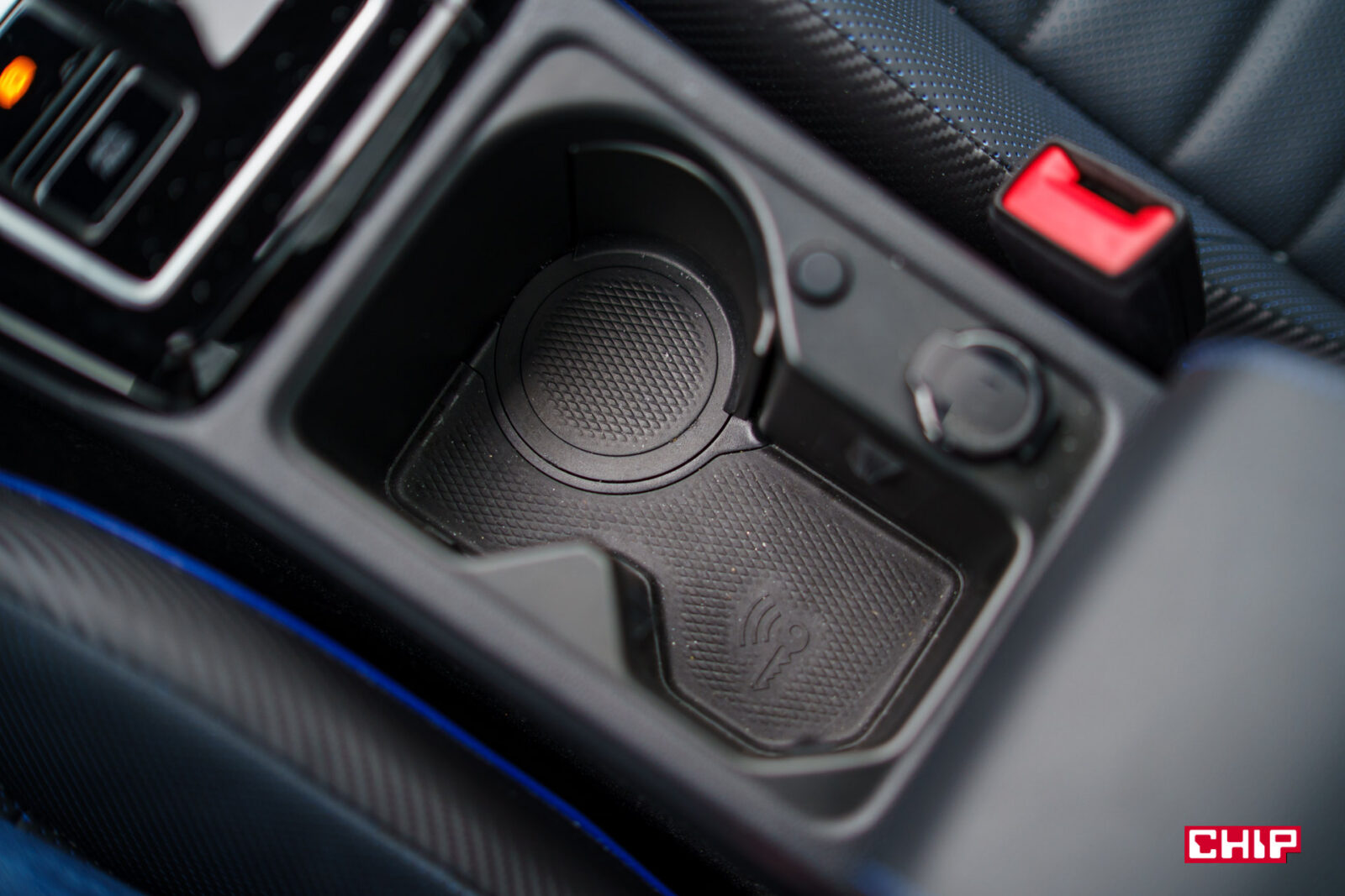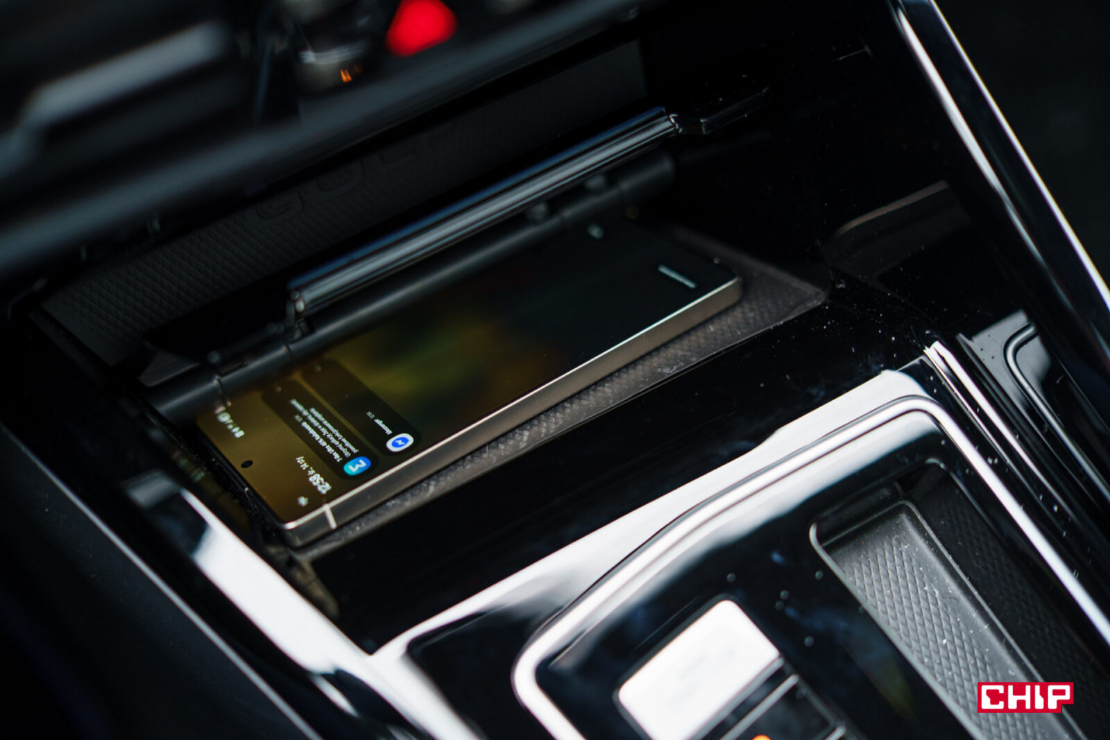 Mamy tu również dwa rozwiązania modułowe. Czyli rozkładany uchwyt na napoje na konsoli środkowej oraz ładowarkę indukcyjną z zamknięciem, dzięki czemu po włożeniu do niej smartfonu dostajemy dodatkową półkę, a sam smartfon nie przesuwa się w trakcie jazdy. Wydawało mi się, że ładowarka jest mała, ale skoro wszedł tam Galaxy S25 Ultra to zmieści się tam praktycznie każdy smartfon.