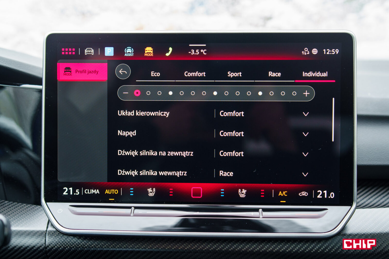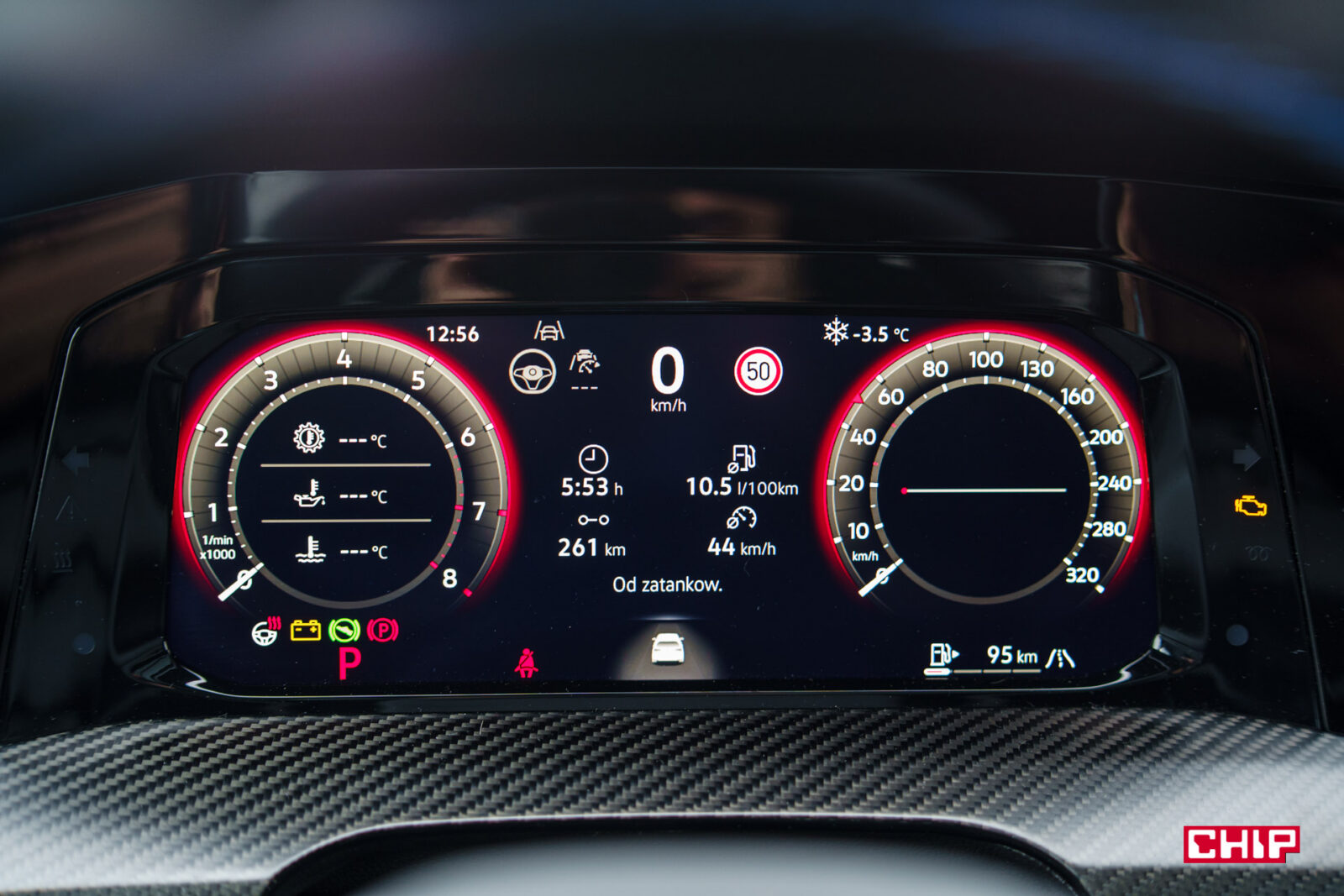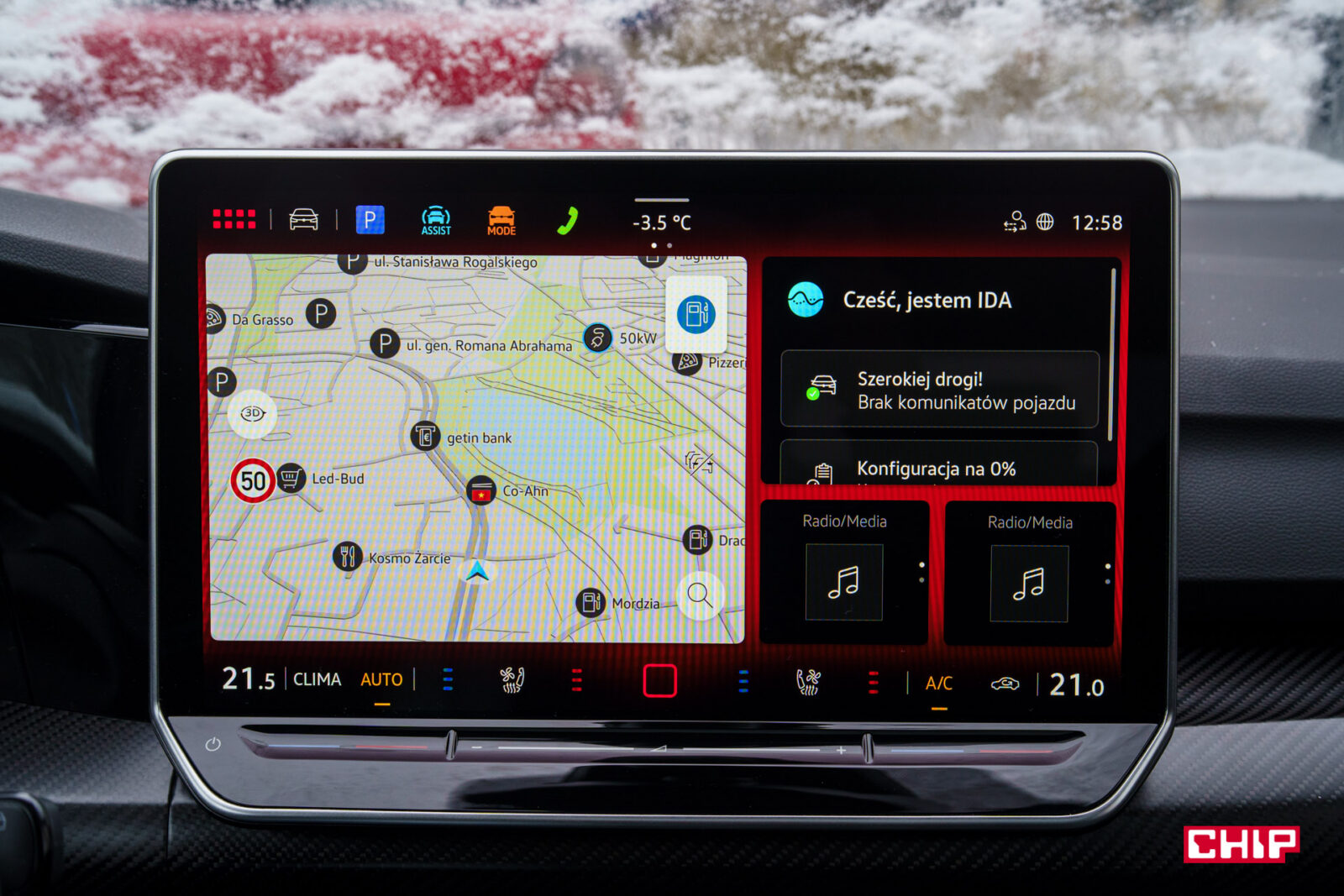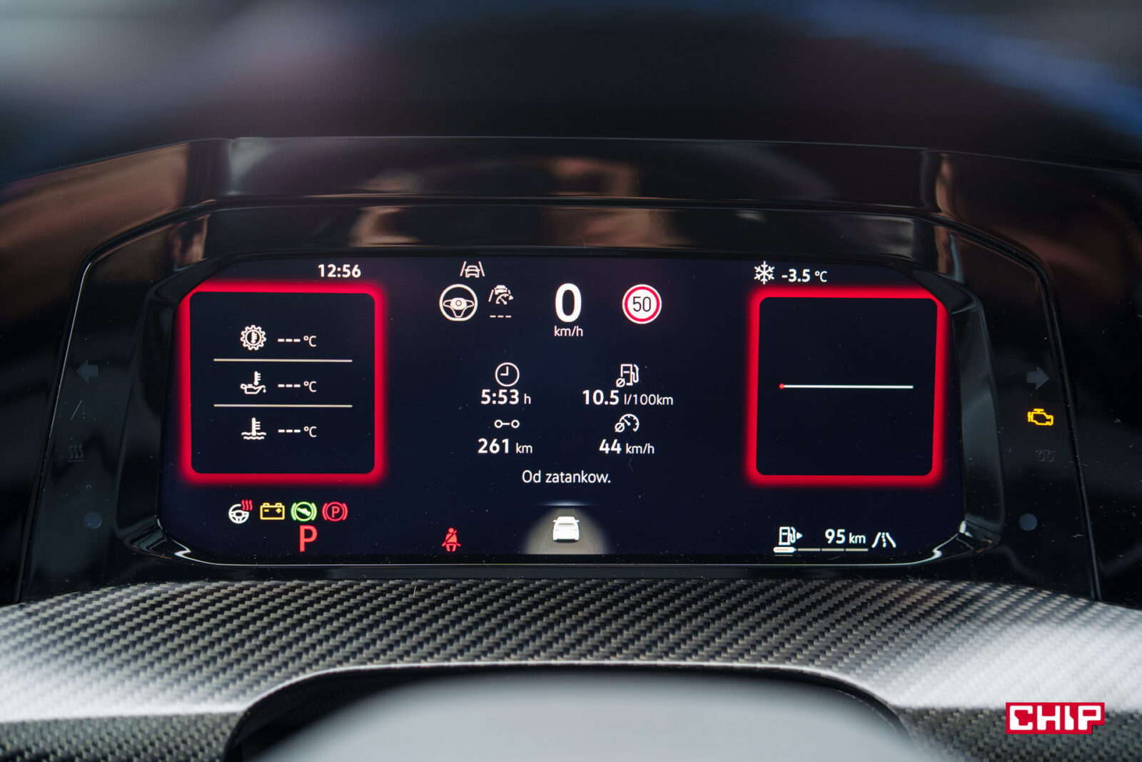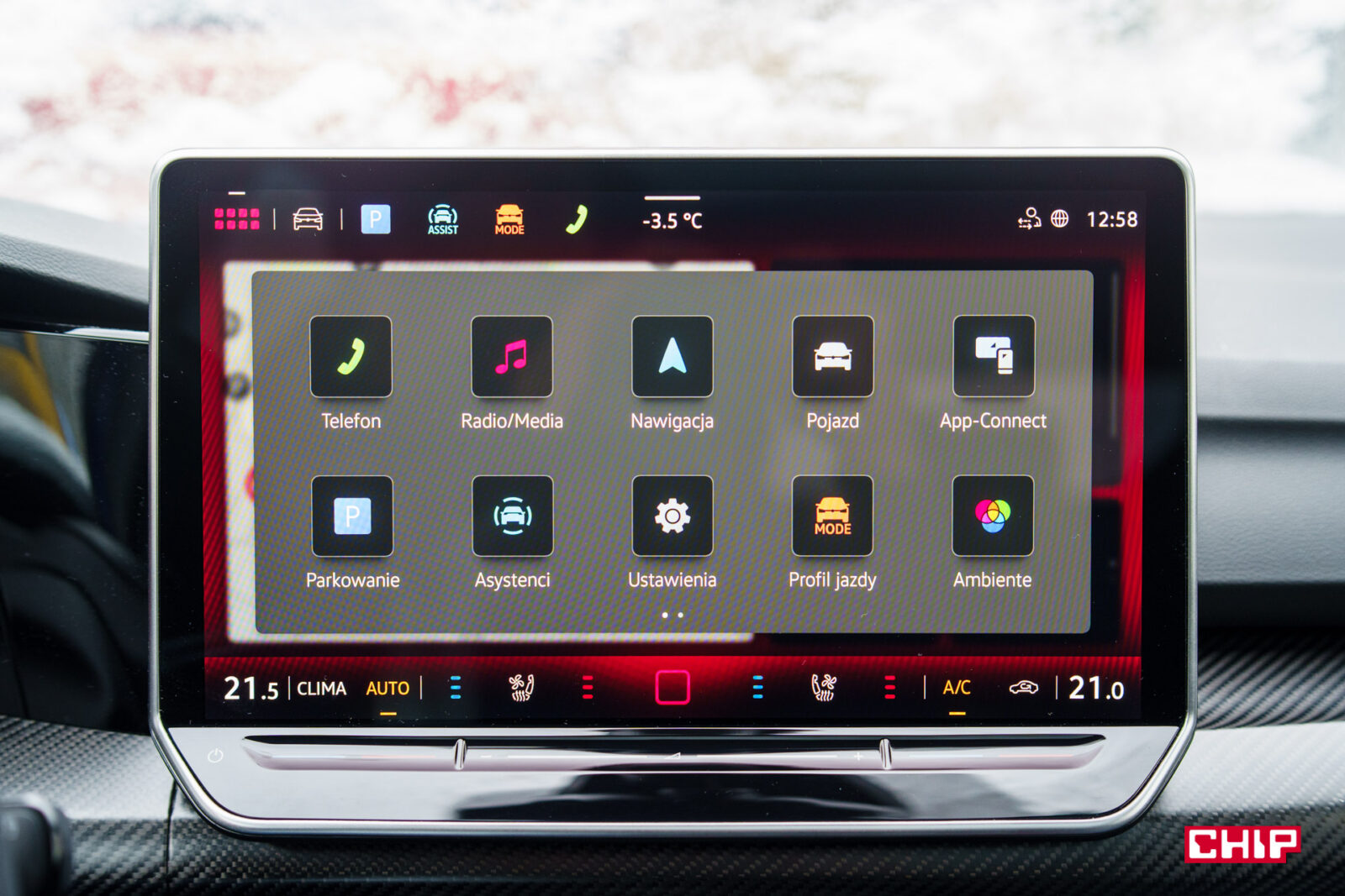 Ekran kierowcy ma przekątną 10,2 cala. Jest on niestety mocno obudowany błyszczącym plastikiem, co nieco go optycznie zmniejsza. Do dyspozycji mamy cztery warianty zegarów – klasyczne okrągłe, mocno cyfrowe oraz sportowe w wersji okrągłej lub z obrotami wyświetlanymi na poziomej skali. To zdecydowanie najbardziej efektowny wariant.