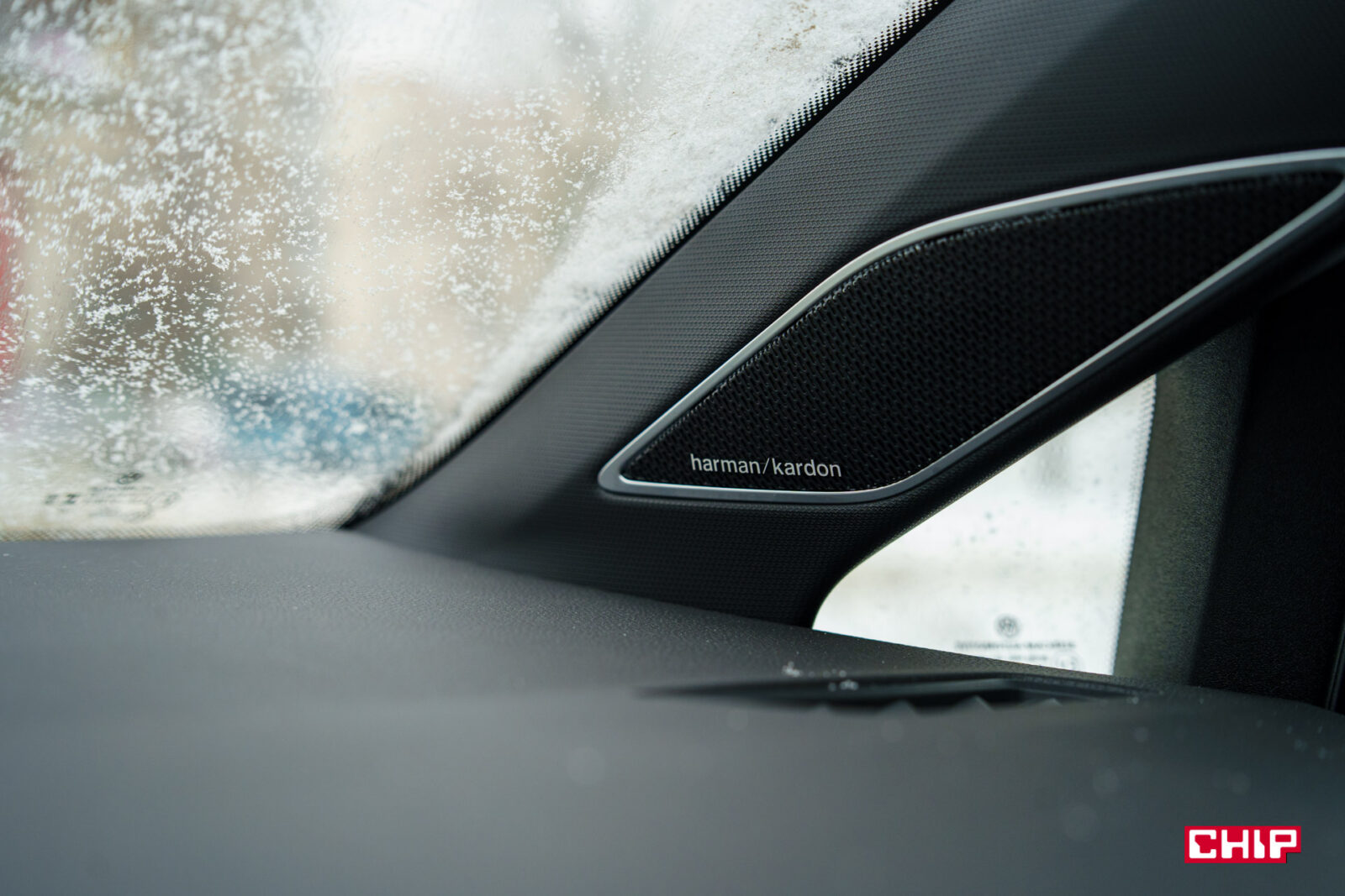 System kamer 360, choć może tego na zdjęciach nie widać przez padający śnieg, jest bardzo dobrej jakości. Oferuje wygodną i użyteczną perspektywę oraz czytelny obraz nawet w trudnych warunkach oświetleniowych. Najbardziej wypasiony wariant nagłośnienia składa się z 9 głośników, subwoofera i 12-kanałowego wzmacniacza o mocy 480 W. Dźwięk jest dobrej jakości, opcjonalnie bardzo przestrzenny, ale jeśli ktoś woli bardziej skupione brzmienie to wszystko można dostosować w rozbudowanej sekcji ustawień.