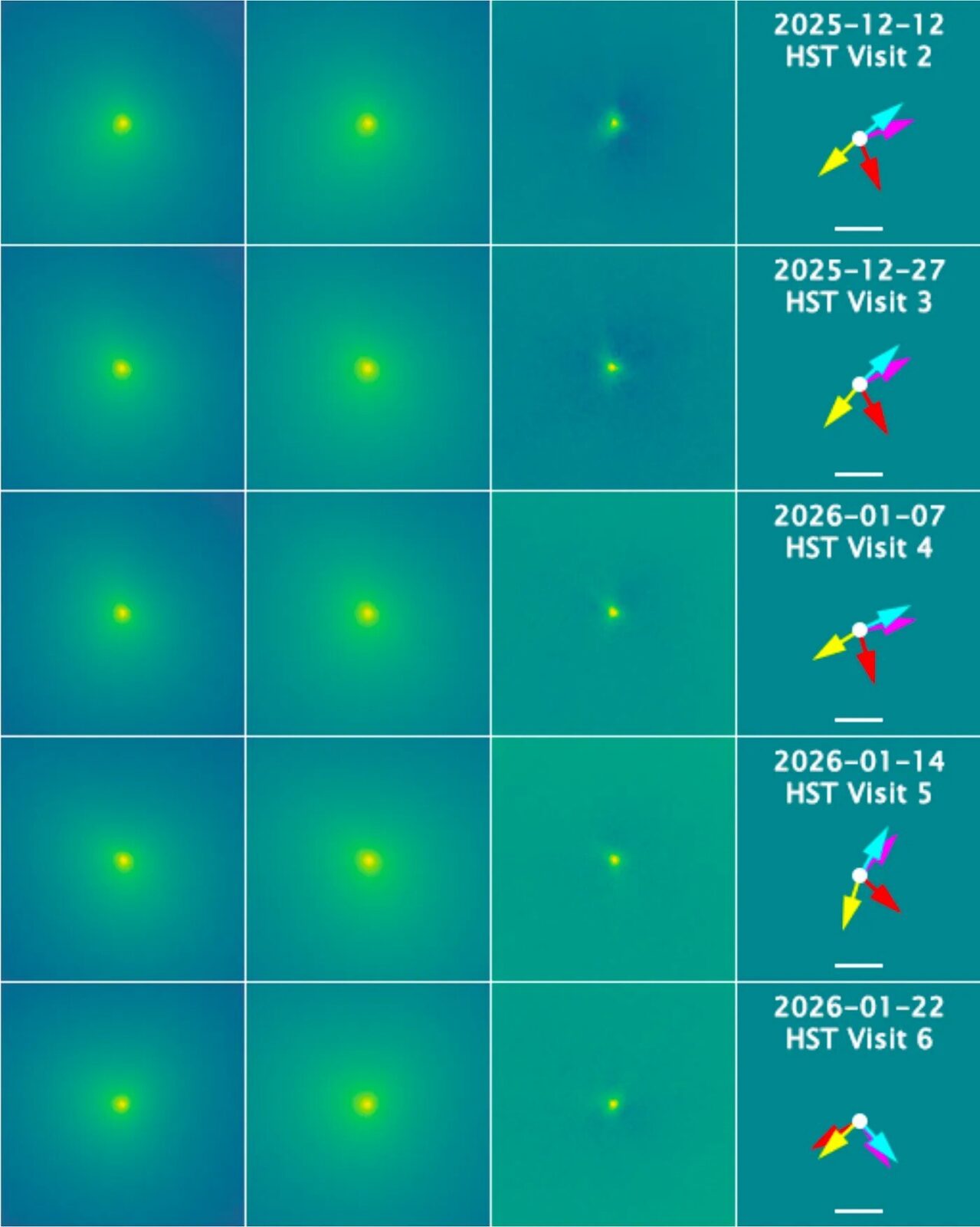 Pierwszą szczegółową analizę spektroskopową po przelocie obok Słońca teleskop Webba przeprowadził w połowie i pod koniec grudnia zeszłego roku. Instrument MIRI wykrył w otoczce obiektu sygnatury wody, dwutlenku węgla, tlenku węgla, niklu oraz, co najbardziej zaskakujące, metanu. Same detekcje nie są niespodzianką, lecz dynamika zmian pomiędzy dwiema sesjami obserwacyjnymi już tak. W ciągu zaledwie dwunastu dni ogólny poziom aktywności, czyli tempo uwalniania gazu i pyłu, znacząco spadł. Co ciekawe, aktywność związana z wodą malała najszybciej ze wszystkich wykrytych substancji. Ta nierównomierna utrata „energii” może świadczyć o złożonej, warstwowej budowie jądra lub o niejednorodnym rozmieszczeniu różnych rodzajów lodu na jego powierzchni.