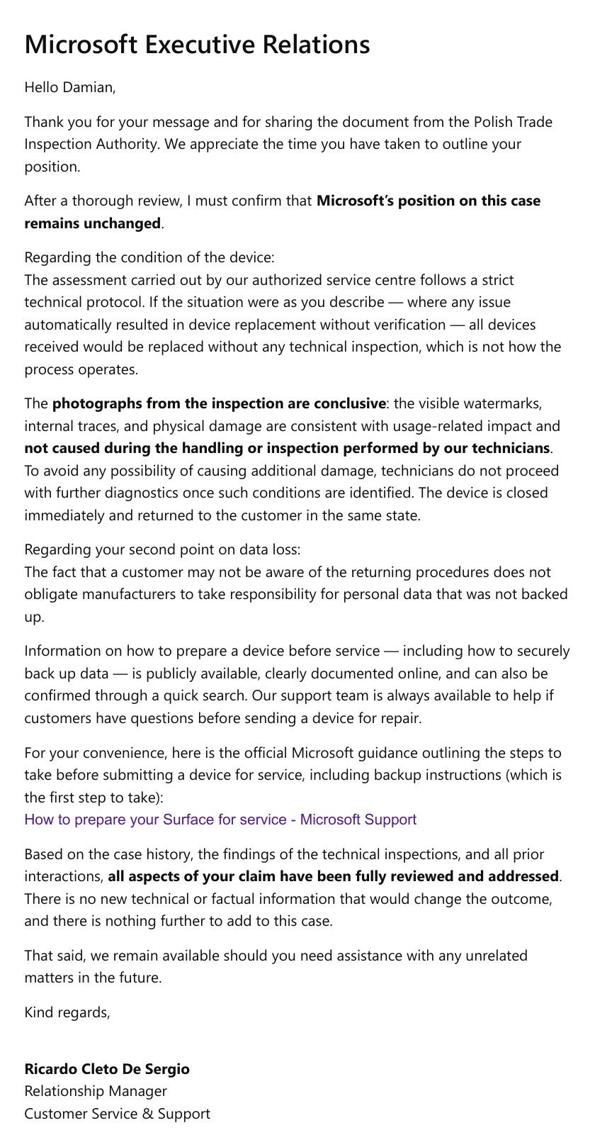 Formatowanie dysku akurat mnie nie dziwi – to praktyka chyba wszystkich serwisów, nie tylko Microsoftu, że zastrzegają sobie prawo do wyczyszczenia nośnika i preinstalacji czystego oprogramowania i zwykle w zgłoszeniu serwisowym gdzieś znajduje się zapis drobnym drukiem, że się na to zgadzamy. W niektórych serwisach można sobie przy tym wykupić dodatkową usługę backupu danych albo zastrzec sobie, że nie wyrażamy zgody na takie działanie. To jednak jest w sprawie naszego czytelnika chyba najmniej ważne.