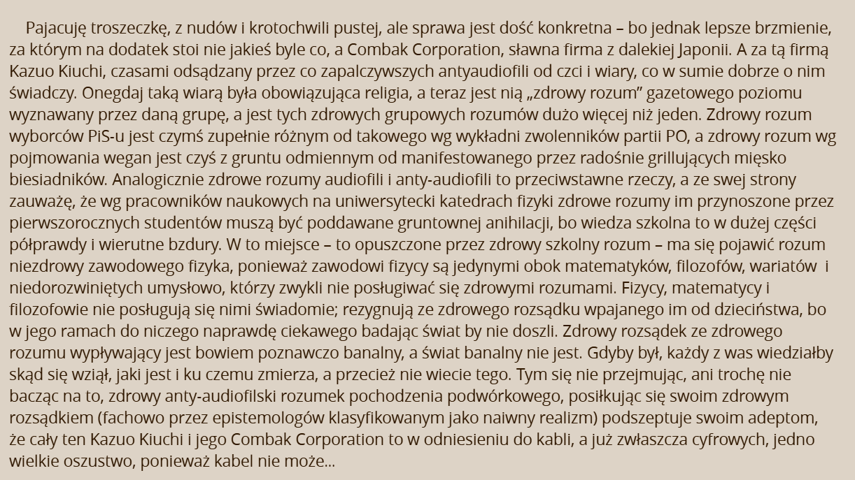 Kto chce kupować magię, niech kupuje, nawet jeśli wydają miliony na rzeczy, które działać prawa nie mają. Ich małpy i ich cyrk, a przede wszystkim ich pieniądze. Znacznie większy problem mam z tym, że sklepy i manufaktury dla audiofili raczej systemowo wprowadzają klientów w błąd co do cech produktów i nie znalazła się do tej pory instytucja (w Polsce i nie tylko), która by zdecydowała się zająć tym wszechobecnym łgarstwem, jak również nieoznaczonym marketingiem ukrytym pod pozorami recenzji – nie każdy może mieć zaszczyt sprawdzania kabelków za dziesiątki tysięcy złotych, zgodnie z przydługim nagłówkiem musi być tylko „aplauz i zaakceptowanie”.