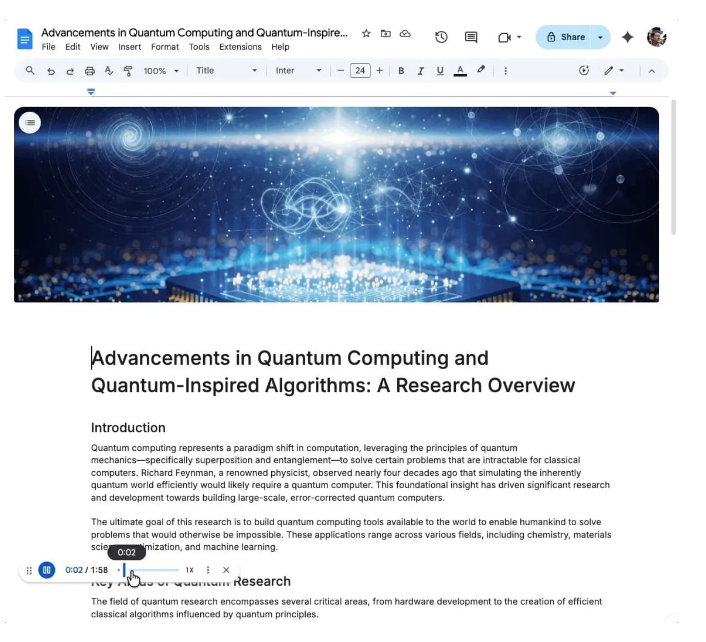Sercem tej funkcji jest sztuczna inteligencja Gemini, która nie tylko czyta, co widzi, ale aktywnie analizuje treść. Co ważne, audio-streszczenia potrafią objąć cały dokument, nawet jeśli składa się on z wielu kart. Zazwyczaj takie nagranie trwa kilka minut i skupia się na najważniejszych wnioskach, datach czy punktach akcji. To idealny sposób na szybkie „ogarnięcie” notatek ze spotkania, na którym nas nie było, lub wyłapanie sedna długiego raportu, zanim wejdziemy w szczegóły.