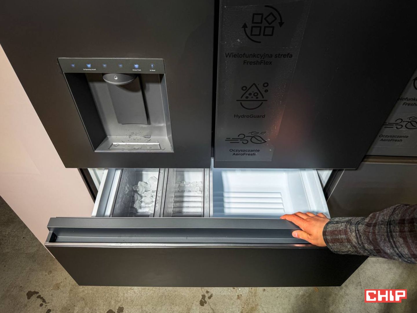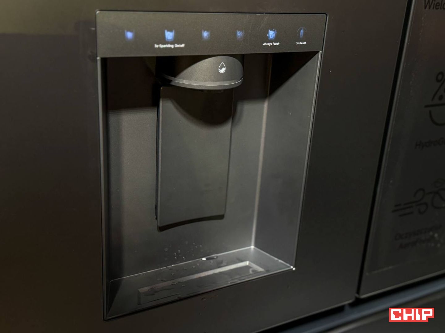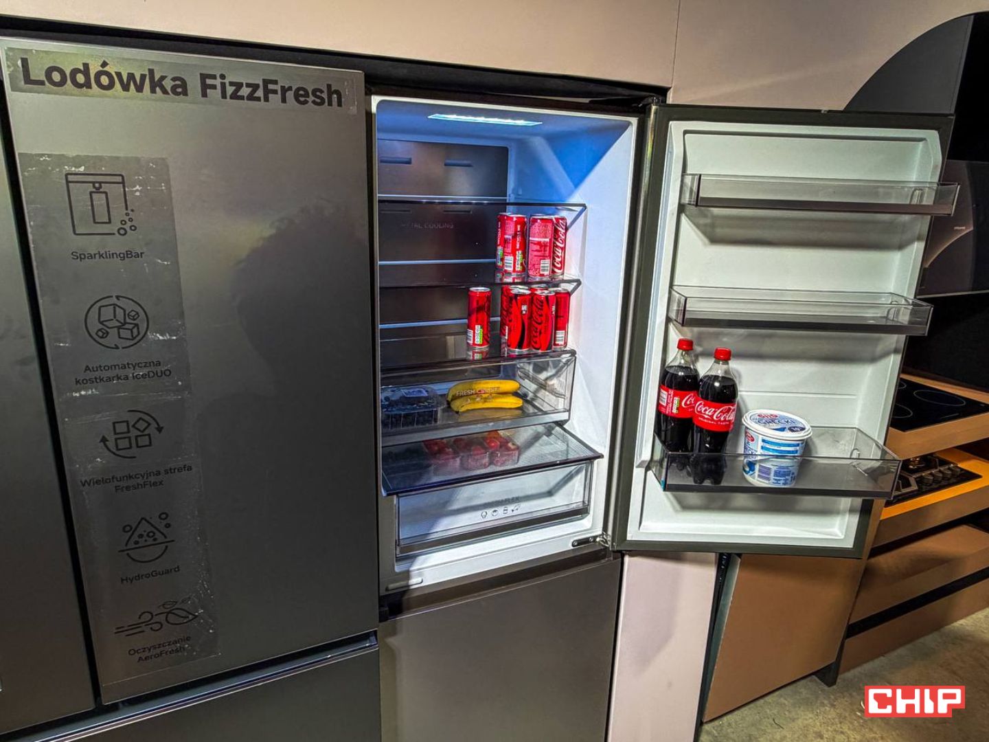 W lodówce FizzFresh jest także warstwa luksusowo-praktyczna, czyli dodatki, które szybko wchodzą w nawyk. Kostkarka potrafi robić lód także kruszony, jest też dozownik wody, a najciekawszy numer to woda gazowana z trzema poziomami nagazowania. W teorii brzmi jak gadżet, a w praktyce potrafi odczarować codzienność — mniej dźwigania zgrzewek, szybkie napoje od ręki, a przy okazji gotowy lód pod lemoniadę czy koktajle, bez planowania tego z wyprzedzeniem.