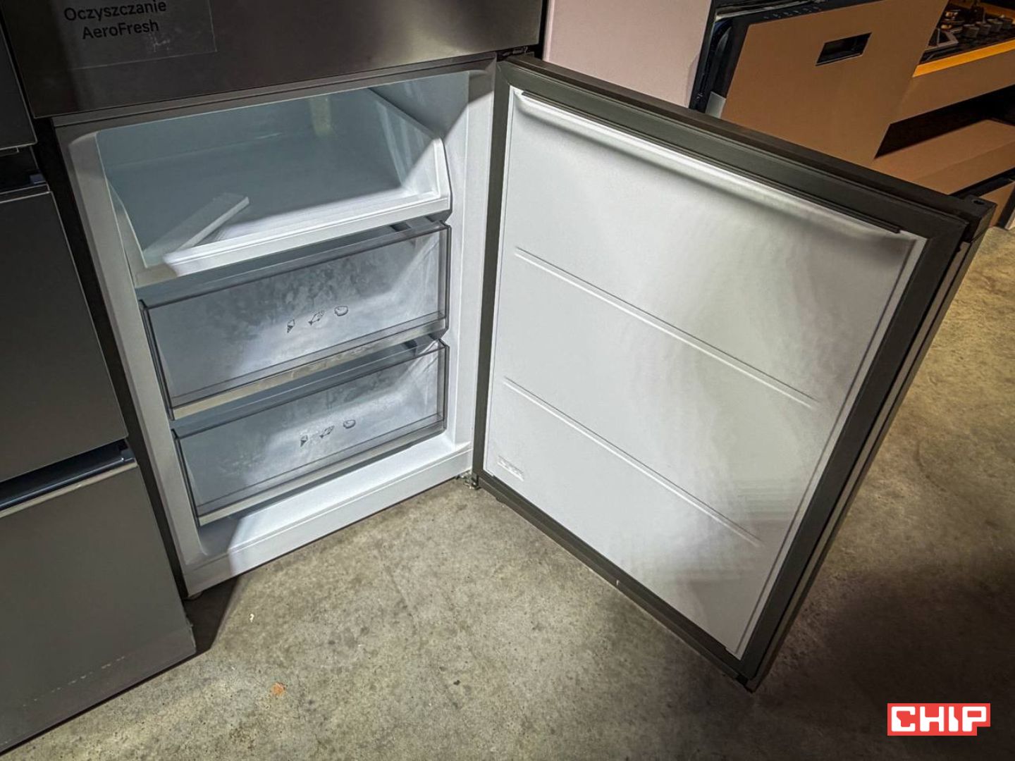 Drugi filar to porządek i kontrola warunków w środku. Zamiast jednej, uniwersalnej temperatury, mamy oddzielną strefę z precyzyjnymi ustawieniami w zakresie od -4°C do 1°C (FreshFlex), czyli coś, co pozwala lodówkę dopasować do tego, co faktycznie kupujemy i jak gotujemy — raz trzymamy produkty bardziej na chłodno, innym razem ustawiamy warunki pod delikatniejsze rzeczy. Do tego dochodzi filtracja powietrza (AeroFresh), która ma ograniczać mieszanie się zapachów — brzmi jak detal, ale właśnie takie pozornie małe rzeczy decydują o tym, czy po kilku tygodniach lodówka nadal robi dobre wrażenie, czy zaczynamy się frustrować.