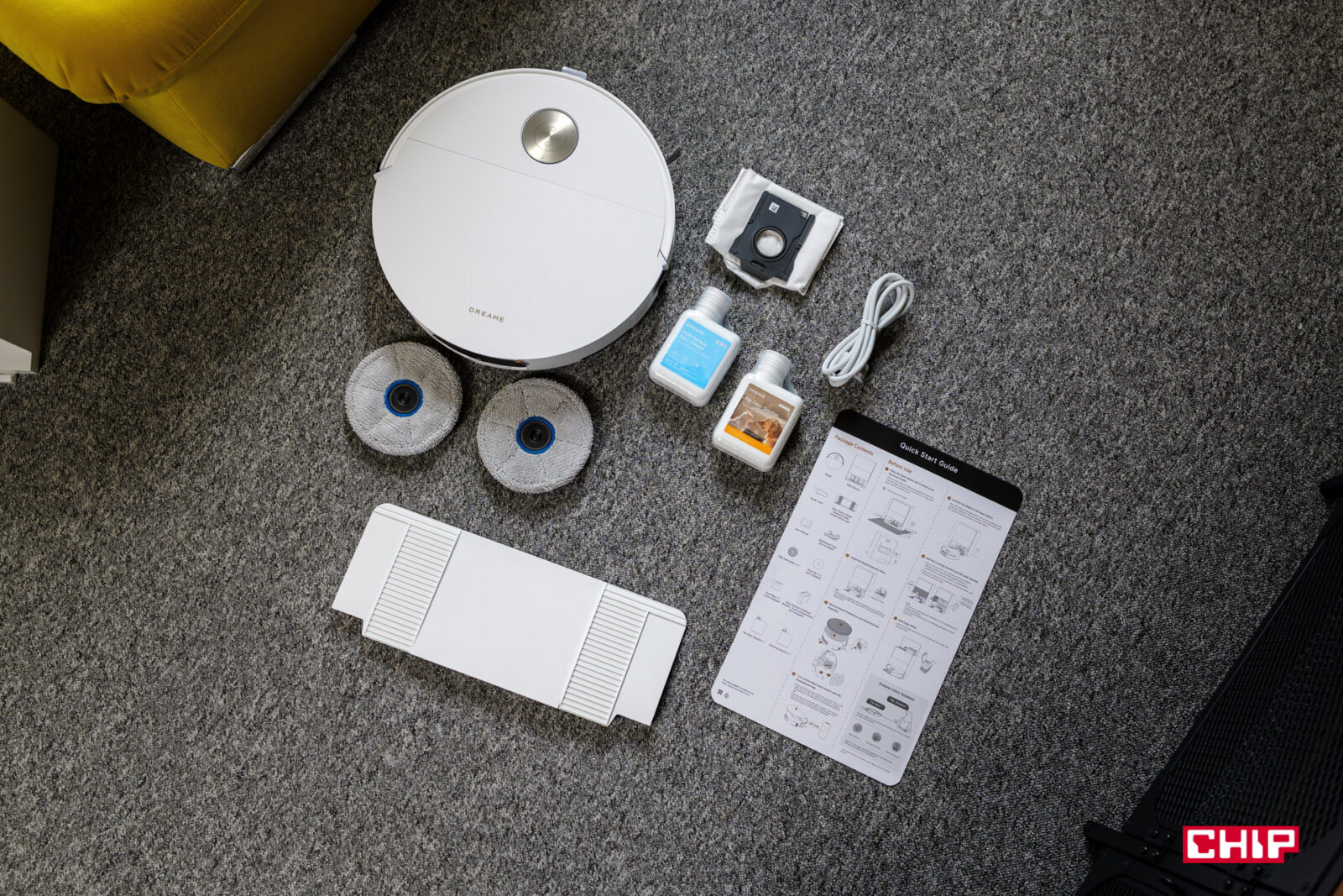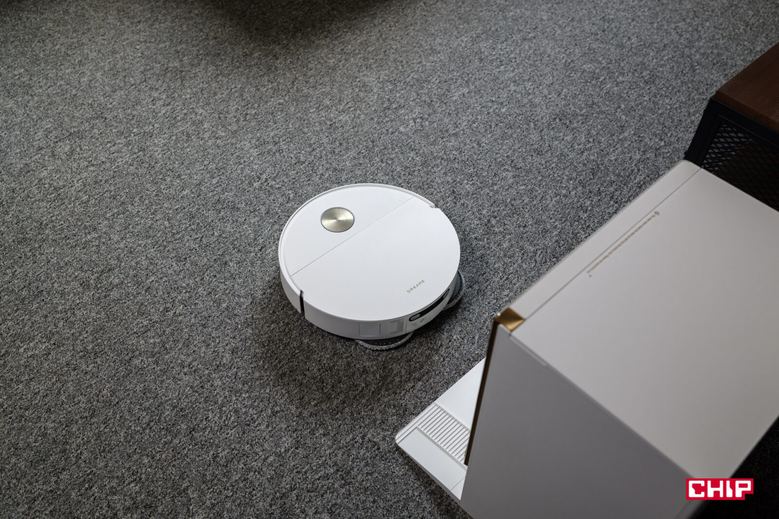 Mopowanie podłogi odbywa się na ciepło, bo podkładki są w stanie utrzymać temperaturę 40 stopni Celsjusza przez co najmniej cztery minuty. Musimy tylko pamiętać o włączeniu tej funkcji w Ustawieniach aplikacji Dreamehome. Po zakończonej pracy podkładki są prane automatycznie w temperaturze 100 stopni Celsjusza i suszone gorącym powietrzem. Suszenie przebiega bardzo sprawnie i zasadzie tak powinno być, bo robot po zakończonej pracy jest szybko gotowy do dalszej pracy, bo dzięki szybkiemu ładowaniu, naładowanie baterii do pełna trwa 80 minut.