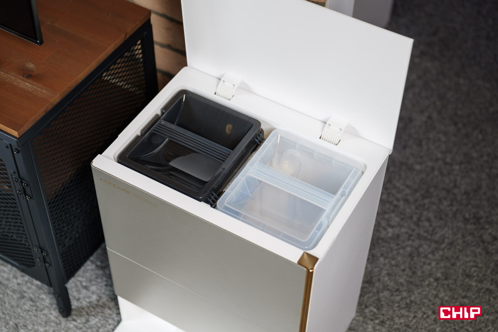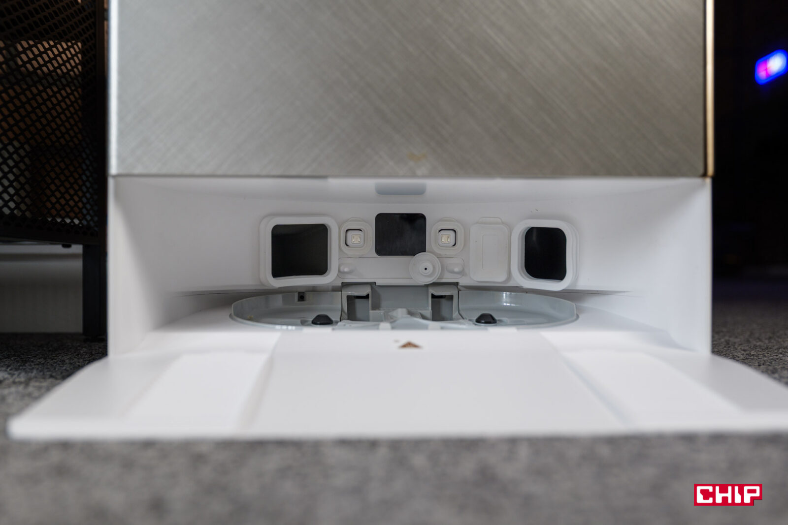 We wnętrzu stacji mamy oczywiście pojemniki na wodę – brudną i czystą oraz pojemnik na detergenty. Liczba mnoga, bo detergenty mamy dwa i oba znajdują się w zestawie. Jeden służy do mopowania podłóg, drugi do neutralizacji nieprzyjemnych zapachów, jakie mogą pozostawiać domowe zwierzaki.