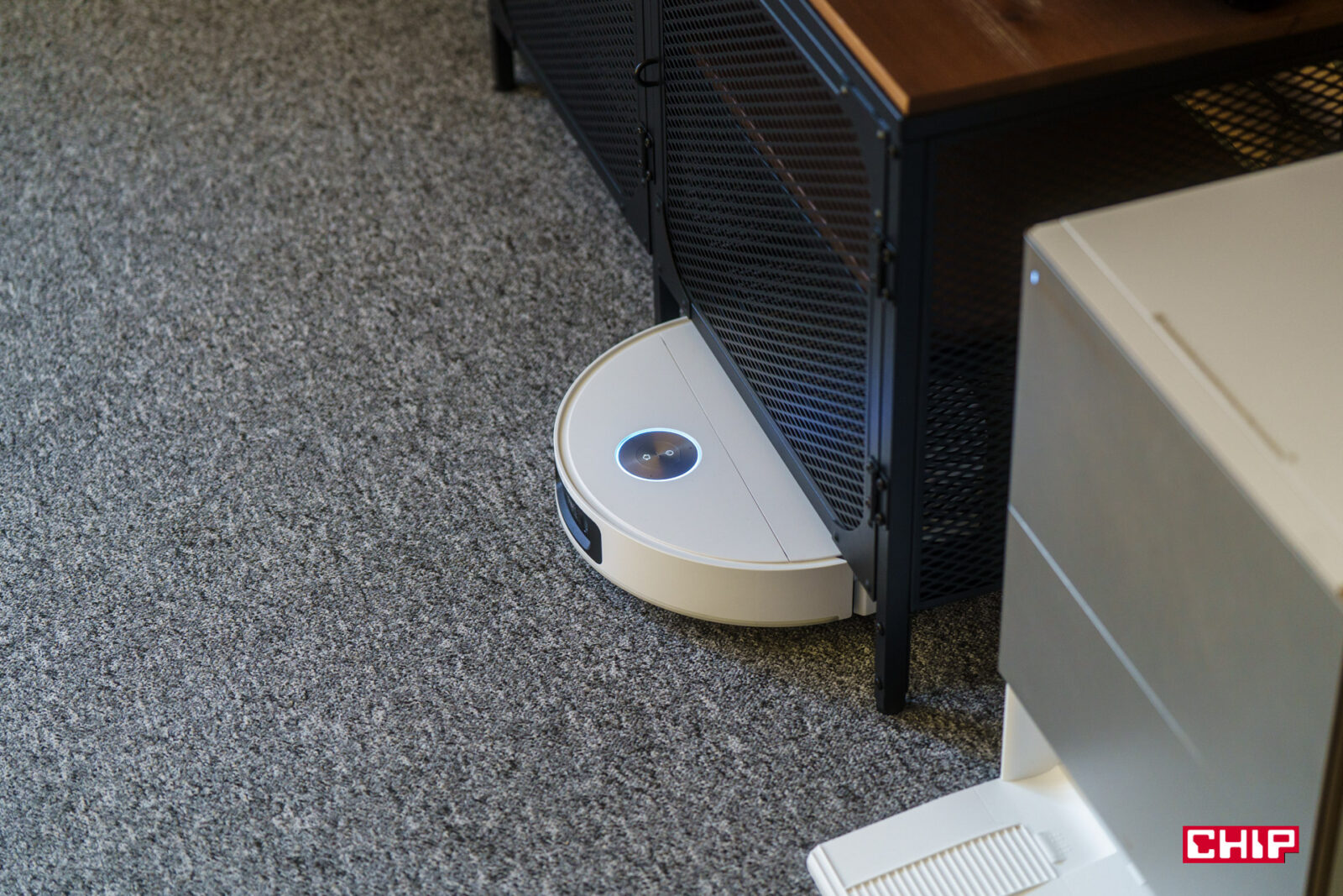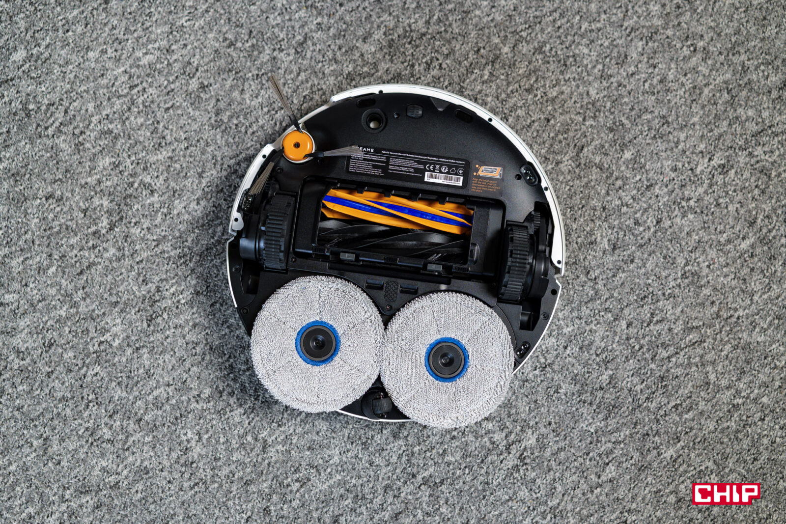 Za mopowanie odpowiadają dwie, szybko wirujące i dociskane do podłoża podkładki. Konkretnie mówimy o 230 obrotach na minutę i docisku z siłą 15 niutonów, czyli nieco ponad 1,5 kilograma. To całkiem sporo. Mopowanie jest możliwe wzdłuż krawędzi, bo jedna z podkładek jest wysuwana (MopExtend RoboSwing) poza obrys obudowy i podobnie jak ramię Dual Flex Arm potrafi sięgać zaskakująco daleko.