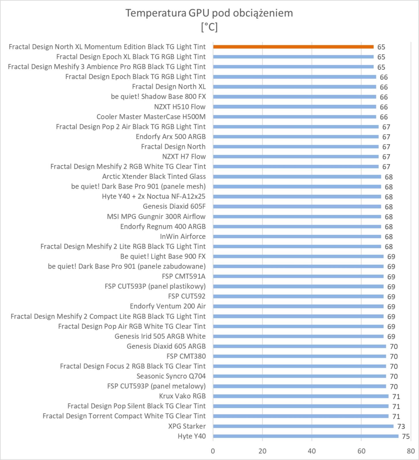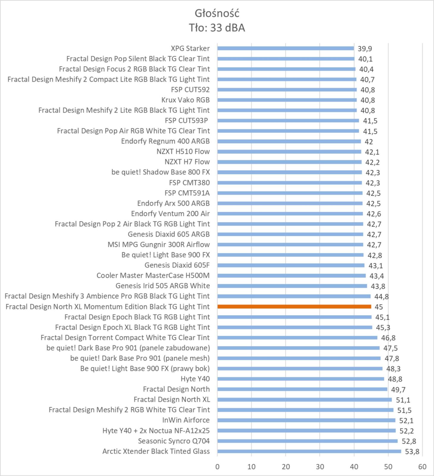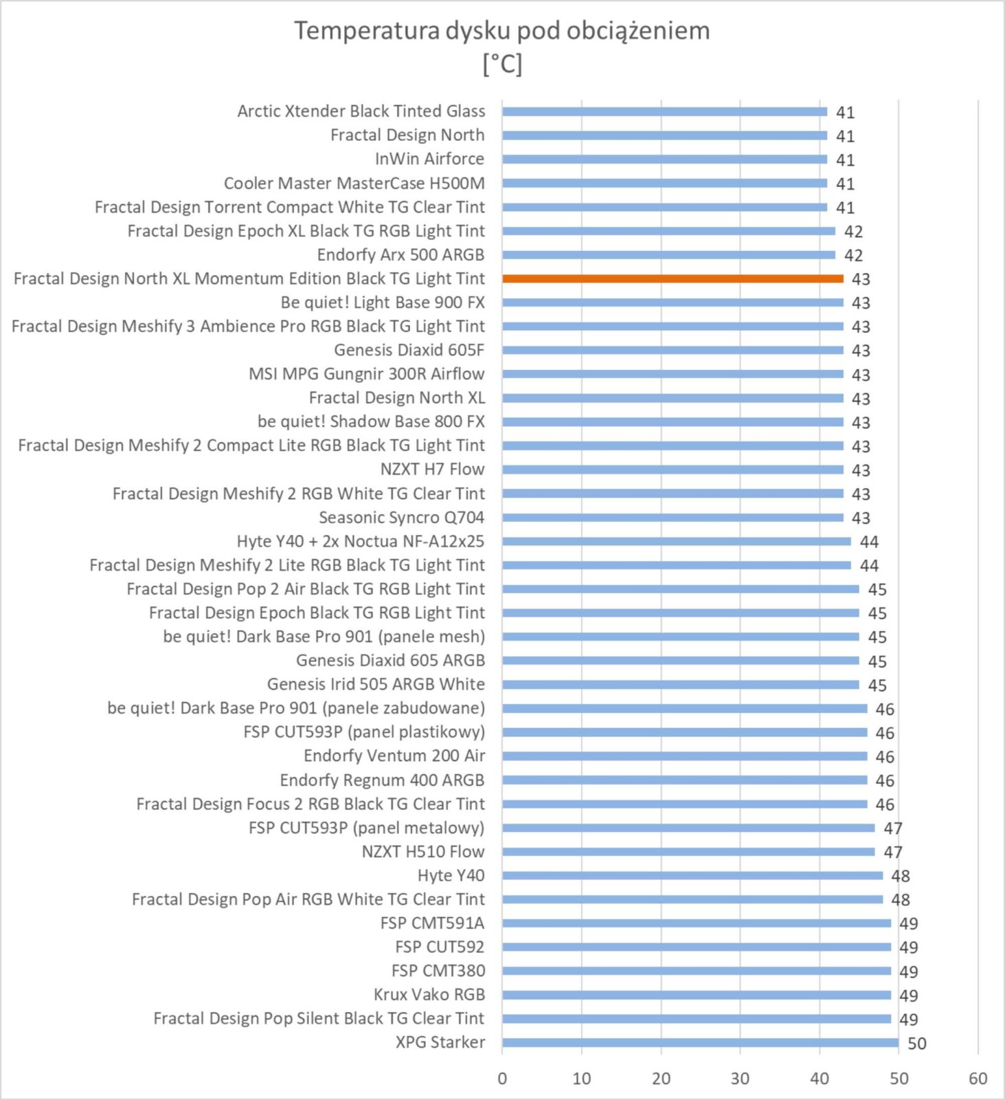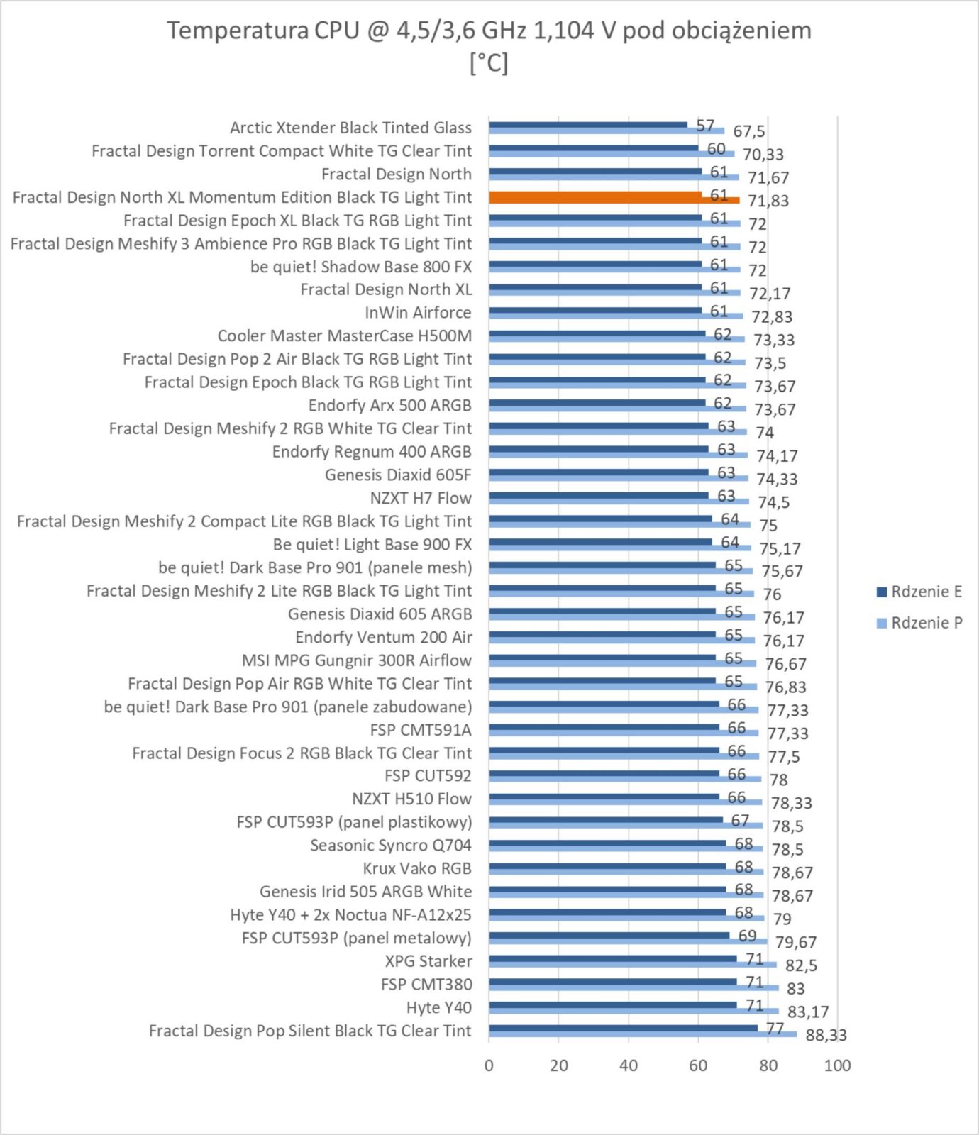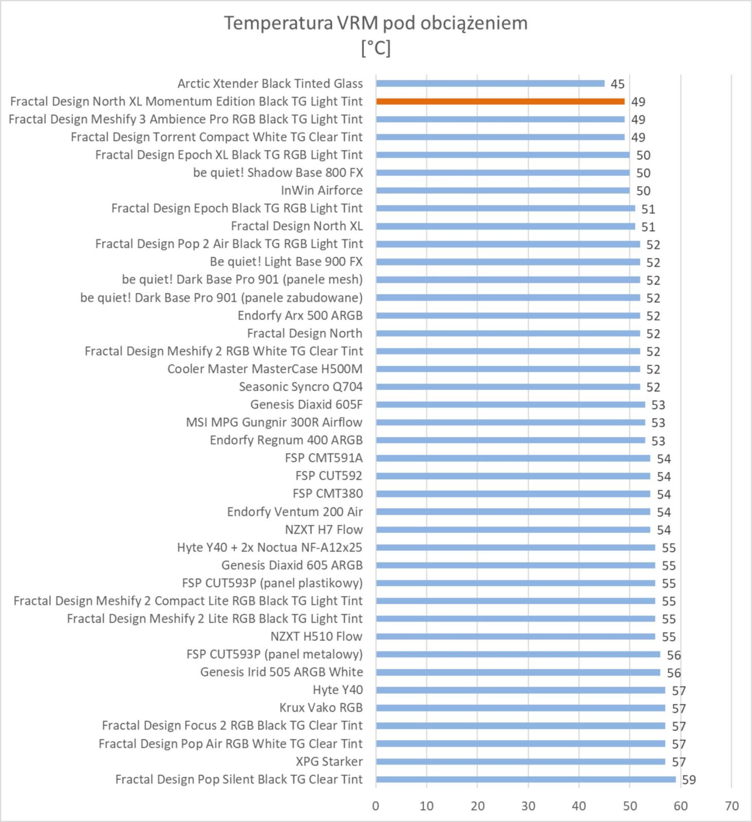 Wyniki są znakomite. Obudowa plasuje się w czołówce wykresów i bez wątpienia zapewnia bardzo dobre chłodzenie podzespołów. Wyniki są troszkę lepsze od standardowej wersji obudowy i prawie takie same jak w przypadku Epoch XL czy Meshify 3. Warto też zwrócić uwagę na głośność, która jest znacznie niższa niż w przypadku North XL – różnica jest naprawdę spora.