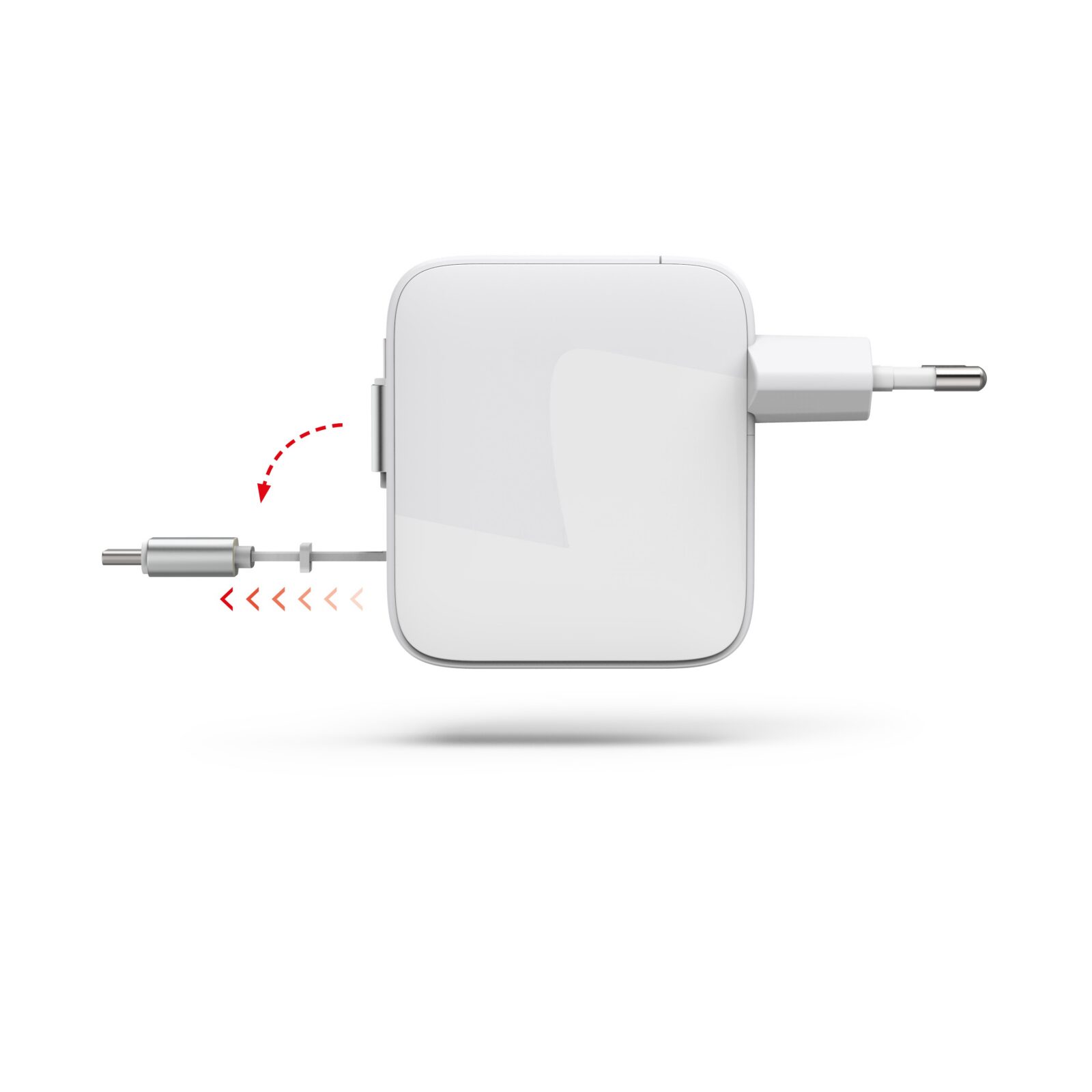 Największa zaleta tej ładowarki jest jednocześnie jej charakterem: wysuwany kabel jest zawsze ten sam. Jeśli masz przyzwyczajenia np. dłuższy przewód do łóżka, krótszy do biurka, kątową wtyczkę, oplot, tutaj tego nie zmienisz. 70 cm w wielu scenariuszach wystarczy, ale w niektórych będzie granicznie, zwłaszcza gdy gniazdko jest nisko, a laptop ląduje na blacie.
