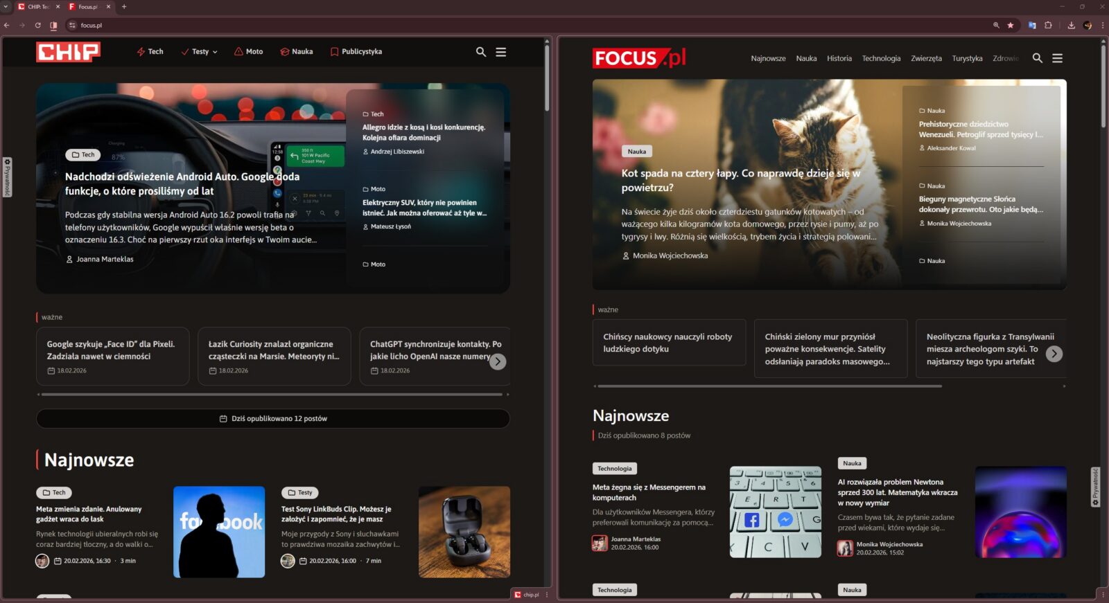 Aktywacja tego trybu jest bardzo prosta. Wystarczy kliknąć prawym przyciskiem myszy na dowolną otwartą kartę i wybrać opcję „Dodaj kartę do nowego widoku dzielonego”. Możemy wtedy wskazać drugą witrynę z już otwartych lub przenieść wybraną stronę do istniejącego podziału. Co ważne, podział nie jest sztywny – najeżdżając kursorem na linię środkową, możemy dowolnie zmieniać proporcje obu okien. Google pomyślał też o wygodzie zarządzania: pod trzema kropkami w rogu ukryto opcję „Odwróć widoki”, która błyskawicznie zamienia strony miejscami.