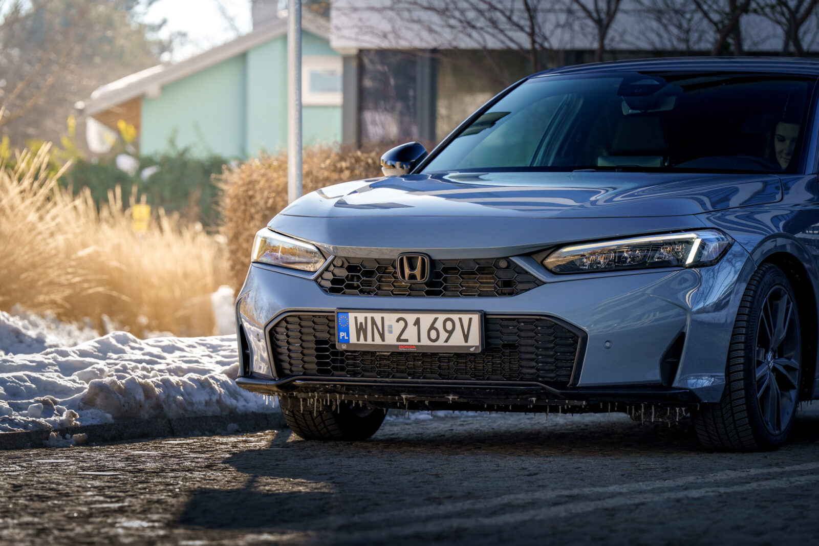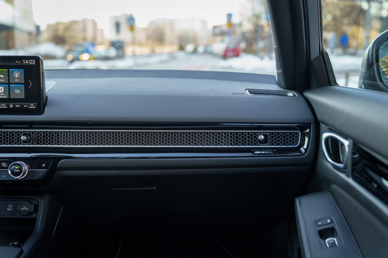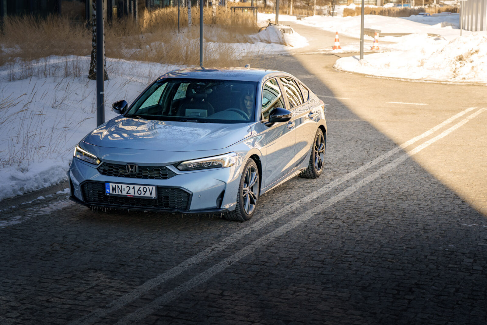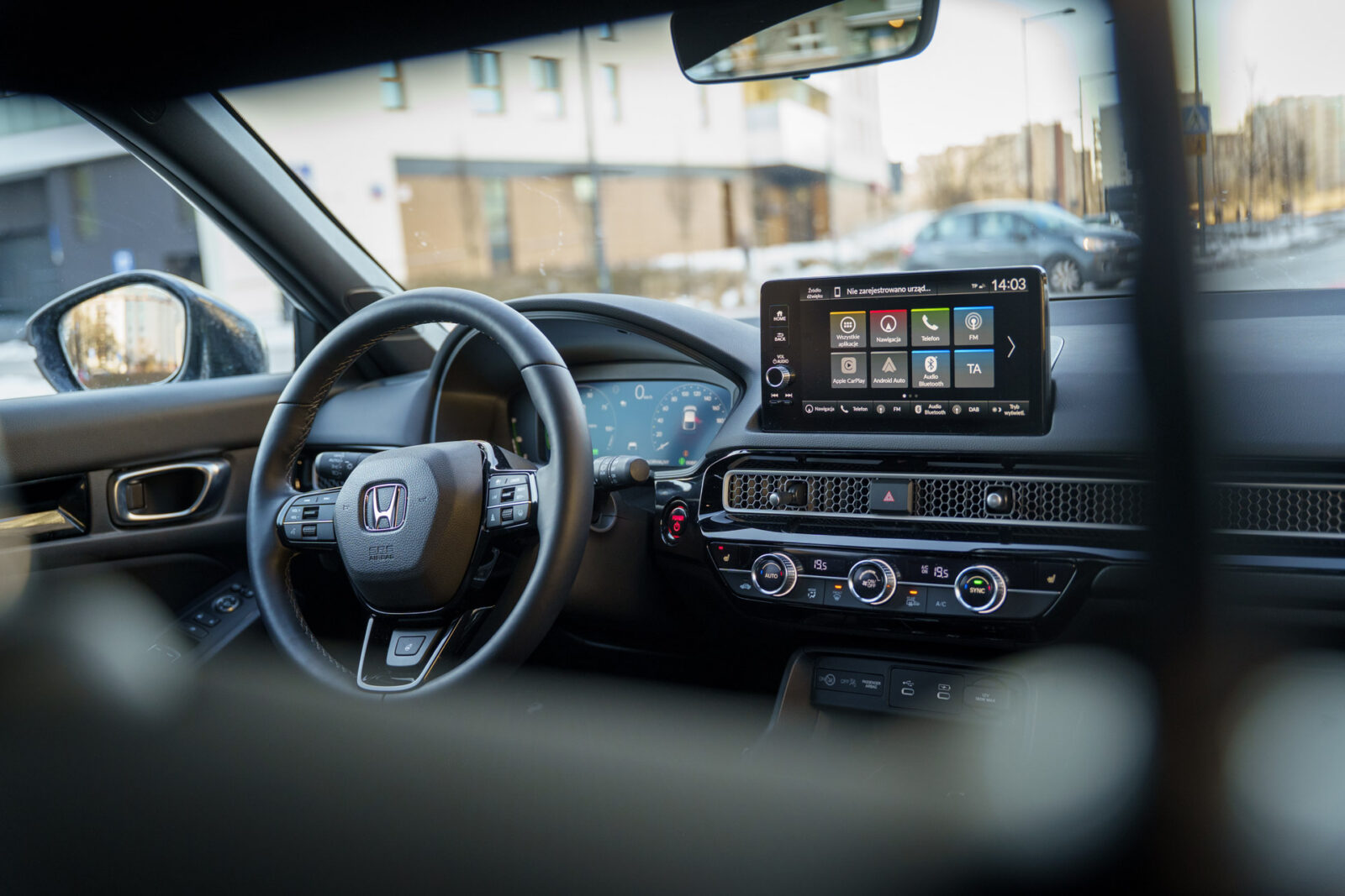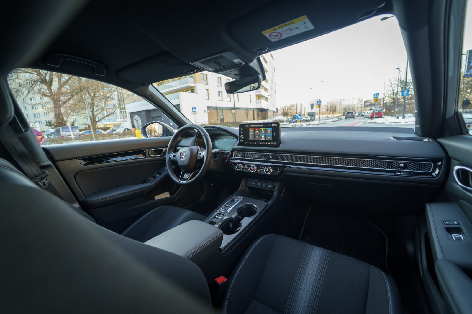 Układ hybrydowy Hondy jest jednym z lepszych, jakie widziałam. Przede wszystkim, jeżeli nie będziecie Civica katować, skrzynia biegów nie będzie nadmiernie hałasowała, co jest miłym zaskoczeniem, w szczególności biorąc pod uwagę to, że mamy do czynienia z e-CVT, a więc bezstopniową przekładnią, którą możemy spotkać w innych japońskich hybrydach. Jeżeli mówimy o miejskich prędkościach, również dynamika nie będzie stanowiła problemu. Układ hybrydowy Civica zawsze rusza na prądzie, więc pełny moment obrotowy silnika elektrycznego mamy już na „dzień dobry”. Dzięki temu auto ochoczo rusza spod świateł i zazwyczaj nie korzysta z silnika spalinowego do prędkości ok 40 km/h, więc jest całkiem dynamicznie i cicho. Jeśli dodamy do tego świetnie zestrojony układ monitorowania martwego pola i nieprzesadnie czuły system ostrzegania przed opuszczeniem pasa ruchu, auto w zasadzie odwala większość roboty za Was. Pilnuje sąsiadujących pasów i będzie Wam sygnalizowało, jeżeli manewr zmiany pasa/skrętu, nie jest w danym momencie najlepszym pomysłem.