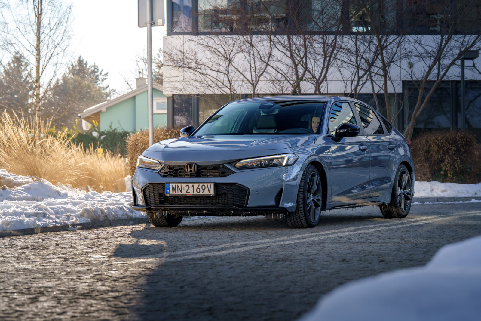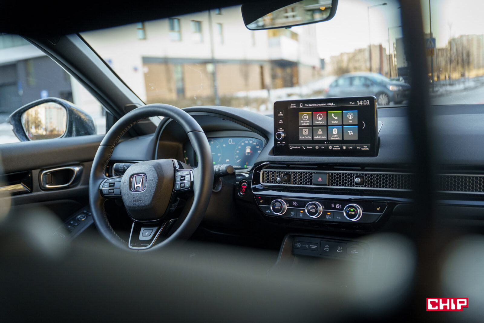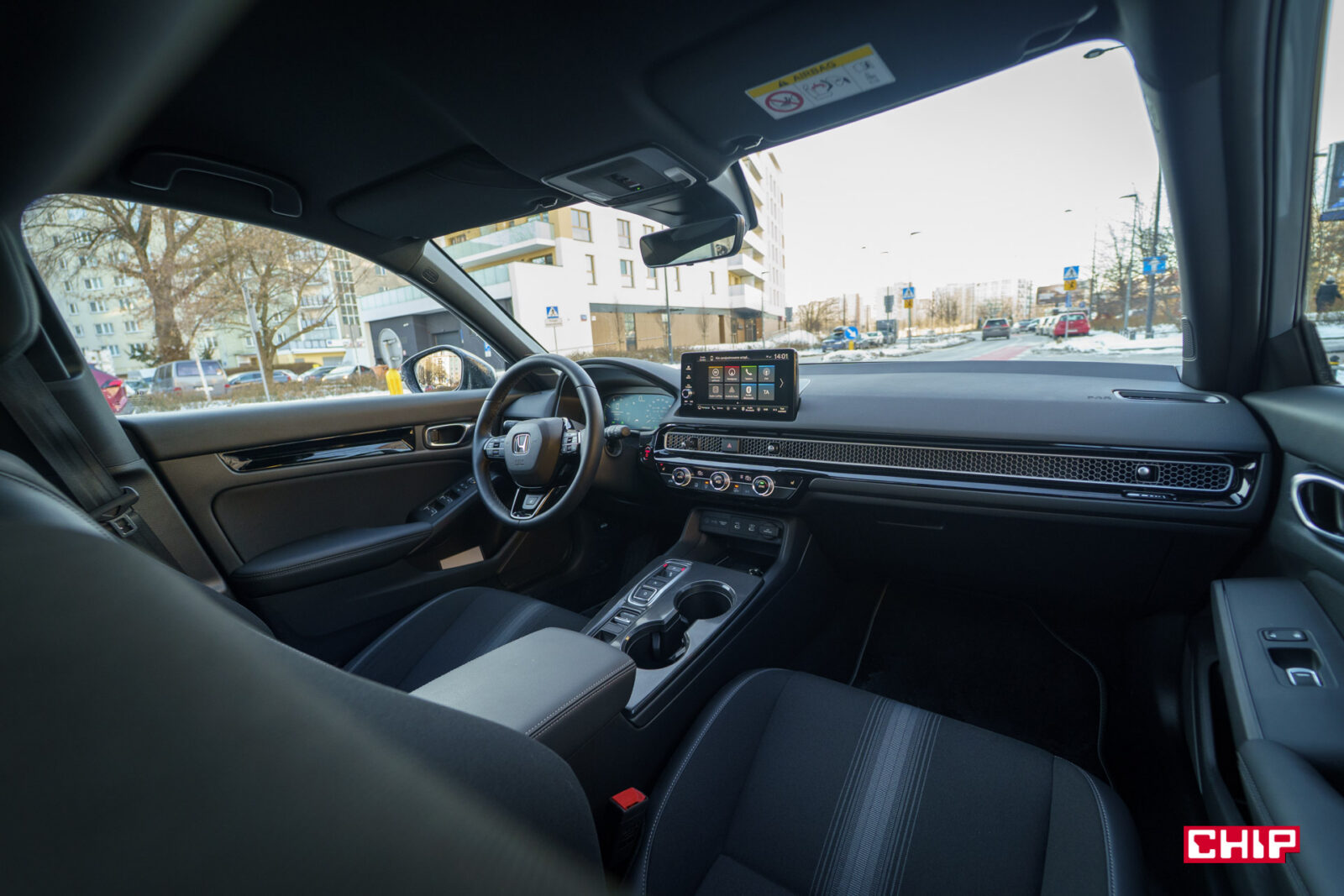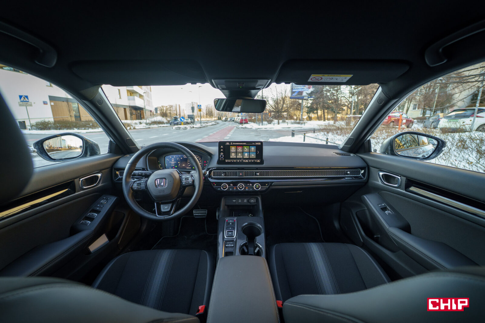 Układ hybrydowy Hondy jest jednym z lepszych, jakie widziałam. Przede wszystkim, jeżeli nie będziecie Civica katować, skrzynia biegów nie będzie nadmiernie hałasowała, co jest miłym zaskoczeniem, w szczególności biorąc pod uwagę to, że mamy do czynienia z e-CVT, a więc bezstopniową przekładnią, którą możemy spotkać w innych japońskich hybrydach. Jeżeli mówimy o miejskich prędkościach, również dynamika nie będzie stanowiła problemu. Układ hybrydowy Civica zawsze rusza na prądzie, więc pełny moment obrotowy silnika elektrycznego mamy już na „dzień dobry”. Dzięki temu auto ochoczo rusza spod świateł i zazwyczaj nie korzysta z silnika spalinowego do prędkości ok 40 km/h, więc jest całkiem dynamicznie i cicho. Jeśli dodamy do tego świetnie zestrojony układ monitorowania martwego pola i nieprzesadnie czuły system ostrzegania przed opuszczeniem pasa ruchu, auto w zasadzie odwala większość roboty za Was. Pilnuje sąsiadujących pasów i będzie Wam sygnalizowało, jeżeli manewr zmiany pasa/skrętu, nie jest w danym momencie najlepszym pomysłem.