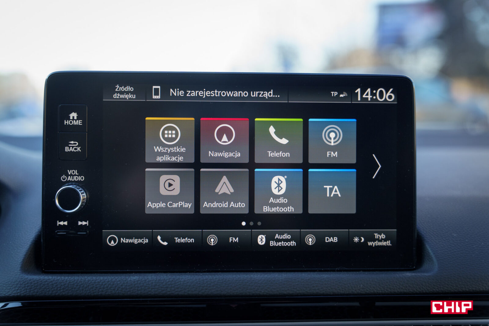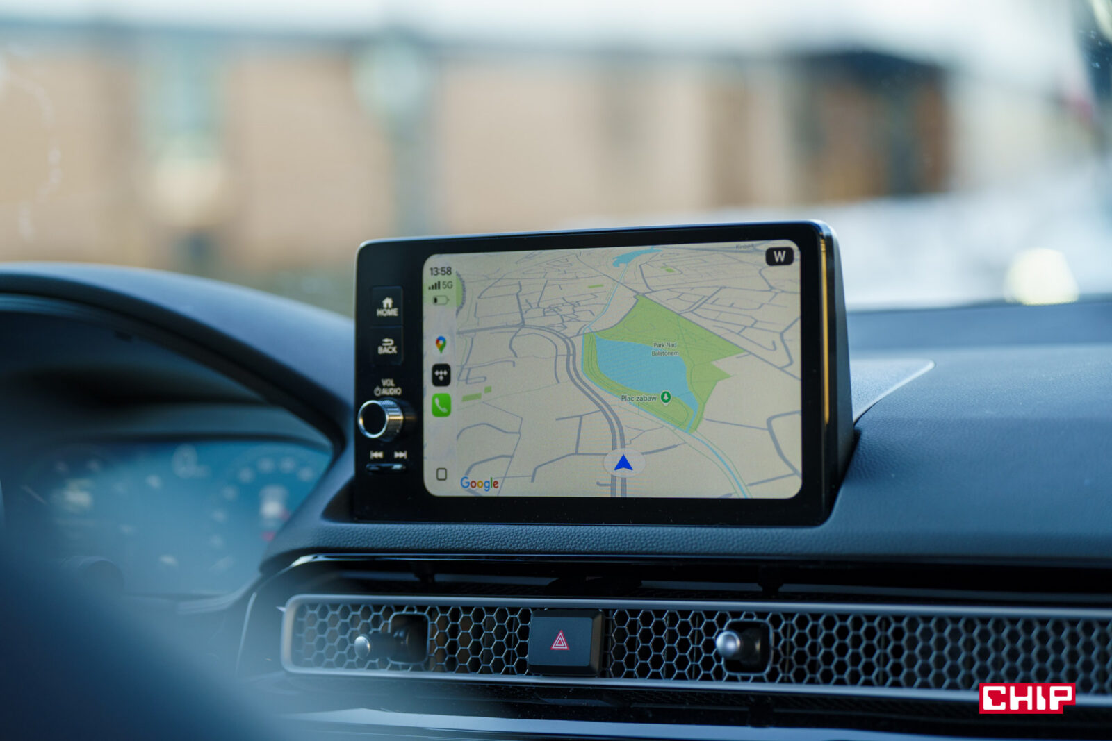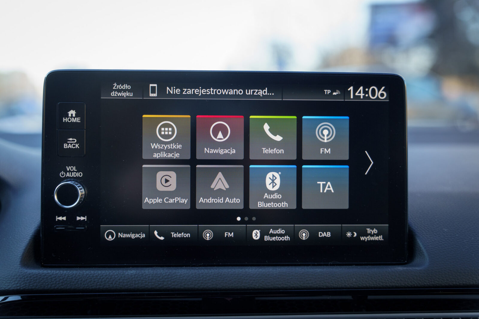 Interfejs smartfonu na ekranie głównym prezentuje się bardzo dobrze. Android Auto i Apple CarPlay działają bezprzewodowo. Sam ekran nie jest wybitnej jakości, ale kolory są miłe dla oka, a jasność wystarczająca nawet w bardzo słoneczne dni.