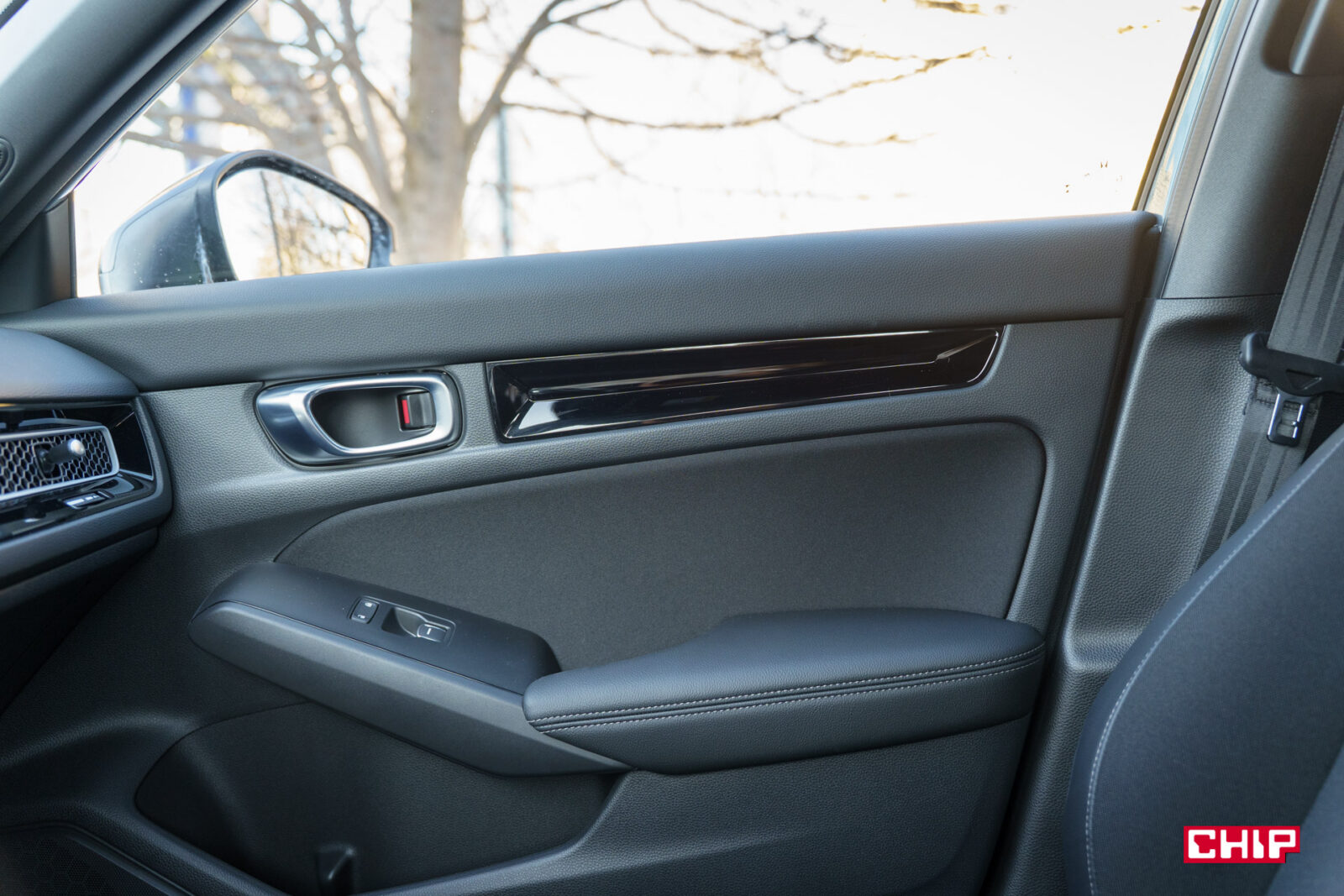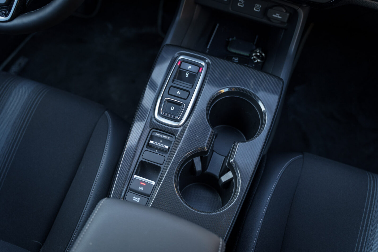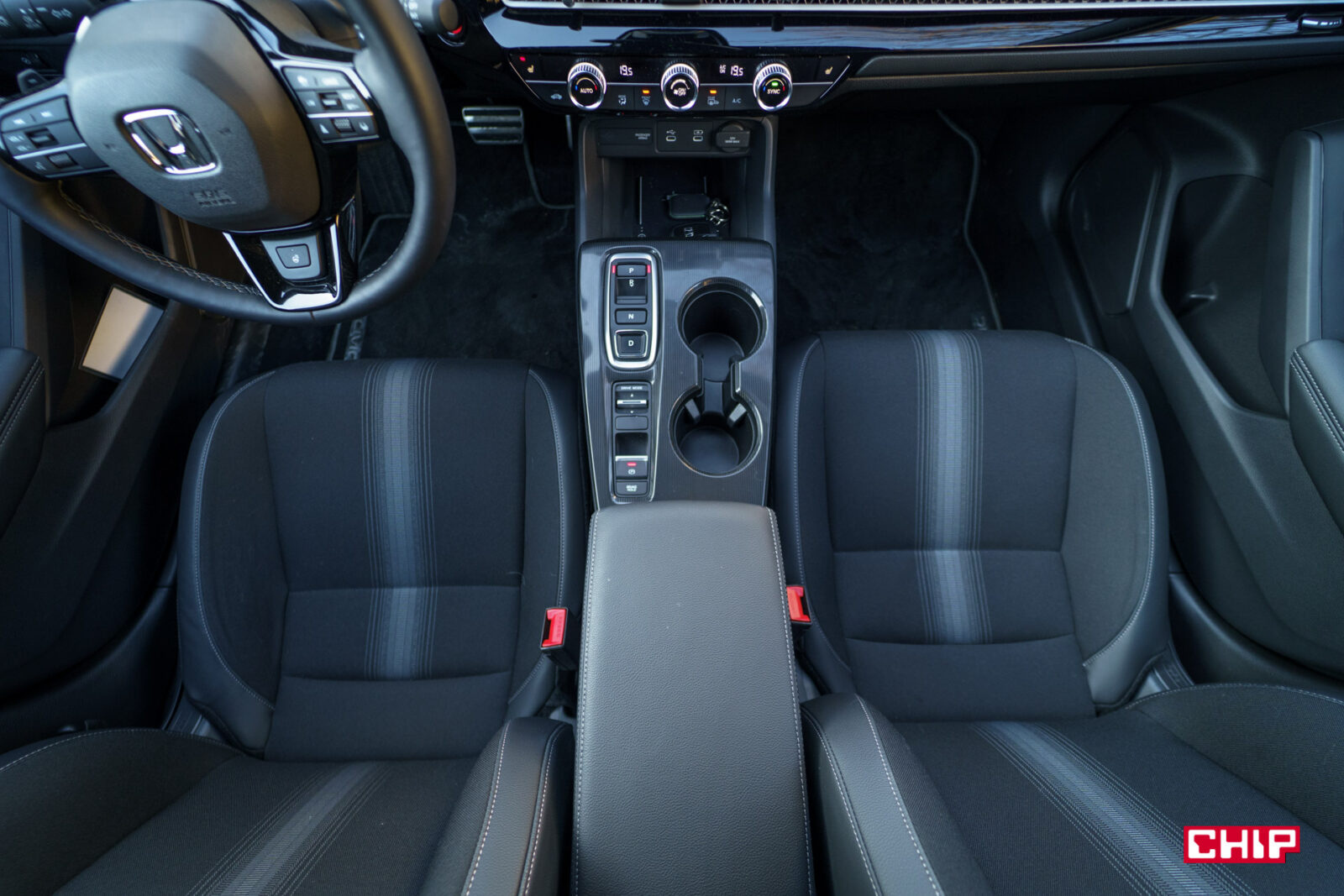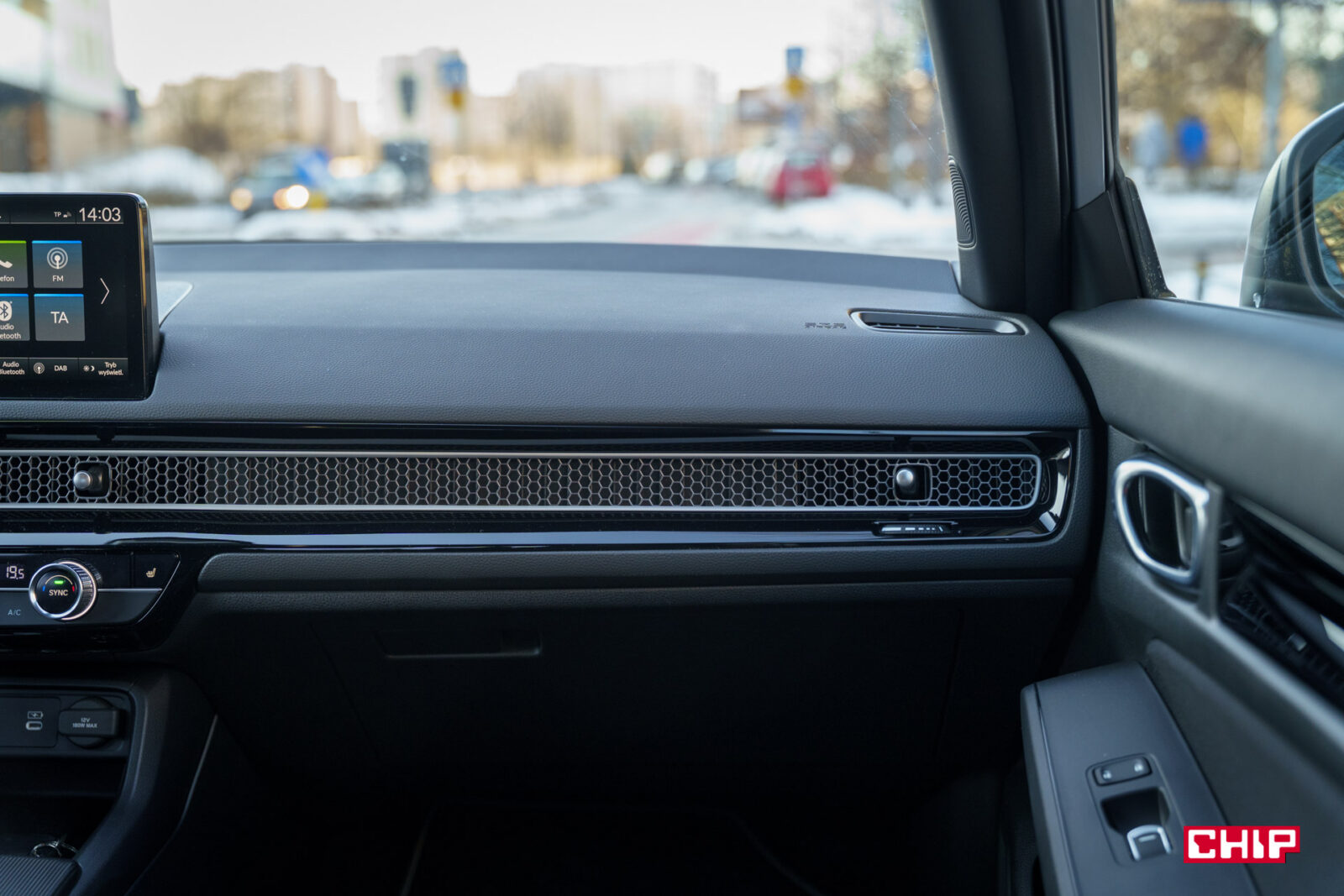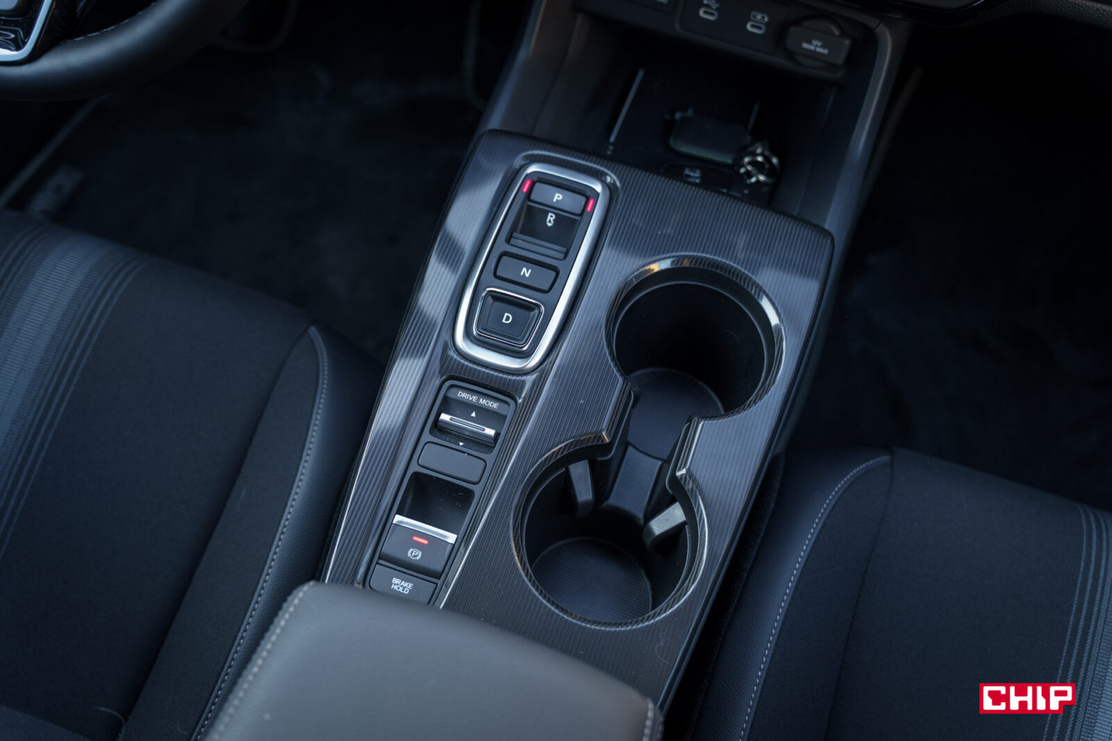 Tunel środkowy co prawda się błyszczy, ale to nie jest klasyczne piano black. Dzięki długim pasom zdecydowanie mniej zbiera kurz i tak łatwo się nie rysuje. Tu mamy też dwa uchwyty na napoje i co ważne – przyciski. Ciekawym zabiegiem jest to, że przyciski zmiany trybów jazdy są zrobione tak, że każdy jest inny. Podobnie jak w innych nowych autach Hondy, dzięki czemu trudniej jest wybrać coś przypadkiem. Wnętrze jest dobrze wykonane. Materiały są przyjemne w dotyku, nie skrzypią i nie trzeszczą w trakcie jazdy.