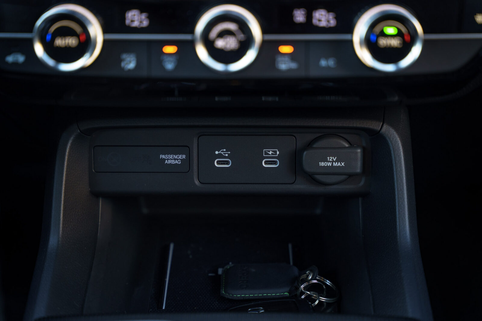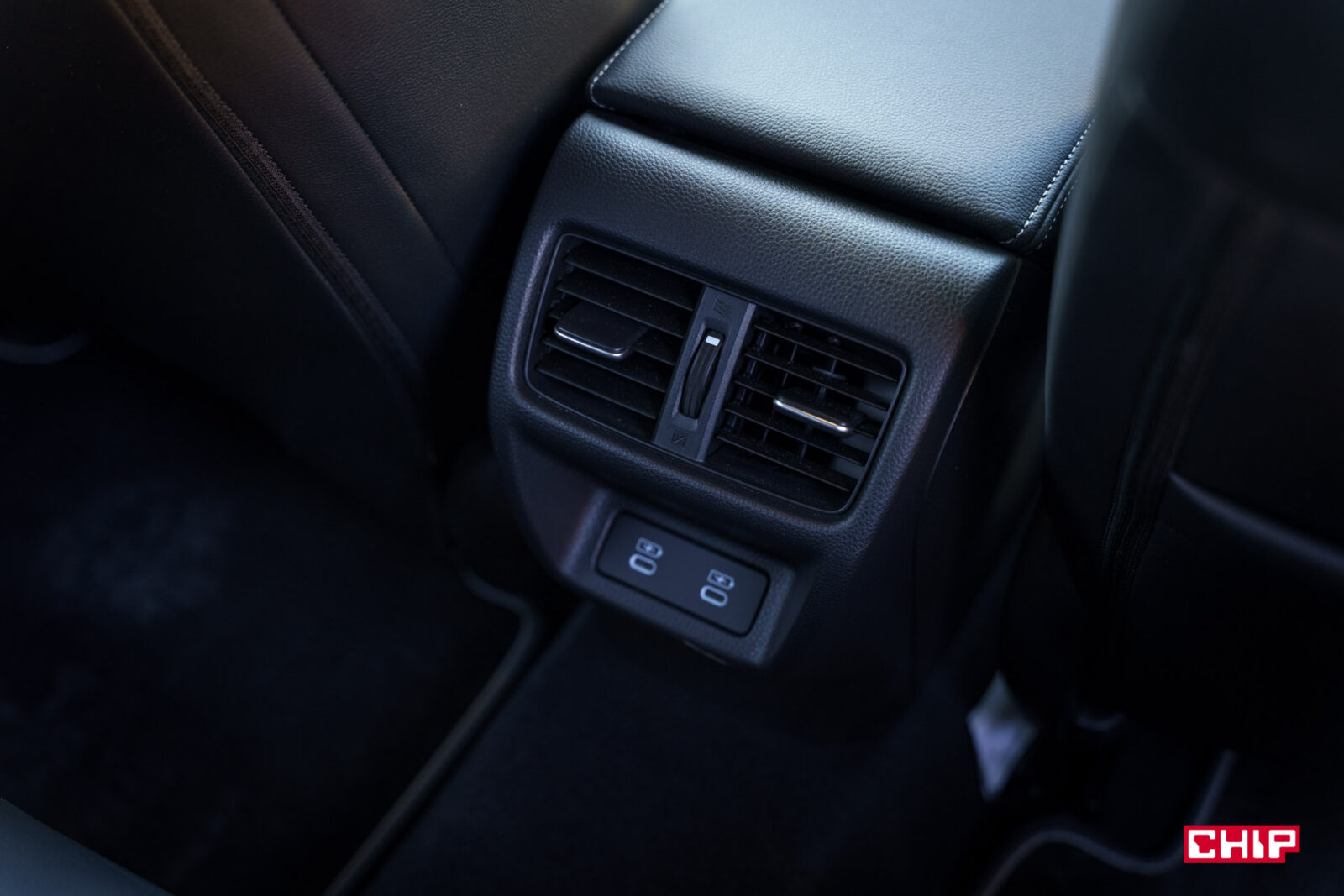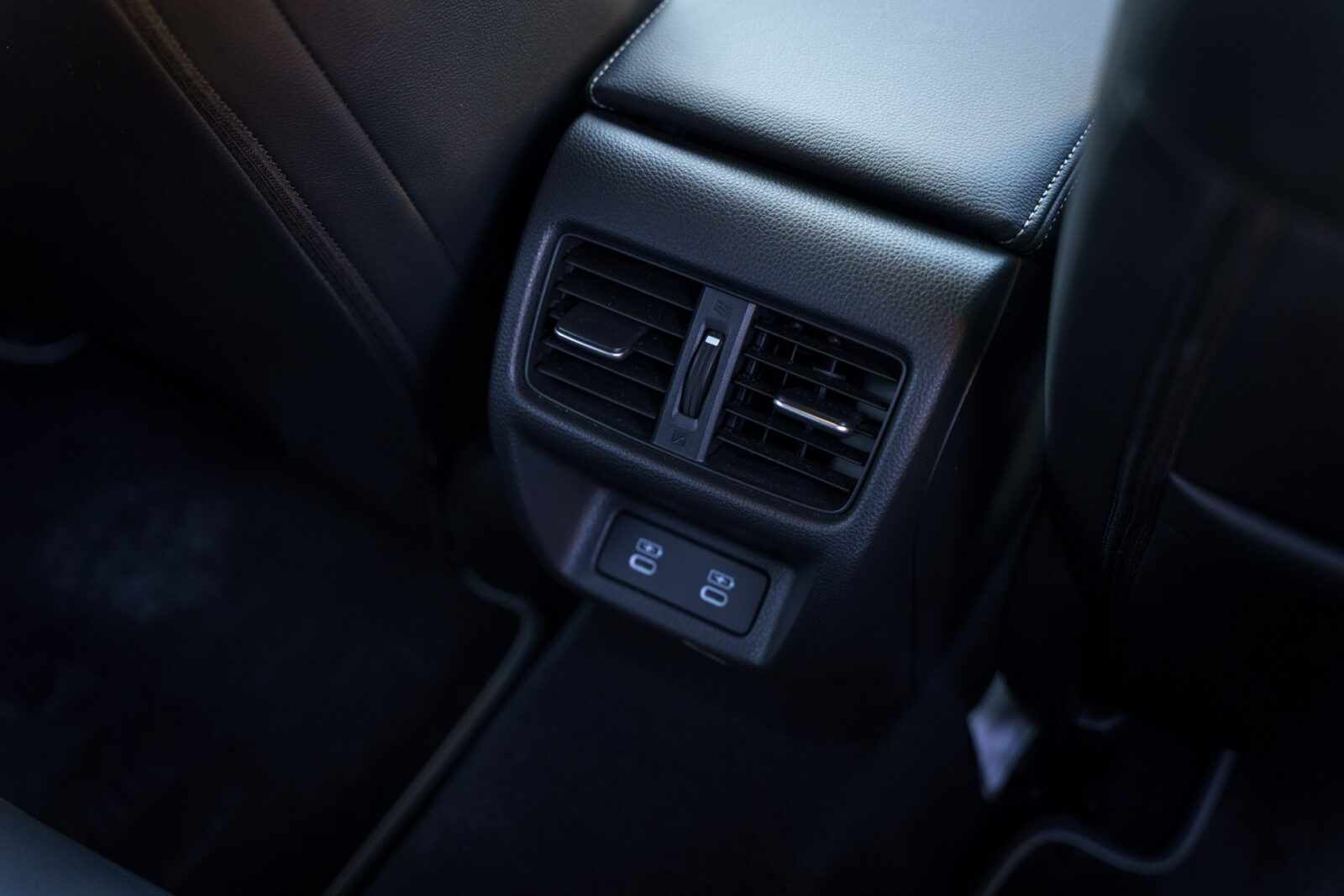 Z tyłu jest komfortowo. Auto ma 4560 mm długości, 2082 mm szerokości z luterkami i 1408 mm wysokości, a to przekłada się na sporo miejsca na nogi i nad głową. Osoby do 190 cm wzrostu nie powinny narzekać na brak przestrzeni. Z udogodnień mamy tu tylko nawiewy klimatyzacji bez sterowania (klimatyzacja jest dwustrefowa, w standardzie) oraz dwa porty USB-C. Rozkładany podłokietnik z uchwytami na napoje jest, ale jest to podłokietnik opadający. Czyli po otwarciu jego przód opiera się o siedzisko, przez co zawsze jest ustawiony po skosie. Co wygląda trochę jakby się zepsuło.