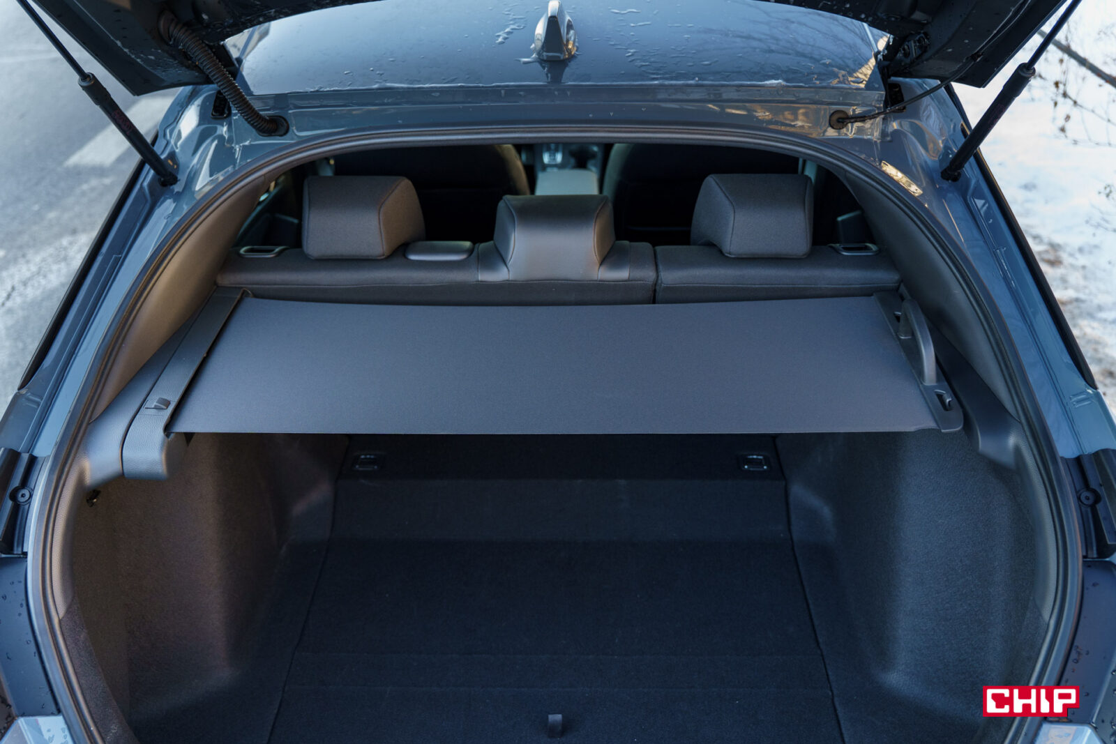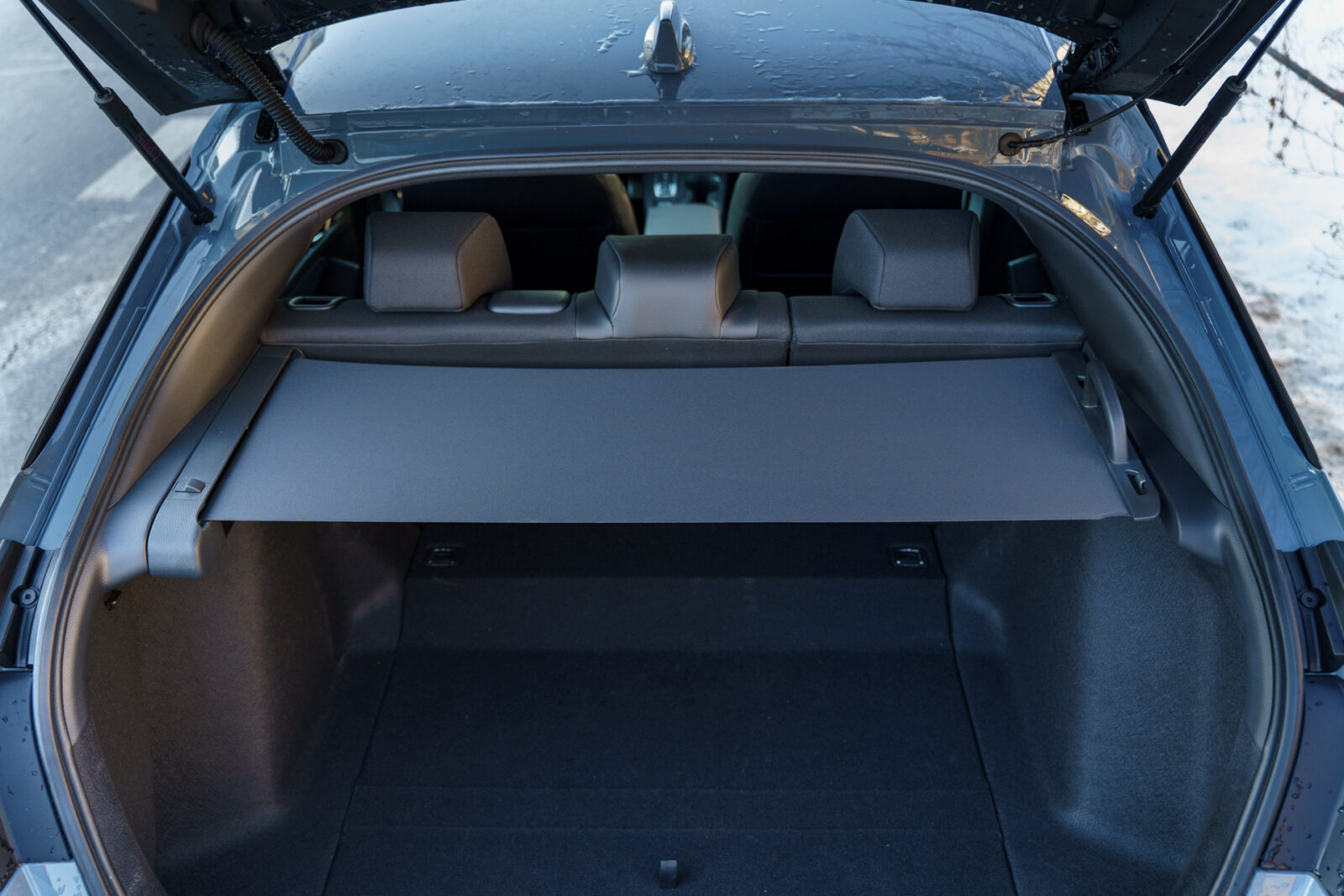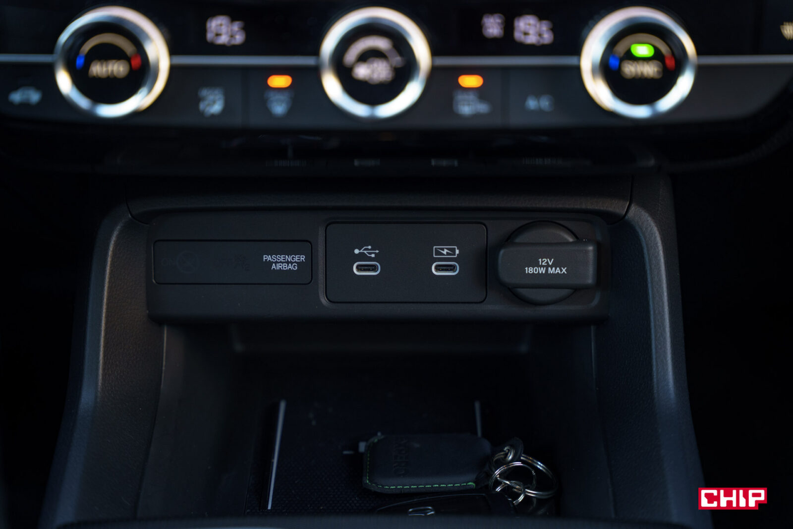 Z tyłu jest komfortowo. Auto ma 4560 mm długości, 2082 mm szerokości z luterkami i 1408 mm wysokości, a to przekłada się na sporo miejsca na nogi i nad głową. Osoby do 190 cm wzrostu nie powinny narzekać na brak przestrzeni. Z udogodnień mamy tu tylko nawiewy klimatyzacji bez sterowania (klimatyzacja jest dwustrefowa, w standardzie) oraz dwa porty USB-C. Rozkładany podłokietnik z uchwytami na napoje jest, ale jest to podłokietnik opadający. Czyli po otwarciu jego przód opiera się o siedzisko, przez co zawsze jest ustawiony po skosie. Co wygląda trochę jakby się zepsuło.