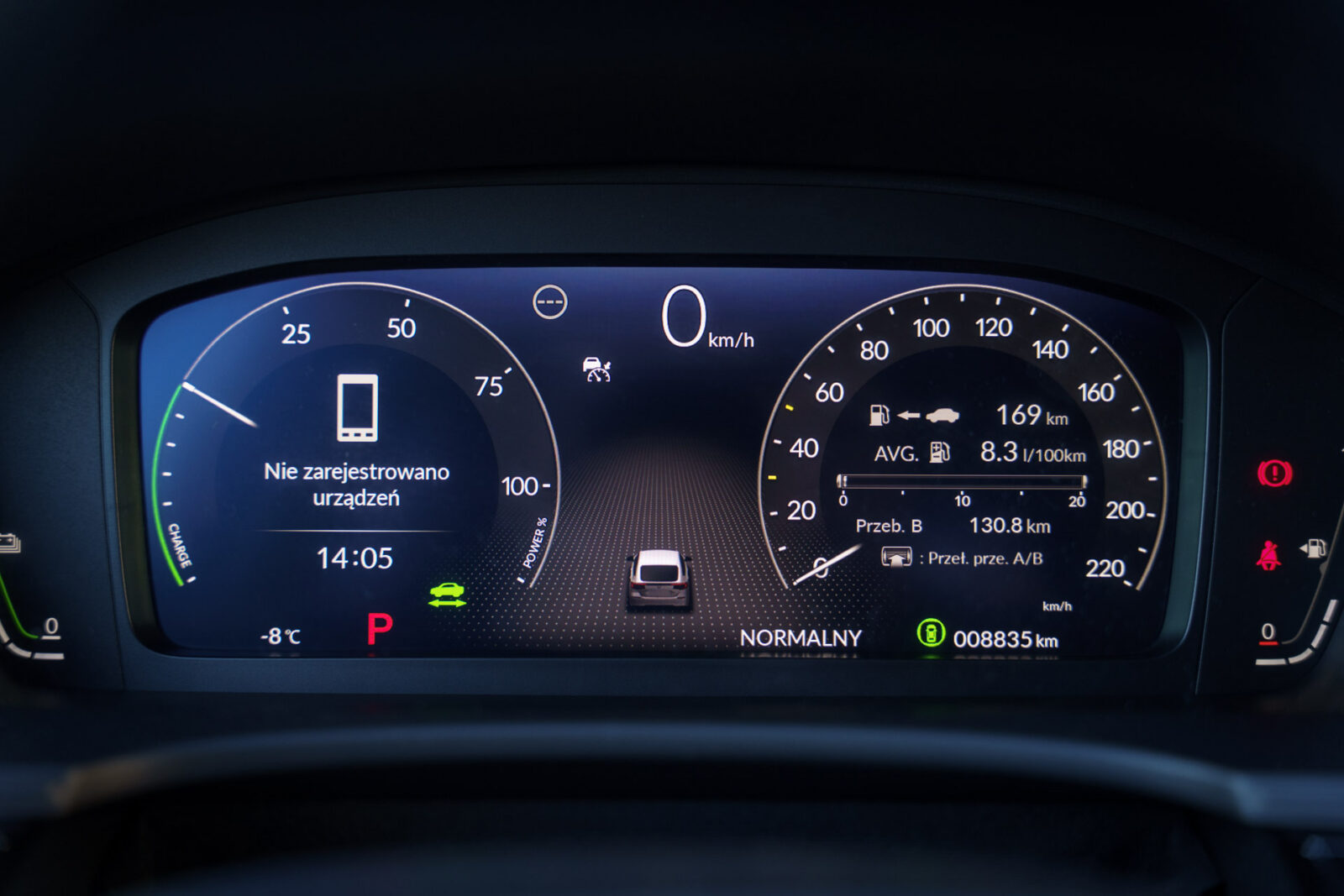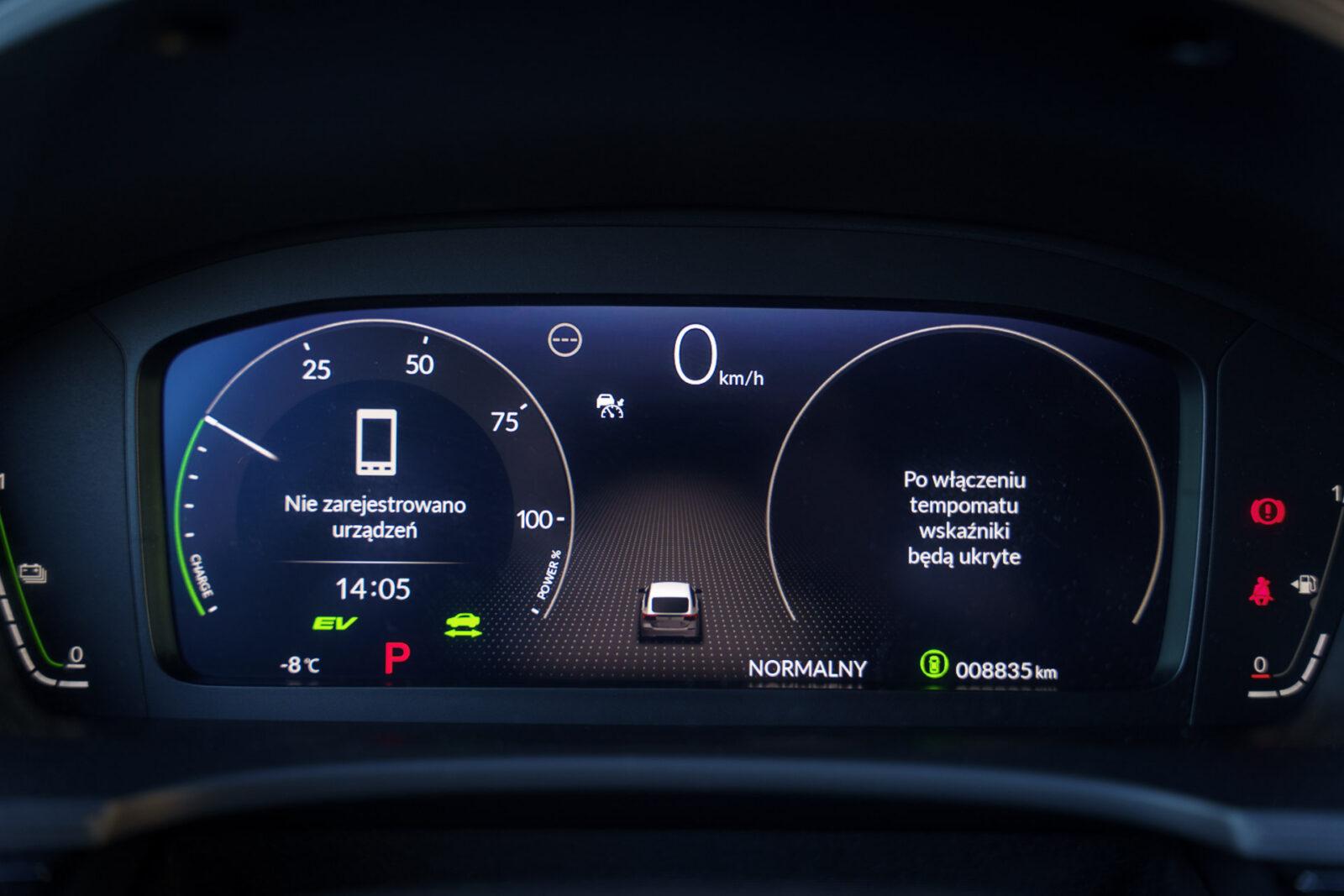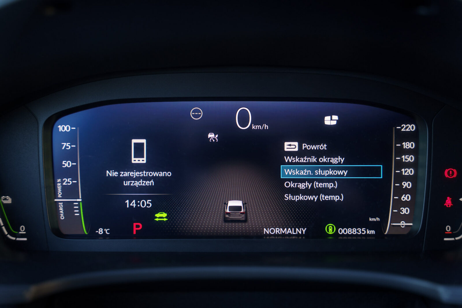 Ekran kierowcy ma przekątną 10,25 cala i oferuje dwa widoki. Z zegarami okrągłymi lub w formie słupków, więc wszystko wedle gustu. Zegary są proste, ale ciekawie zaprojektowane, czytelne i użyteczne. Jak przystało na hybrydę nie mamy tu niestety obrotów, a procentowy wskaźnik wykorzystania mocy. Szkoda, że wzorem hybyrdowych aut Toyoty nie można tego zmienić.