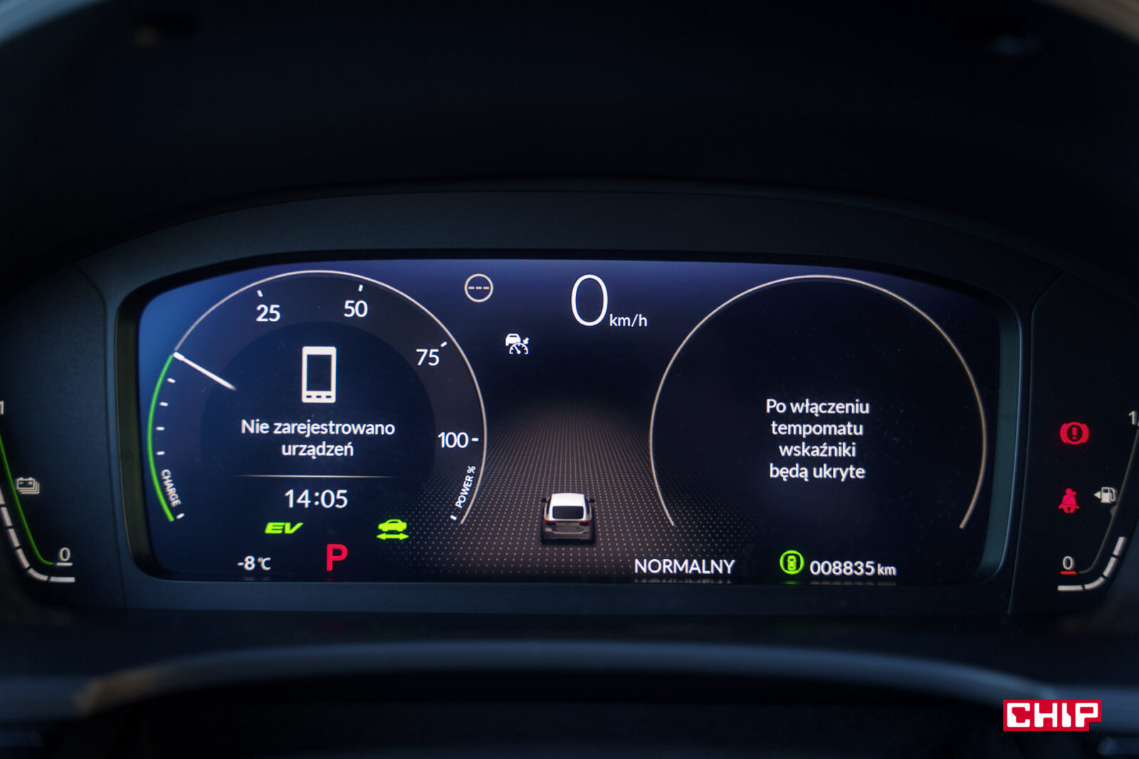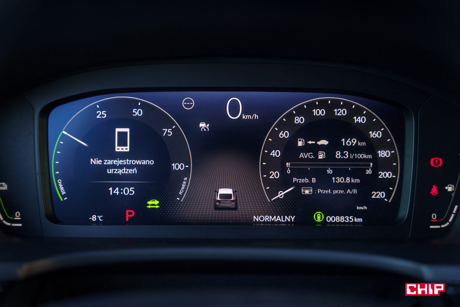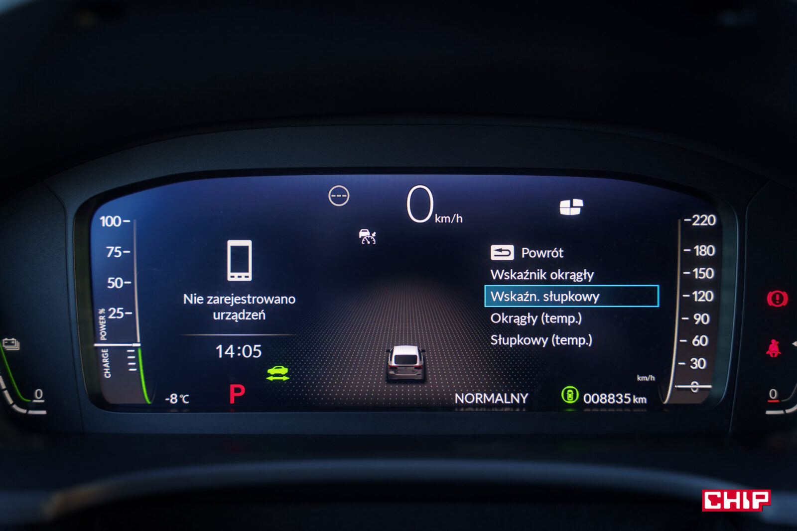 Ekran kierowcy ma przekątną 10,25 cala i oferuje dwa widoki. Z zegarami okrągłymi lub w formie słupków, więc wszystko wedle gustu. Zegary są proste, ale ciekawie zaprojektowane, czytelne i użyteczne. Jak przystało na hybrydę nie mamy tu niestety obrotów, a procentowy wskaźnik wykorzystania mocy. Szkoda, że wzorem hybyrdowych aut Toyoty nie można tego zmienić.
