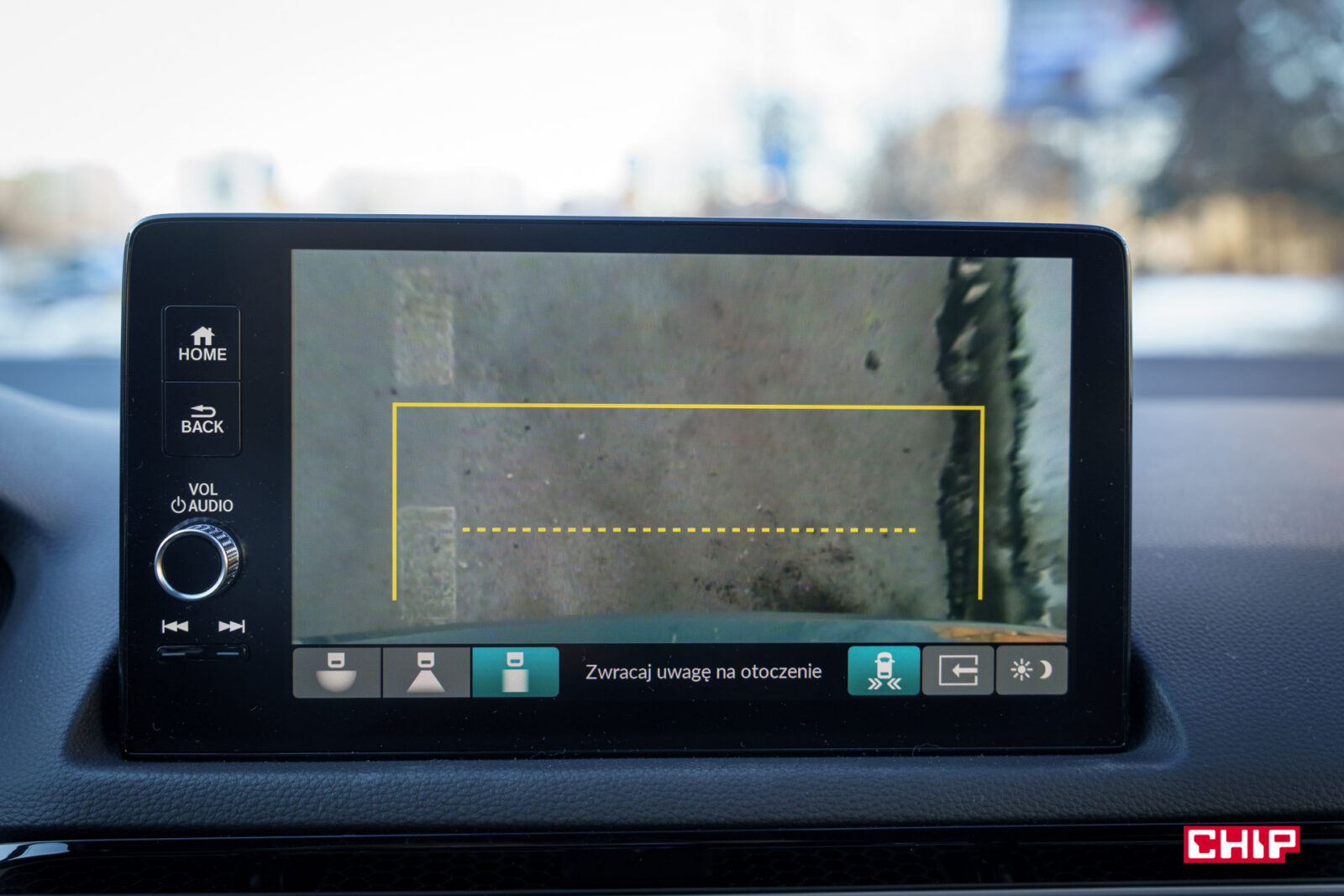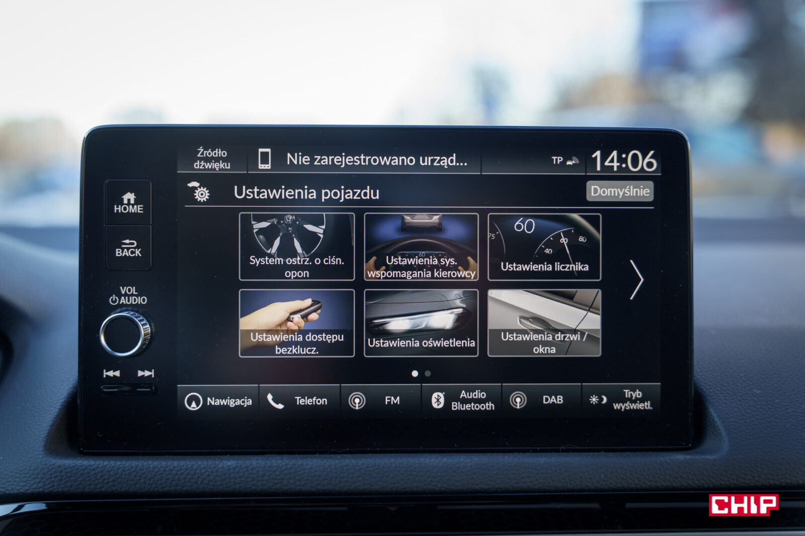 Ekran główny Hondy Civic ma przekątną 9 cali. Skromnie na tle 15-calowych lub nawet większych potworów, ale ze względu na to, jak jest wpasowany oraz cienkie ramki z trzech stron jest on optycznie większy, niż się wydaje. Pomaga w tym to, że interfejs jest czarny i nawet przy ekranie LCD to nieco zmniejsza ramki.