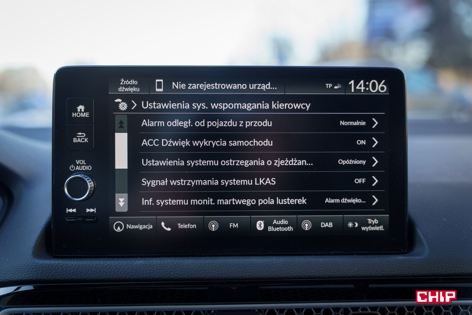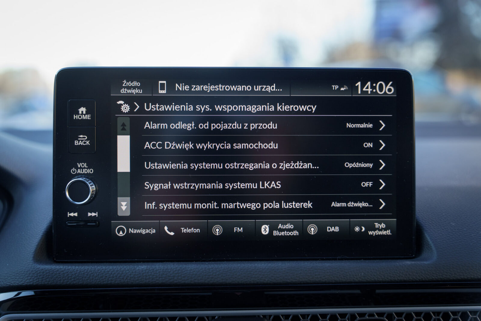 Interfejs jest bardzo prosty w obsłudze. Z kolorowego Menu głównego kieruje nas do bardzo prostych list z wyszczególnionymi opcjami. Wszystko fajnie, ale jedna z nich jest niedostępna podczas jazdy i są to ustawienia działania asystentów. Zwyczajnie przycisk jest wyszarzały, a uaktywnia się wyłącznie na biegu parkingowym. W efekcie, jeśli nie wyłączycie sobie przykładowo asystenta prędkości przed rozpoczęciem jazdy, bo bez zatrzymania auta nic z tym już nie zrobicie. Co by nie mówić – głupi pomysł.