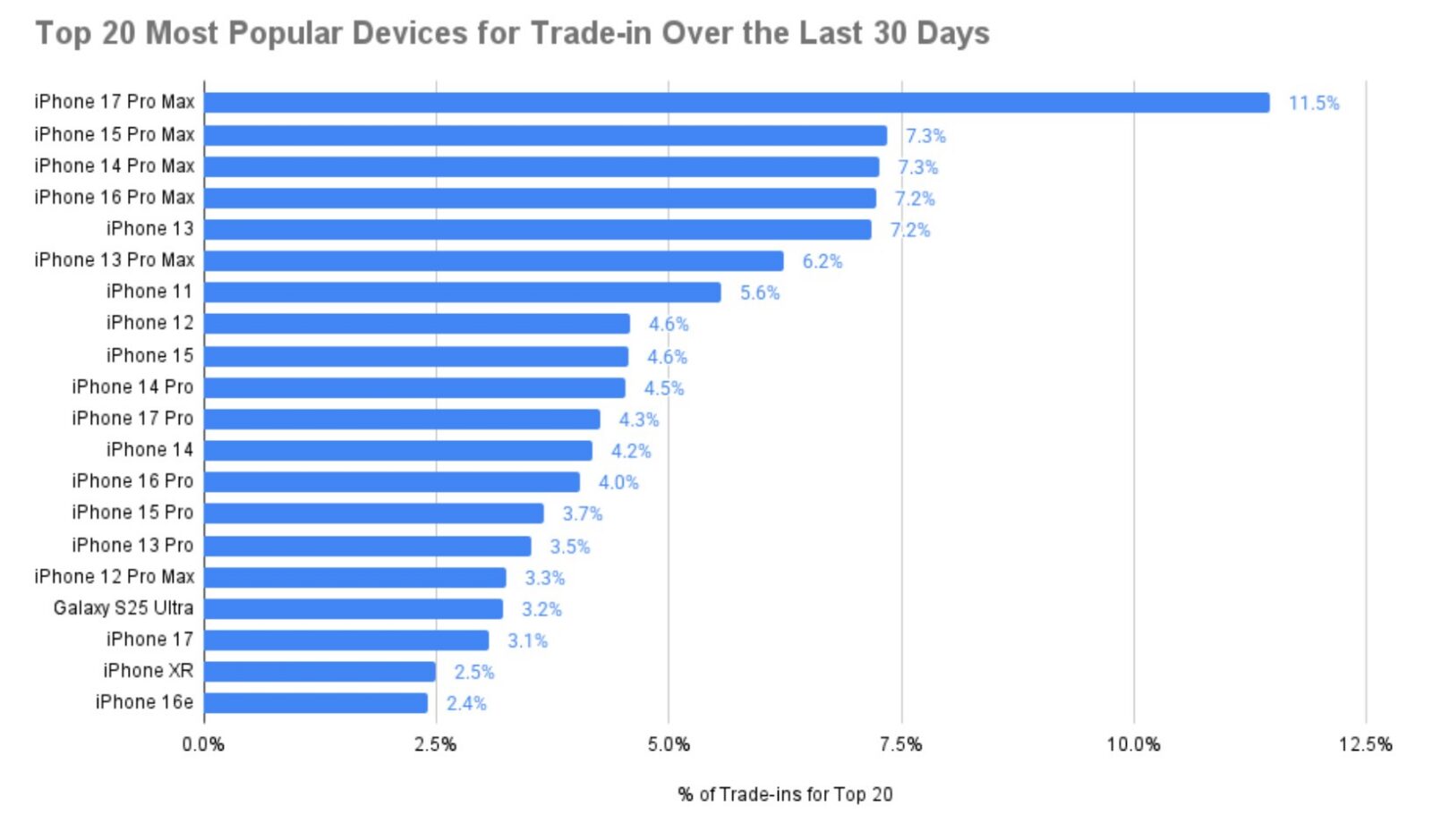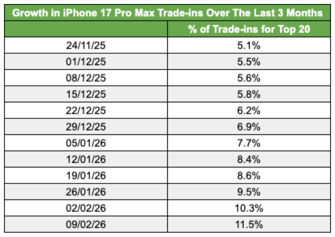 Zazwyczaj rankingi odsprzedaży są zdominowane przez starsze modele, których właściciele wymieniają je po dwóch lub trzech latach użytkowania. Tymczasem iPhone 17 Pro Max stanowi obecnie aż 11,5% wszystkich urządzeń oddawanych do skupu (w rankingu Top-20). Dla porównania, jego udział w odsprzedaży w listopadzie wynosił zaledwie 5,1% – w ciągu 12 tygodni zainteresowanie pozbyciem się tego modelu wzrosło więc ponad dwukrotnie.