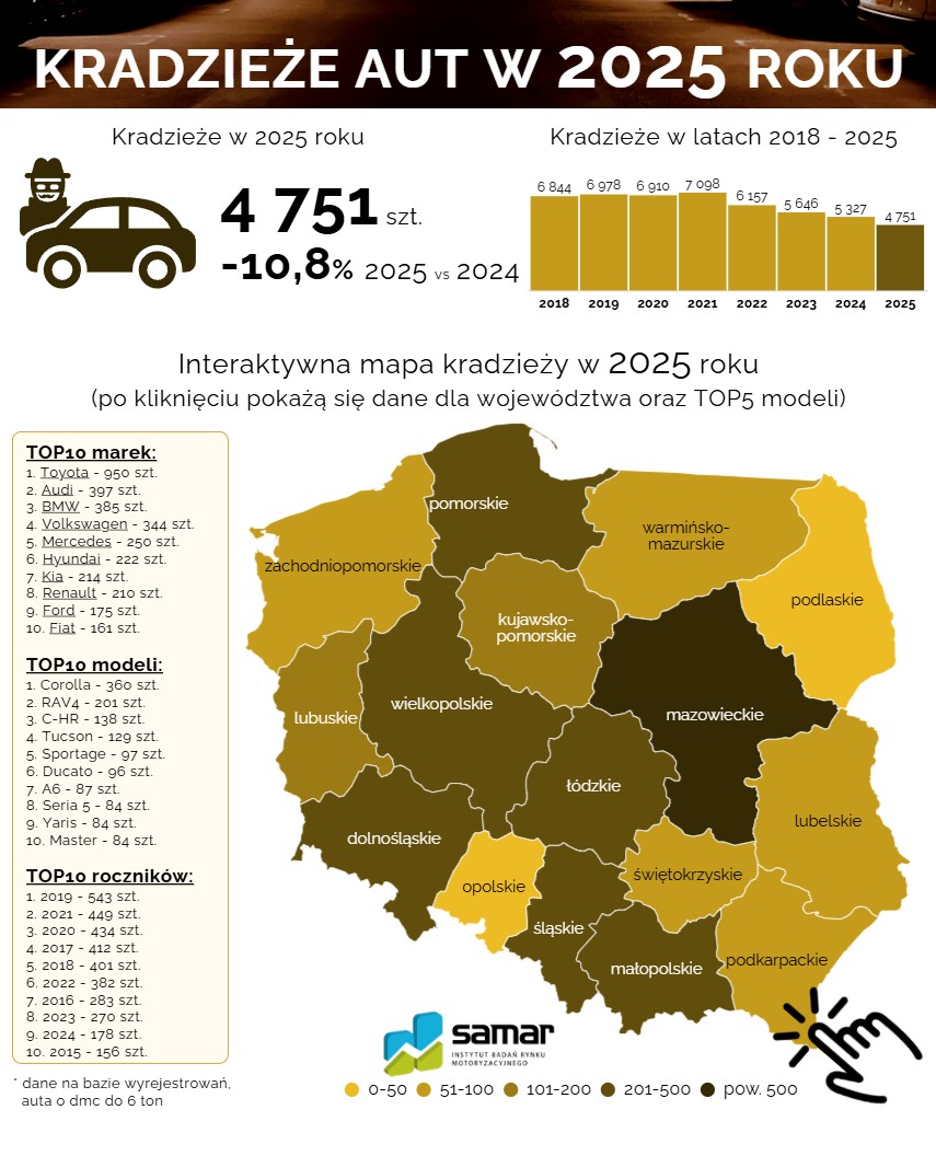 Według najnowszych danych IBRM Samar, opartych na bazach CEPiK, liczba aut wyrejestrowanych z powodu kradzieży w 2025 roku spadła do rekordowo niskiego poziomu 4 751 sztuk. To o blisko 11% mniej niż rok wcześniej i zaledwie promil w morzu 23,5 miliona pojazdów poruszających się po naszych drogach. Choć statystyki policyjne mogą się nieco różnić ze względu na moment wpisu do bazy, trend jest jasny: kradzieże aut systematycznie maleją od czterech lat, osiągając najniższy wynik od 2018 roku.