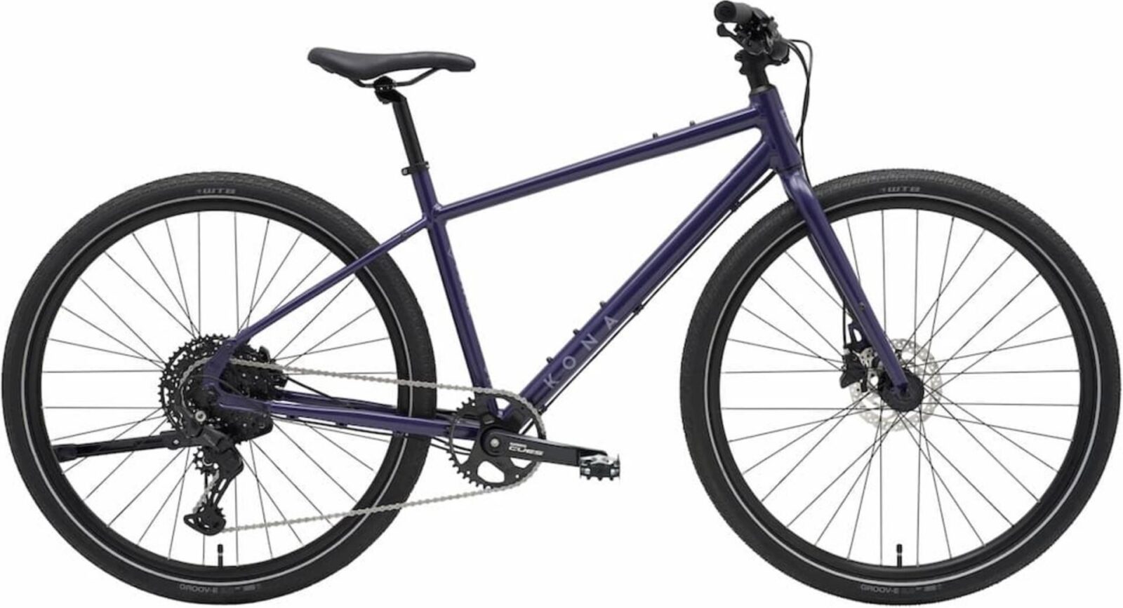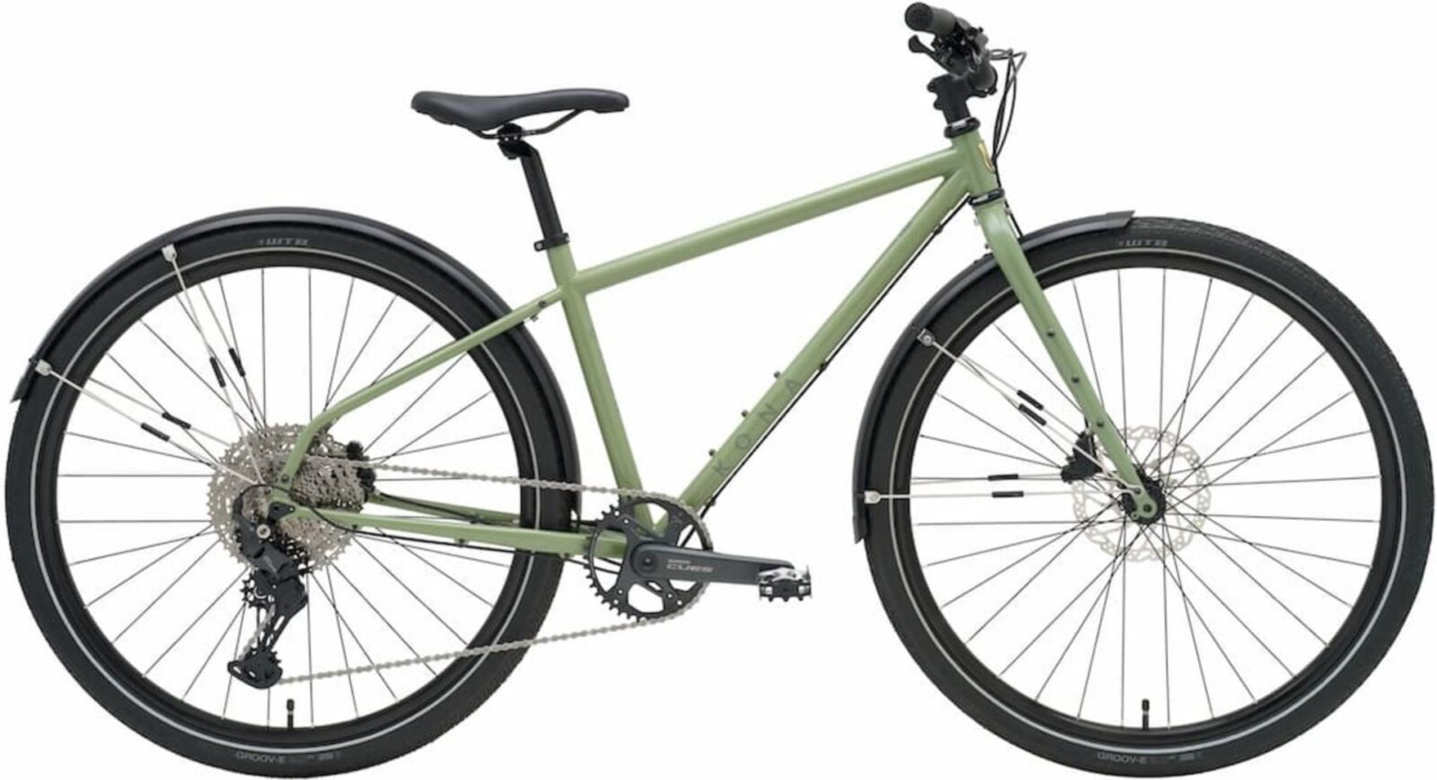 Najciekawiej w tej rodzinie wypada Dr. Dew, bo Kona zrobiła tu ruch, który może się spodobać wielu osobom zmęczonym jednorodnym światem aluminiowych ram. Dr. Dew ma stalową ramę, błotniki i charakter bardziej klasycznego roweru, a dodatkowo zewnętrzne miski sterów, które wizualnie mocno podbijają “stalowy klimat”. Jednocześnie Kona nie robi z niego oldschoolowego eksponatu, bo geometria jest taka sama jak w aluminiowych odpowiednikach, a napęd to 11-biegowy Shimano Cues, a z przodu i z tyłu pojawiają się sztywne osie 12 mm, czego w tej klasie wielu użytkowników wciąż szuka ze względu na sztywniejsze, pewniejsze prowadzenie. Hamulce pozostają takie jak w Dew DL, czyli Shimano Altus, co tyczy się również opon. Jedno z pytań, które warto sobie tutaj postawić, dotyczy masy całego roweru, bo w dostępnym opisie nie ma wagi. Przy stalowej ramie i miejskim przeznaczeniu to może mieć ogromne znaczenie.