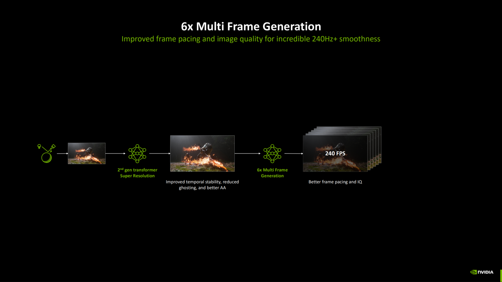Poza wyższą jakością obrazu DLSS 4.5 zapewni graczom jeszcze jeden ważny element – Dynamic Multi Frame Generation do skutecznego utrzymywania docelowej płynności oraz tryb 6X, który ma generować nawet pięć dodatkowych klatek na jedną klatkę “normalnie” renderowaną. Aktualnie jednak NVIDIA podchodzi z rezerwą do tych dodatków, obiecując ich wprowadzanie dopiero wiosną bieżącego roku (ponoć już w kwietniu). Niestety te funkcje będą ograniczone wyłącznie dla właścicieli kart graficznych z serii GeForce RTX 5000.