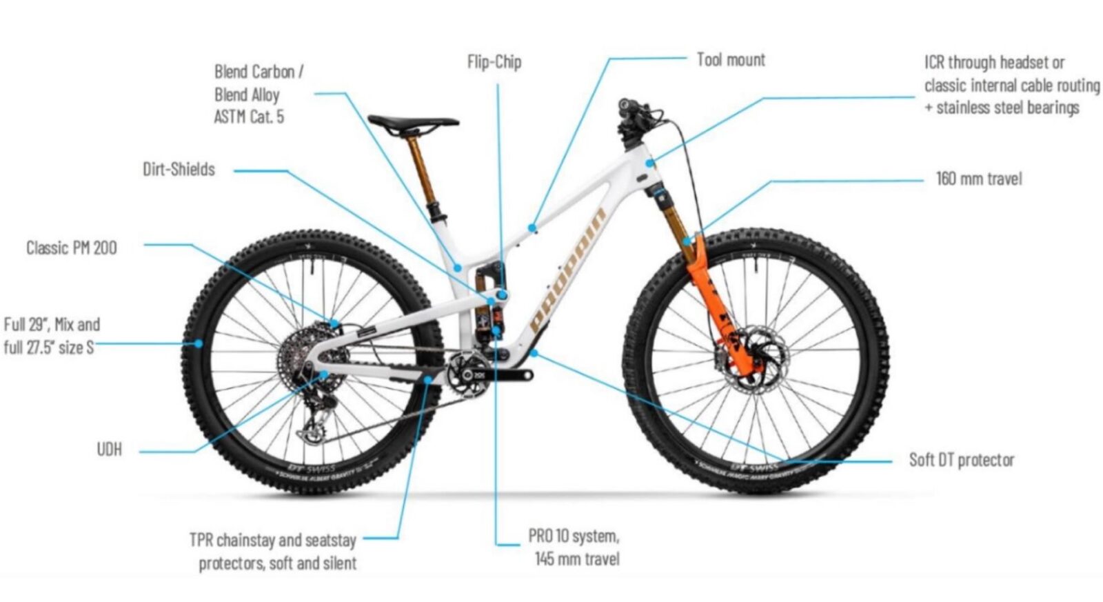Od strony technicznej TYEE Trail opiera się na znanym układzie zawieszenia PRO10. Propain podkreśla układ dual-link z “floating shock”, czyli damperem montowanym w układzie pływającym i deklaruje dobrą czułość na małe nierówności przy zachowaniu trakcji oraz podparcia w trudniejszym terenie. Możecie też liczyć na standard UDH, tylną oś 12×148 mm Boost, suport BSA 73 mm, mocowanie ISCG05 i deklarowany maksymalny systemowy limit masy na poziomie 120 kg. Propain podaje też, że rama przyjmuje maksymalnie widelec o skoku 170 mm, więc zostawia użytkownikowi trochę marginesu na zmianę charakteru roweru.