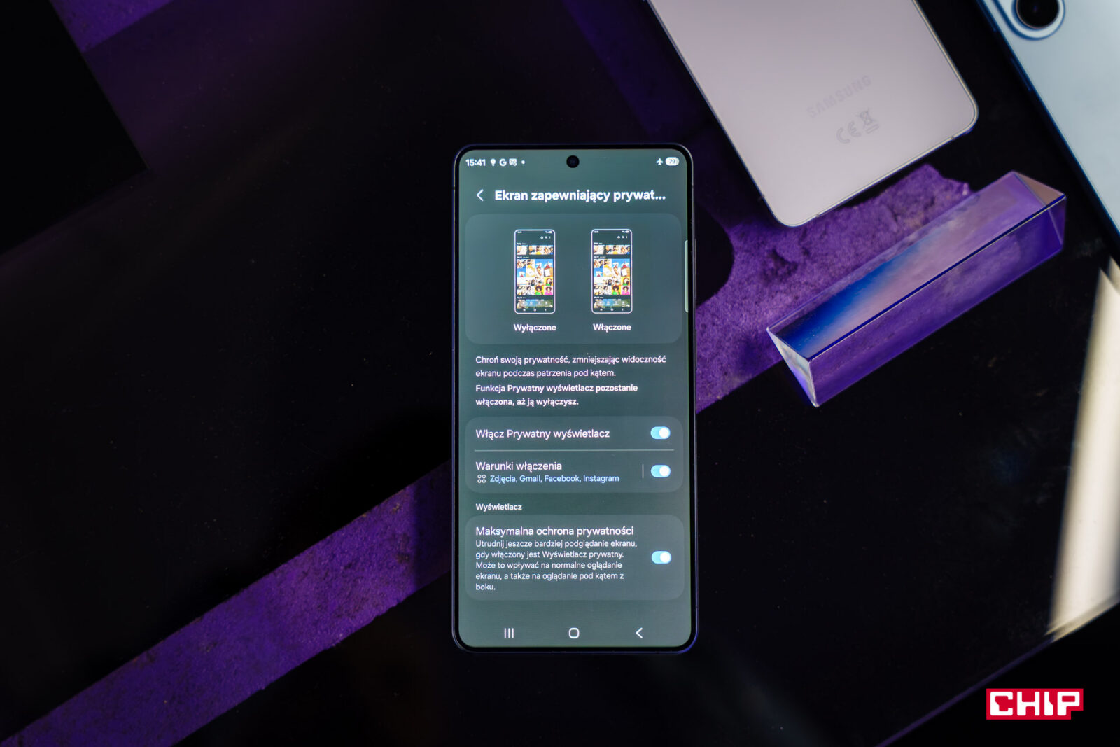 Funkcję możemy włączyć ręcznie lub automatycznie. Ręcznie robimy to skrótem na rozwijanej z góry belki i to pozwala na stałe włączenie prywatyzacji. Wystarczy spojrzeć na ekran pod lekkim kątem i zobaczymy na nim co najwyżej odciski palców. Nie odbywa się to bez utraty jakości, bo nawet patrząc na wprost ekran w tym momencie wygląda zwyczajnie dziwnie. Gdzieś ewidentnie ucieka mu nieco jakości.