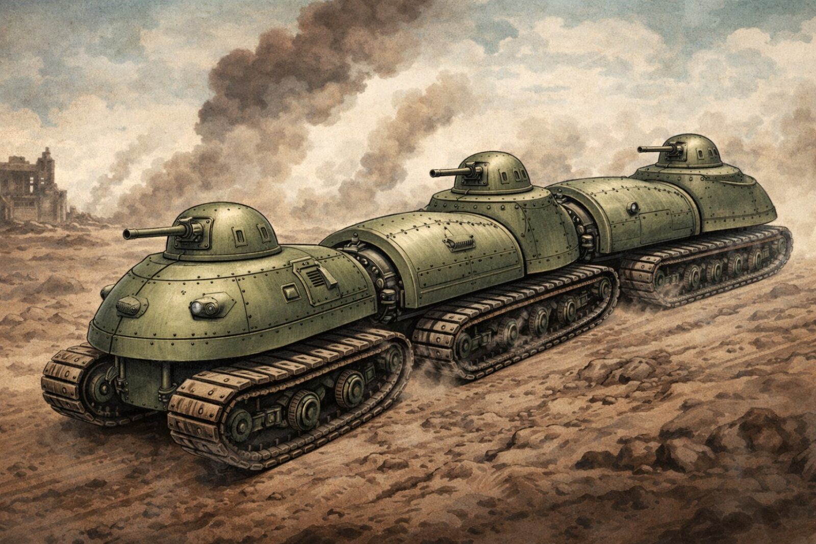 Wyobraźcie sobie machinę z trzech połączonych części, sunącą przez pole bitwy niczym stalowa stonoga. Taką właśnie wizję miał francuski inżynier Victor-Barthélemy Jacquet, który pod koniec II wojny światowej stworzył projekt jednego z najbardziej osobliwych pojazdów pancernych. Train d’Assaut pozostał jedynie na papierze, ale sama koncepcja sięgała daleko w przyszłość, wyprzedzając swoją epokę o dziesięciolecia. Powstał zresztą w czasie, gdy Francja wracała do życia po okupacji, a wojskowi rozważali nowe kierunki rozwoju broni pancernej. Jacquet, prawdopodobnie na bazie doświadczeń I wojny światowej, chciał rozwiązać problemy trapiące ówczesne czołgi, a więc głównie słabą mobilność w trudnym terenie. Jego pomysł był tak odważny, że aby go zrealizować, potrzebne byłyby technologie, które pojawiły się znacznie później.