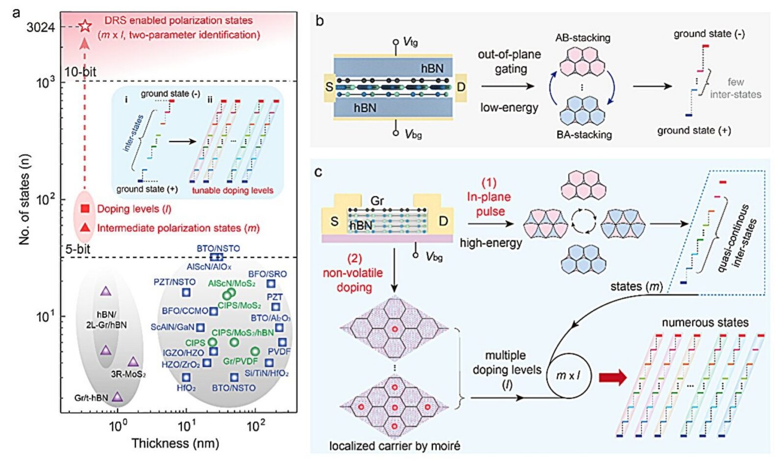 W ostatnich latach mocno wybrzmiała inna ścieżka, bo to, że ferrolektryczność niekoniecznie musi pochodzić z klasycznego kryształu ferroelektrycznego. Można ją “zaprojektować” przez ułożenie i minimalne przesunięcia ultracienkich warstw van der Waalsa. Dla heksagonalnego azotku boru (hBN) już wykazano, że odpowiednie połączenie dwóch warstw potrafi wytworzyć polaryzację przełączalną napięciem i widoczną w pomiarach transportowych i to także w temperaturze pokojowej.