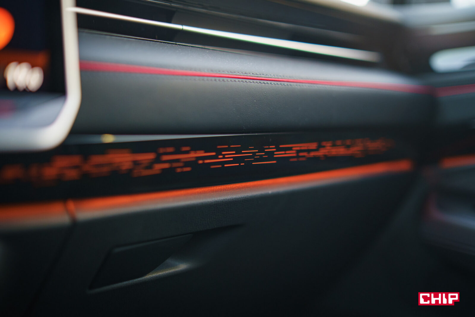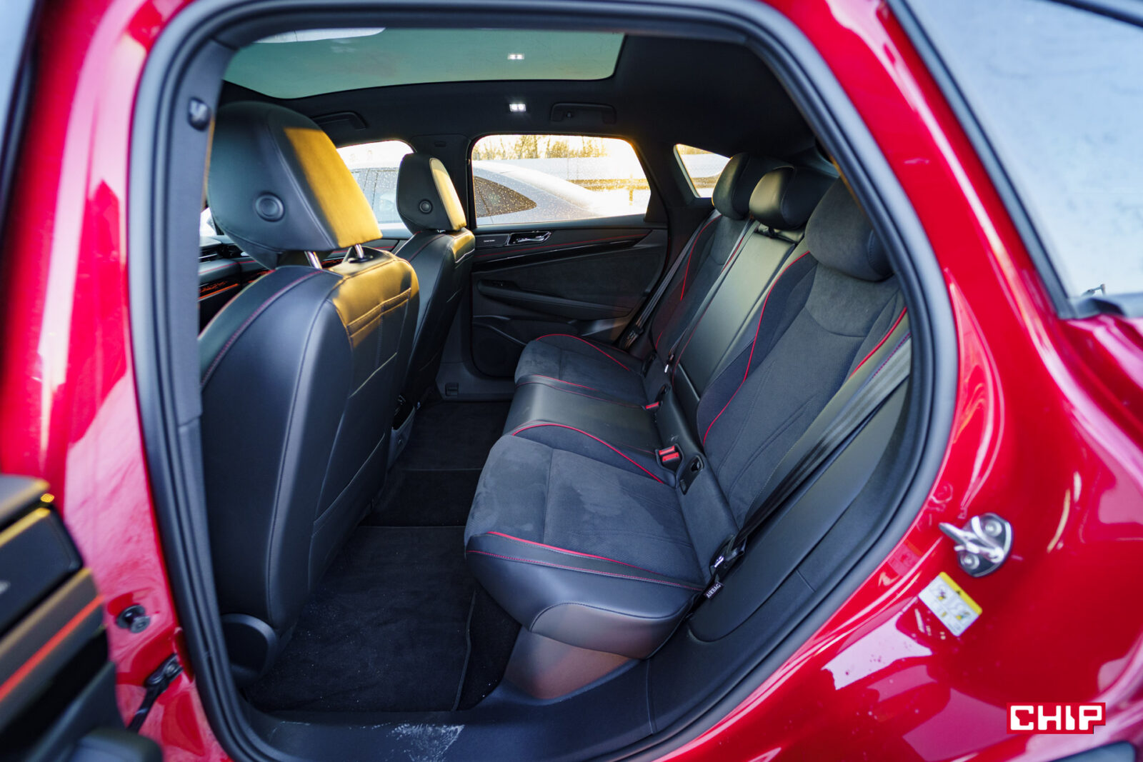 Wnętrze jest bardzo dobrze wykonane. Dominują tu przyjemne w dotyku, miękkie materiały (mikrofibra), które przeplatają się ze skórą. Czerwone akcenty podkreślają usportowiony charakter wersji GTX, a uzupełnia jest nietypowo zaprojektowane podświetlenie wtopione w plastikowe listwy na drzwiach i konsoli środkowej. W parze z dobrym wykonaniem idzie też dobre nagłośnienie Harman/Kardon oraz bardzo dobre wyciszenie wnętrza, co przekłada się na bardzo komfortowe doznania dźwiękowe podczas jazdy.