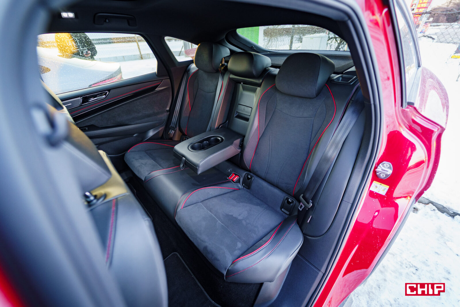 Nie mniej komfortowo jest na tylnej kanapie. Przestrzeni na nogi jest bardzo dużo, nie brakuje go też nad głową. Kanapa jest dosyć mocno odchylona i komfort podróżowania stoi tu na bardzo wysokim poziomie. Do dyspozycji mamy rozkładany podłokietnik z uchwytami na napoje, sterowanie klimatyzacją oraz porty USB-C.