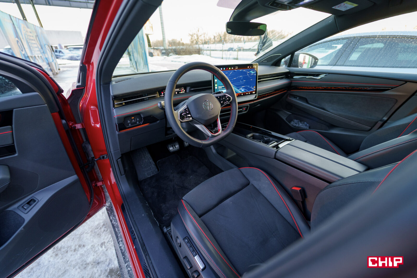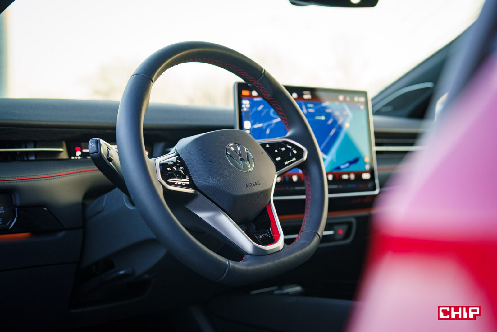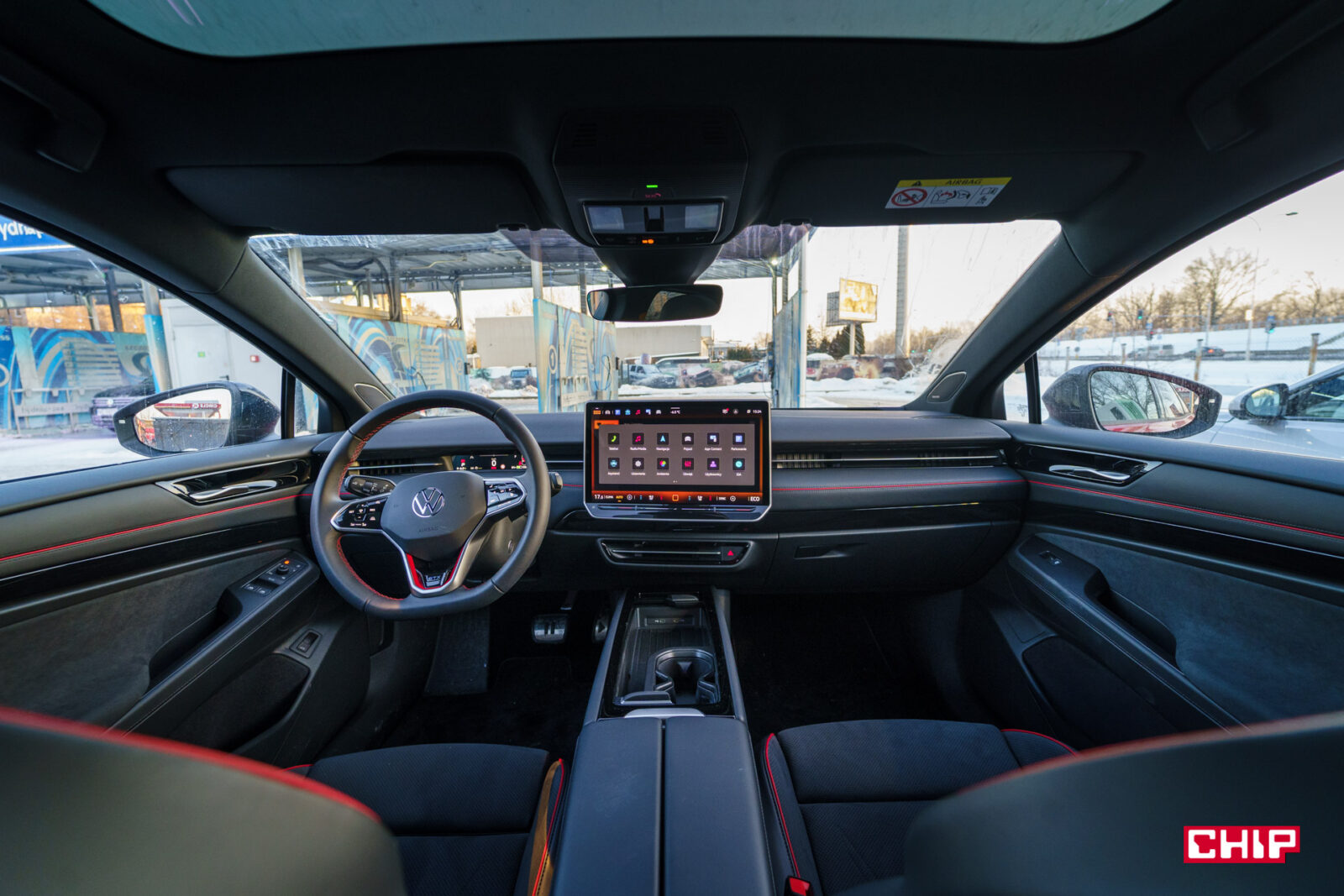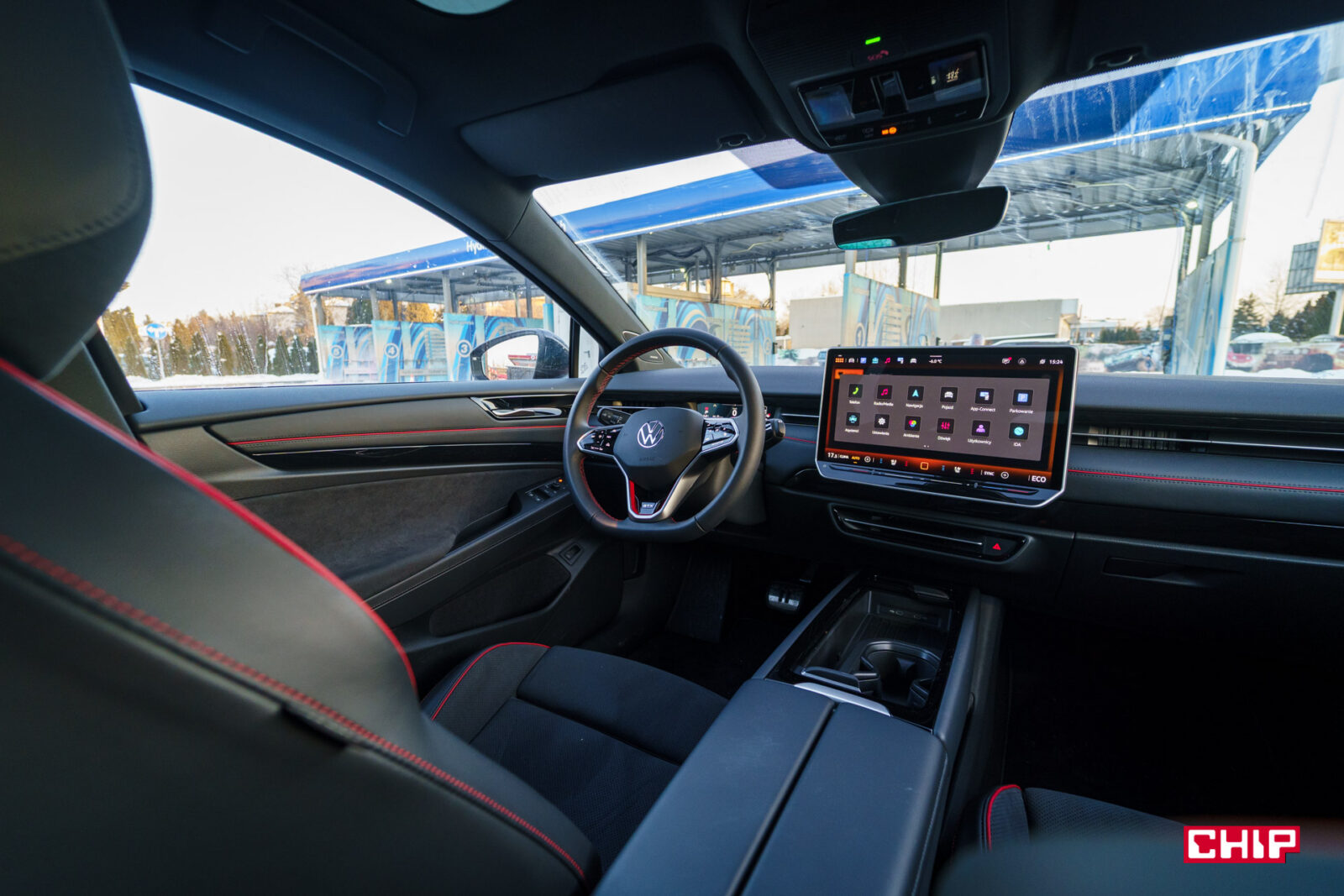 Pracą napędu zarządza VDM (Vehicle Dynamics Manager), który w uproszczeniu możemy nazwać mózgiem auta. Poza napędem, zarządza on również pracą układu zawieszenia, układem hamulcowym, kontrolą trakcji i innymi systemami (np. ESP). Zbiera dane, analizuje je i dostosowuje pracę układów tak, aby auto było w stanie nie tylko reagować na to, co się dzieje na drodze, ale również przewidywać trudności i im zapobiegać. W kontekście napędu oznacza to m.in. inteligentny rozkład momentu obrotowego, czy siły hamowania pomiędzy kołami, ale również możliwość natychmiastowego dołączenia przedniej osi. Napęd, chociaż niewątpliwie imponujący, nie jest jedynym elementem ID.7 GTX, który sprawił, że nieco opadła mi szczęka.