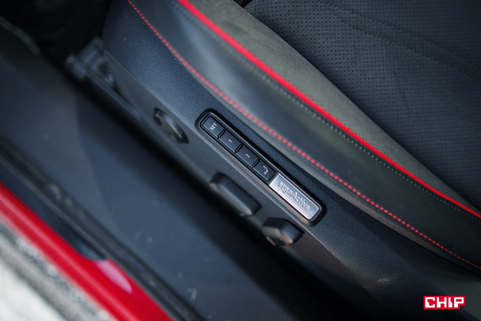 Przednie fotele, określane przez producenta jako ergoActive, mają usportowiony kształt z dosyć mocno wystającymi bokami, które solidnie trzymają podczas jazdy. Są to jednak zdecydowanie komfortowe fotele. Duże, miękkie, z elektryczną regulacją po stronie kierowcy i pasażera, idealne do pokonywania długich tras i współgrające z komfortowym zawieszeniem.