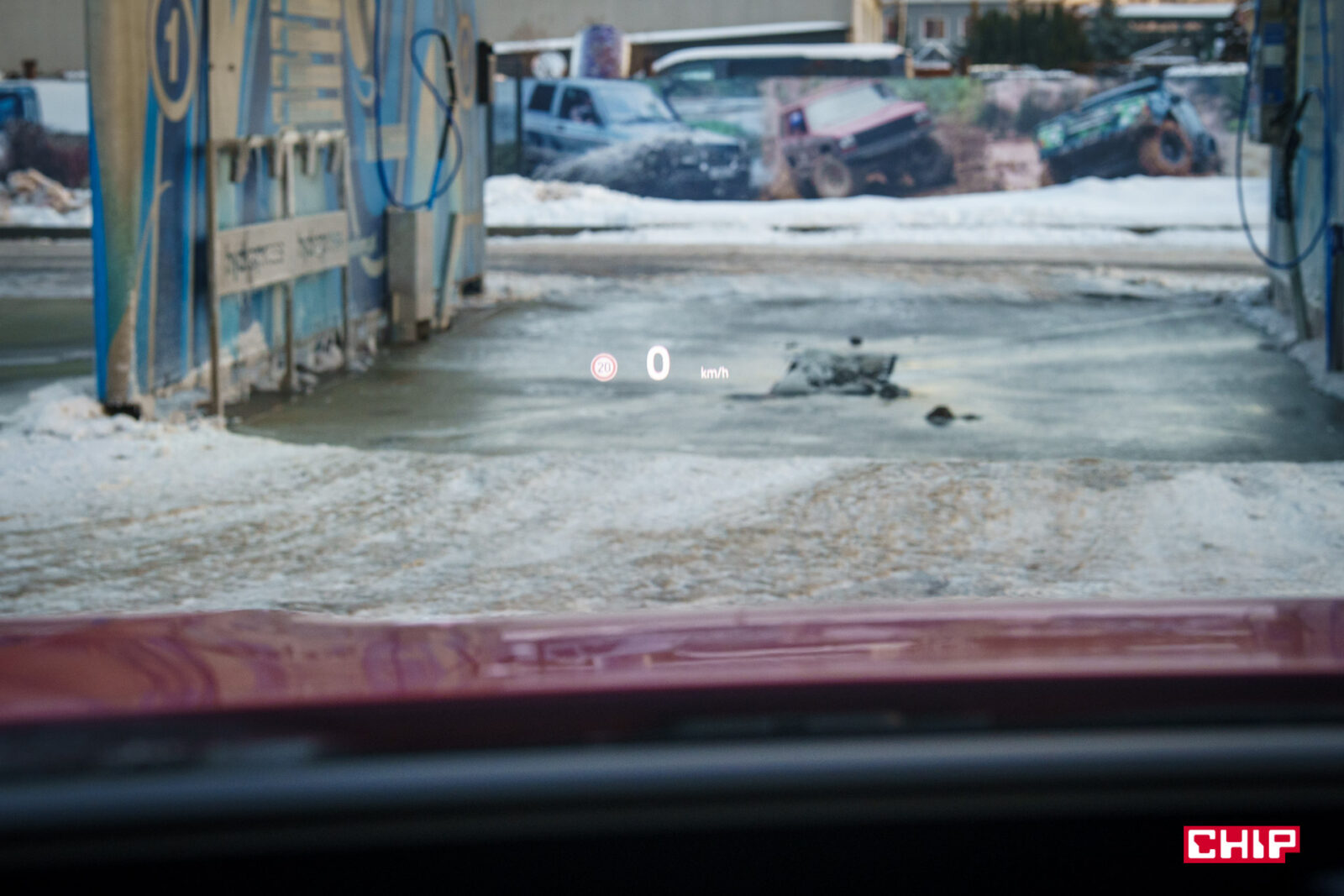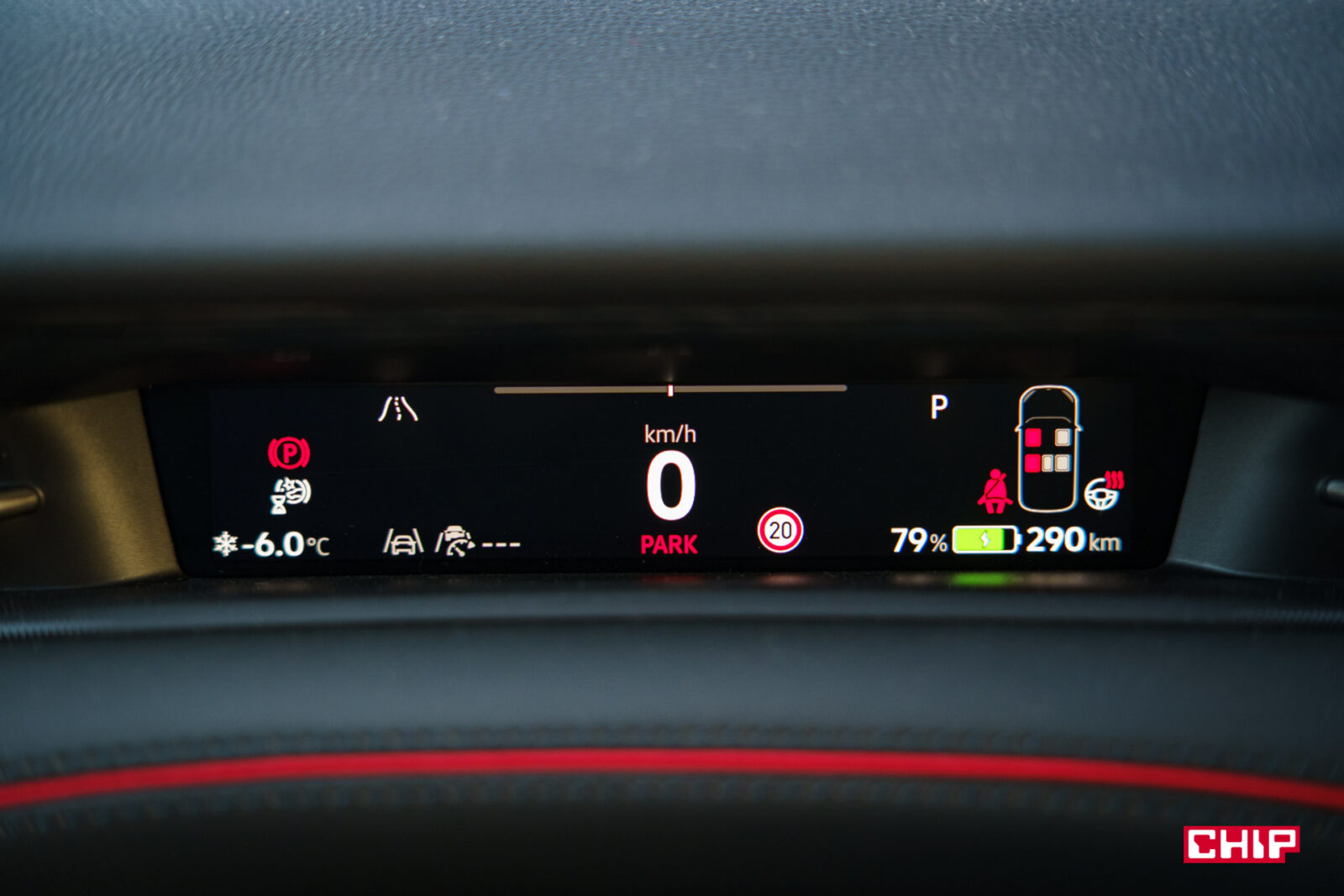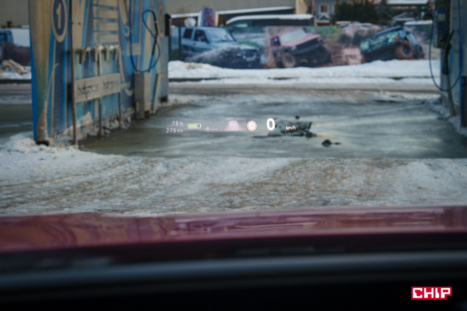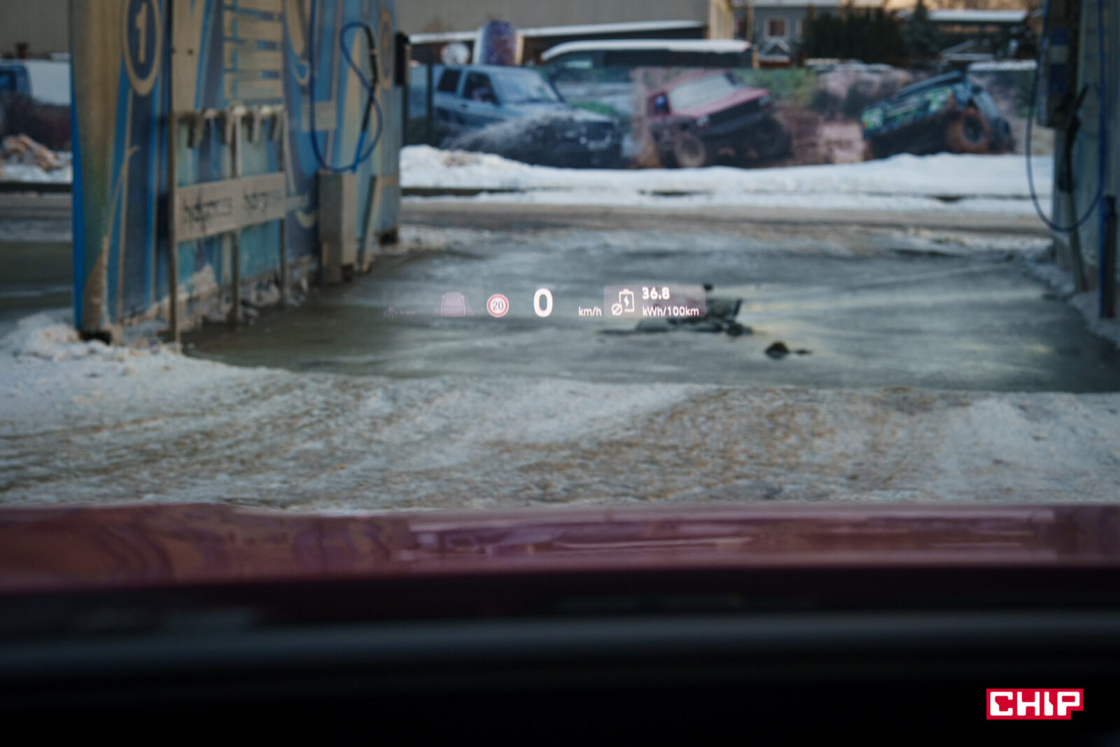 Podobnie jak ekran kierowcy we wspomnianych modelach, został on podzielony na cztery sekcje, przy czym na ekranie możemy wyświetlać maksymalnie trzy. Od lewej jest to – zasięgi i stan baterii, grafika pokazująca stan działania asystentów jazdy, prędkość oraz średnie zużycie. Przesuwając się na boki przyciskami na kierownicy (oczywiście że dotykowymi, z dobrze wyczuwalną haptyką) możemy wyświetlić trzy sekcje od lewej lub prawej, albo samą prędkość. Wszystko to uzupełniają duże wskazówki nawigacji wyświetlane na head-upie w formie wirtualnej rzeczywistości. Razem tworzy to nietypową, ale ładną i co najważniejsze intuicyjną całość.