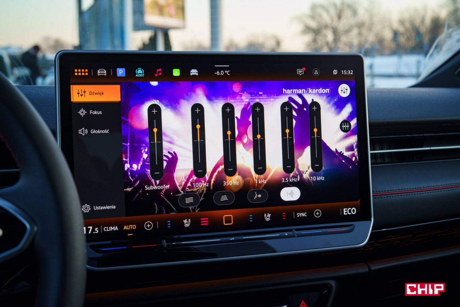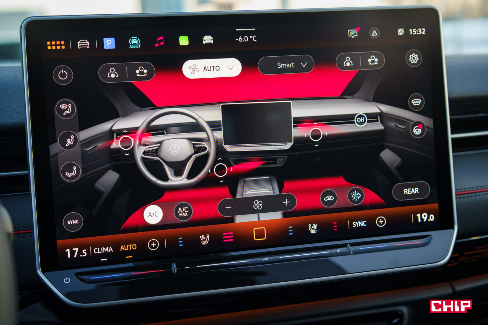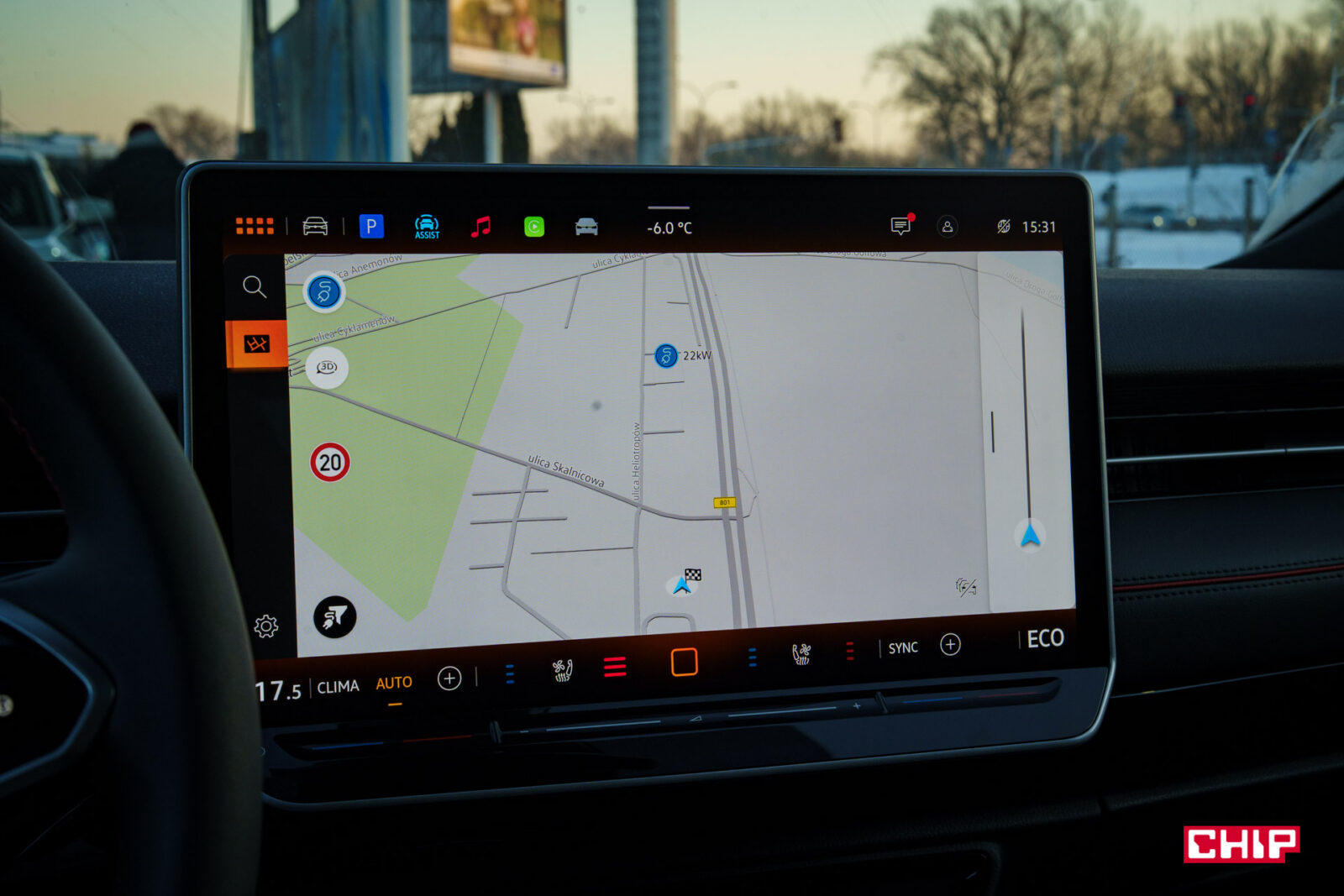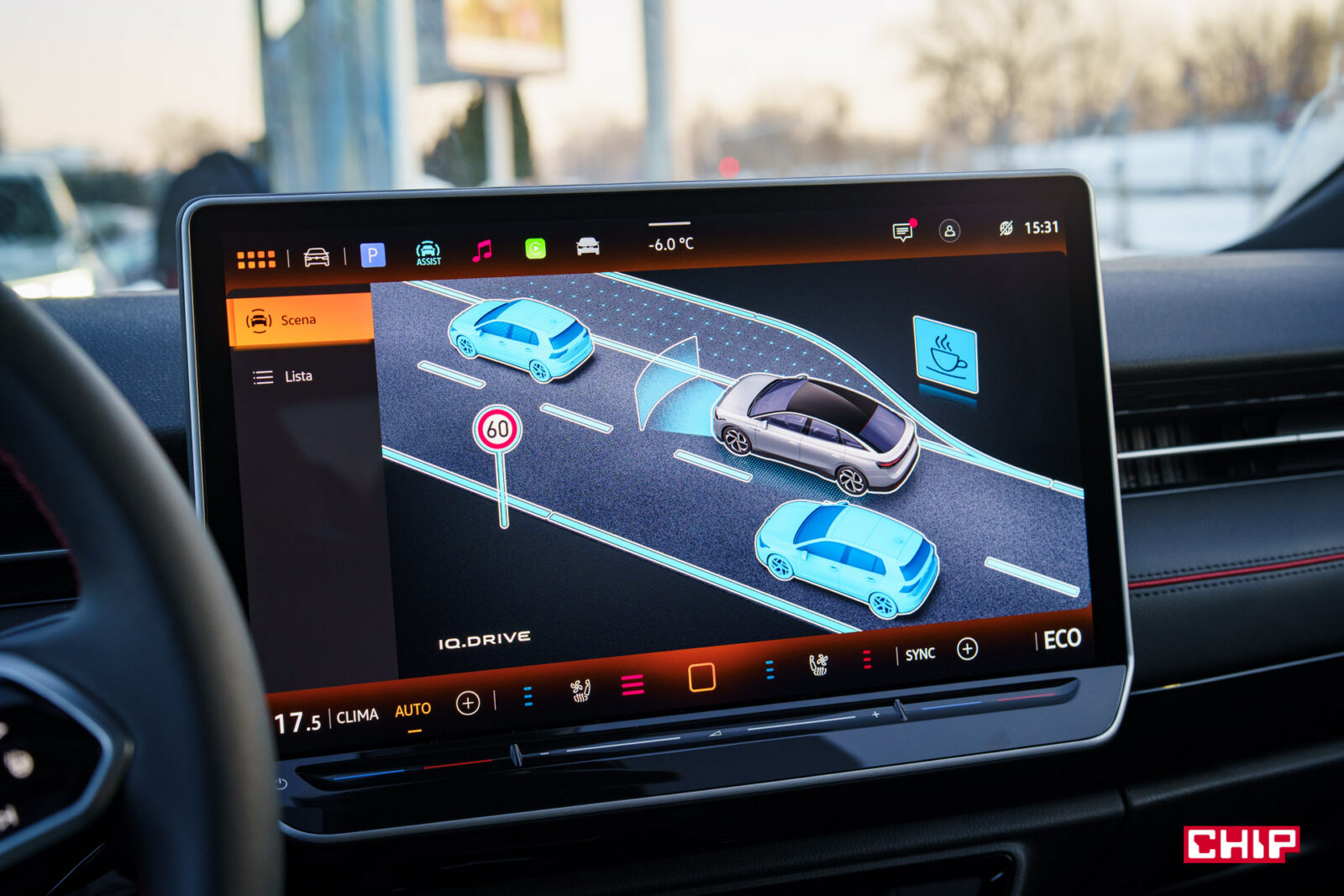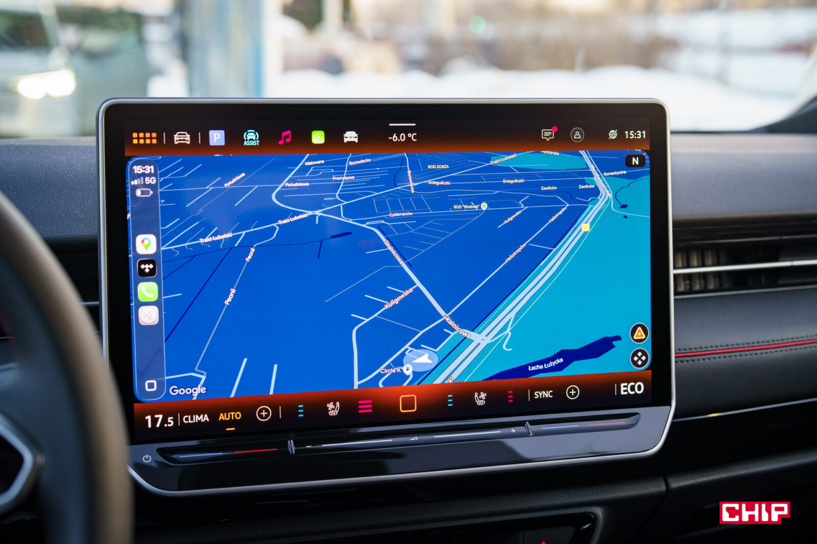 Ekran główny ma typowe dla producenta proporcje i jest lekko odchylony w kierunku kierowcy. Bardzo duży, bo o przekątnej aż 15 cali, jasny, z przyjemnym dla oka, minimalistycznym, ale mocno kolorowym interfejsem. Po problemach z jego działaniem, z czym borykały się modele ID tuż po premierze, nie ma już śladu. Wszystko działa bez zarzutów, podobnie jak bezprzewodowy Apple CarPlay czy Android Auto.