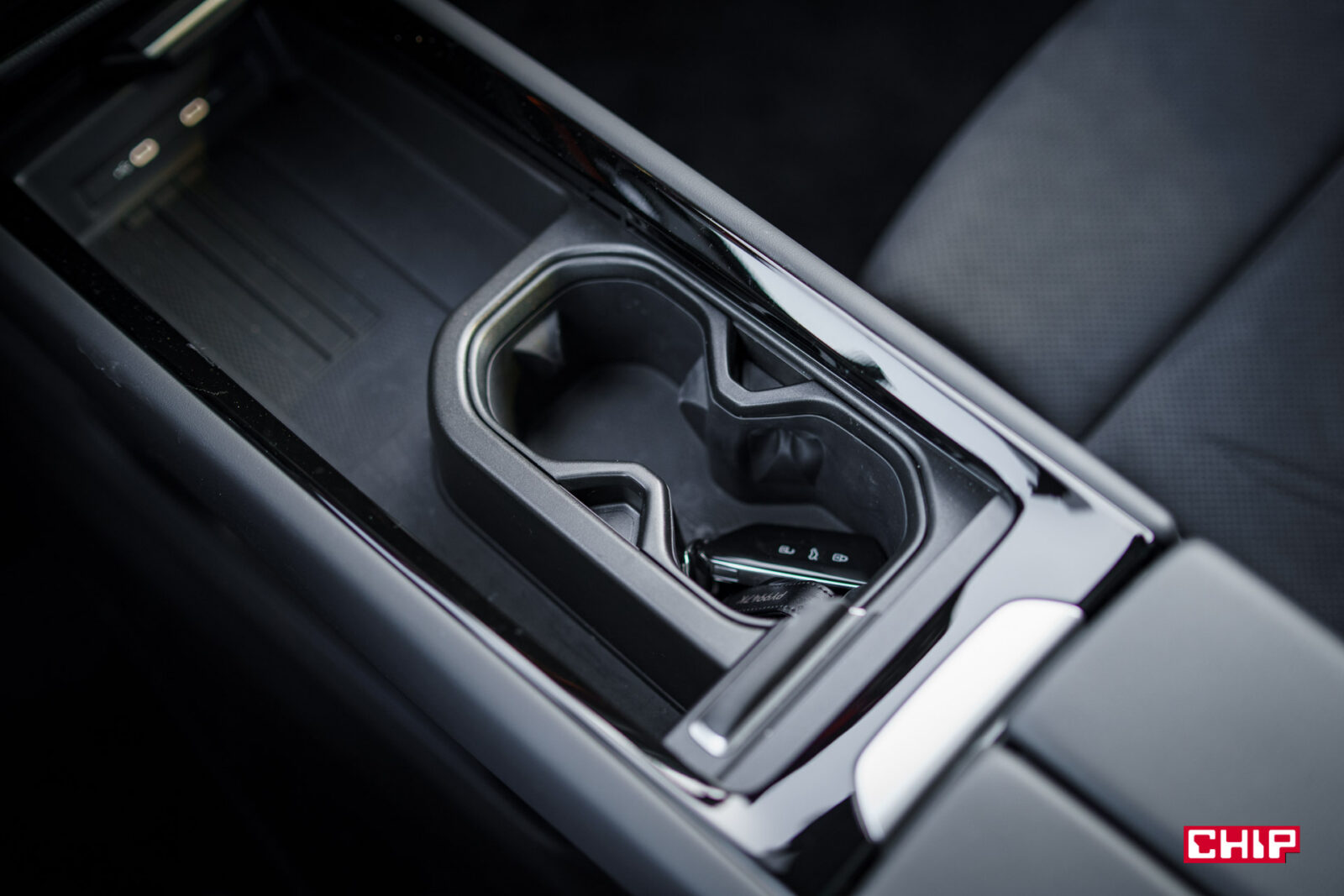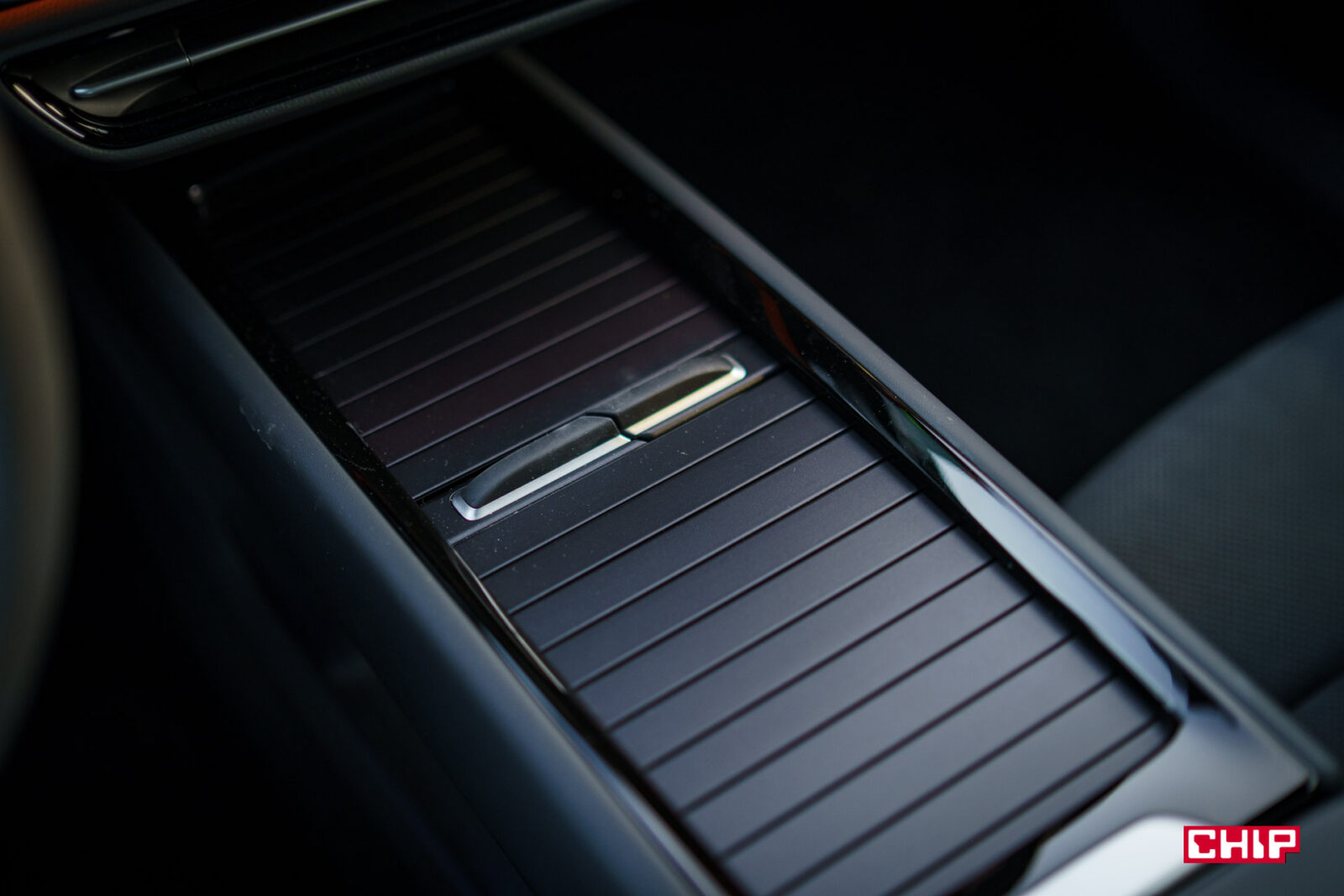 Ten może być zamykany plastikowymi zasuwami i tu zaskoczenie, bo są one matowe. Brawo! Pod spodem znajdują się uchwyty na napoje, ładowarka indukcyjna i porty USB-C. Capholder można łatwo wyjąć, na wypadek, gdyby ktoś potrzebował większej przegródki na… cokolwiek.