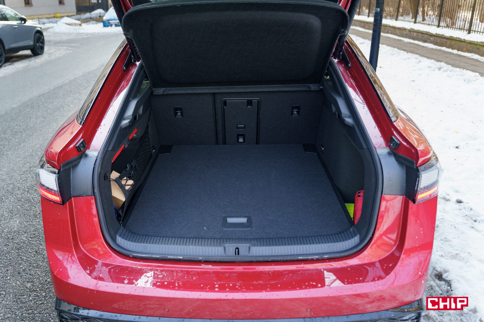 Przestronnie w ID.7 jest nie tylko wewnątrz auta, ale i w bagażniku. Pojemność 532 litry to bardzo solidny wynik. Bagażnik ma regularne kształty, klapa unosi się bardzo wysoko, więc nie ma najmniejszych problemów z załadowaniem większego bagażu. Bagażnik jest też dosyć głęboki jak na typ nadwozia. Przewidziano też miejsca na przewody do ładowania pod podłogą.